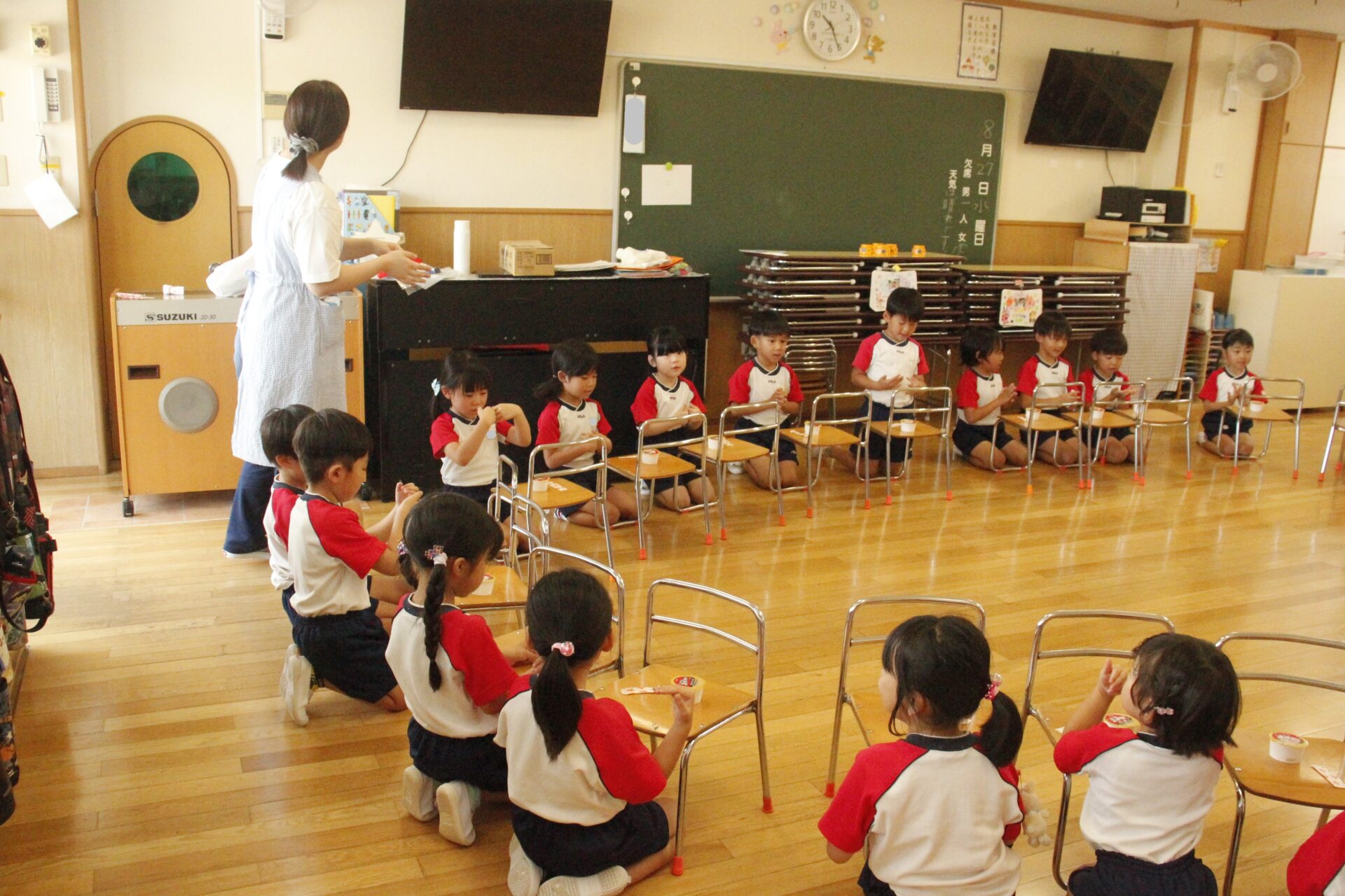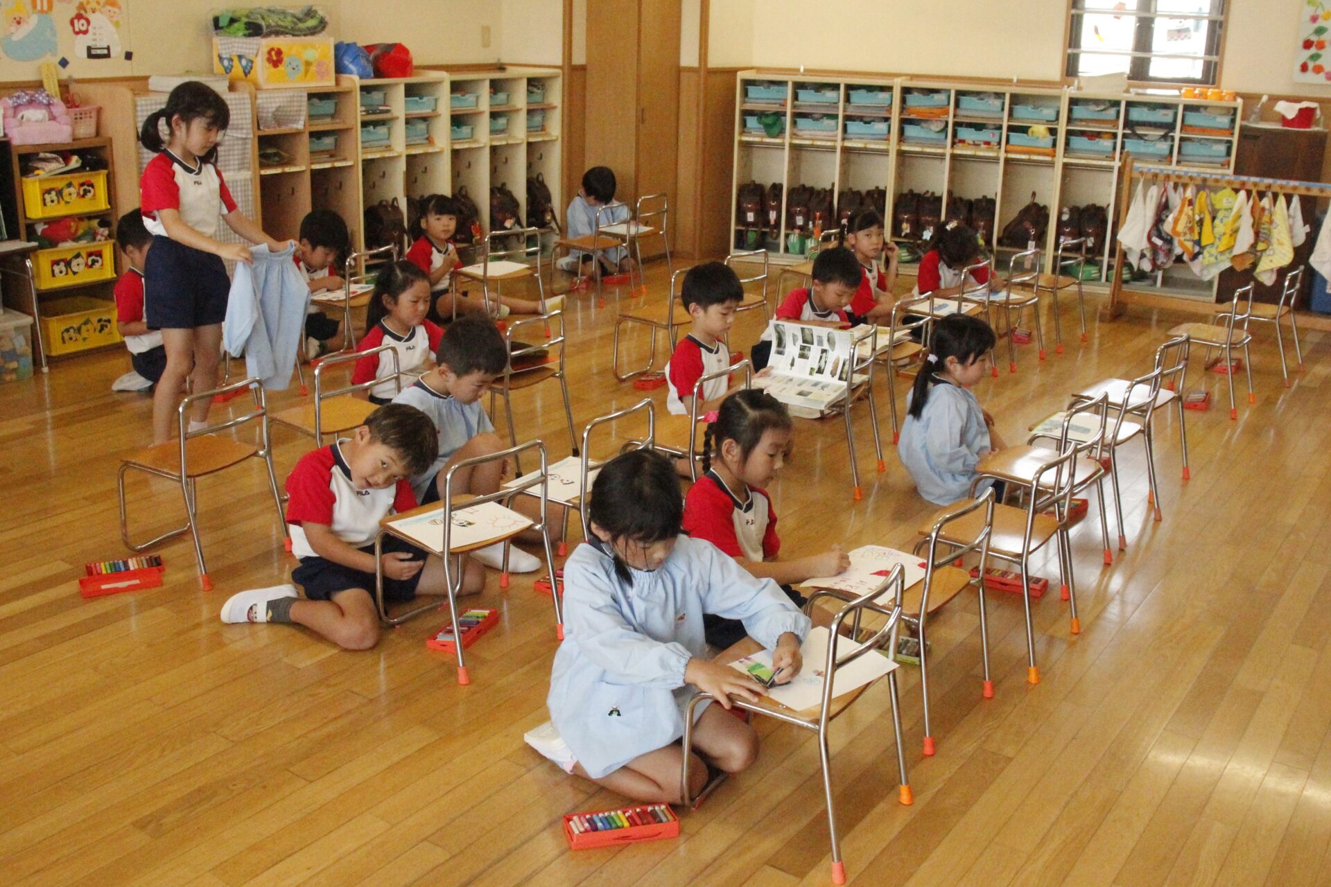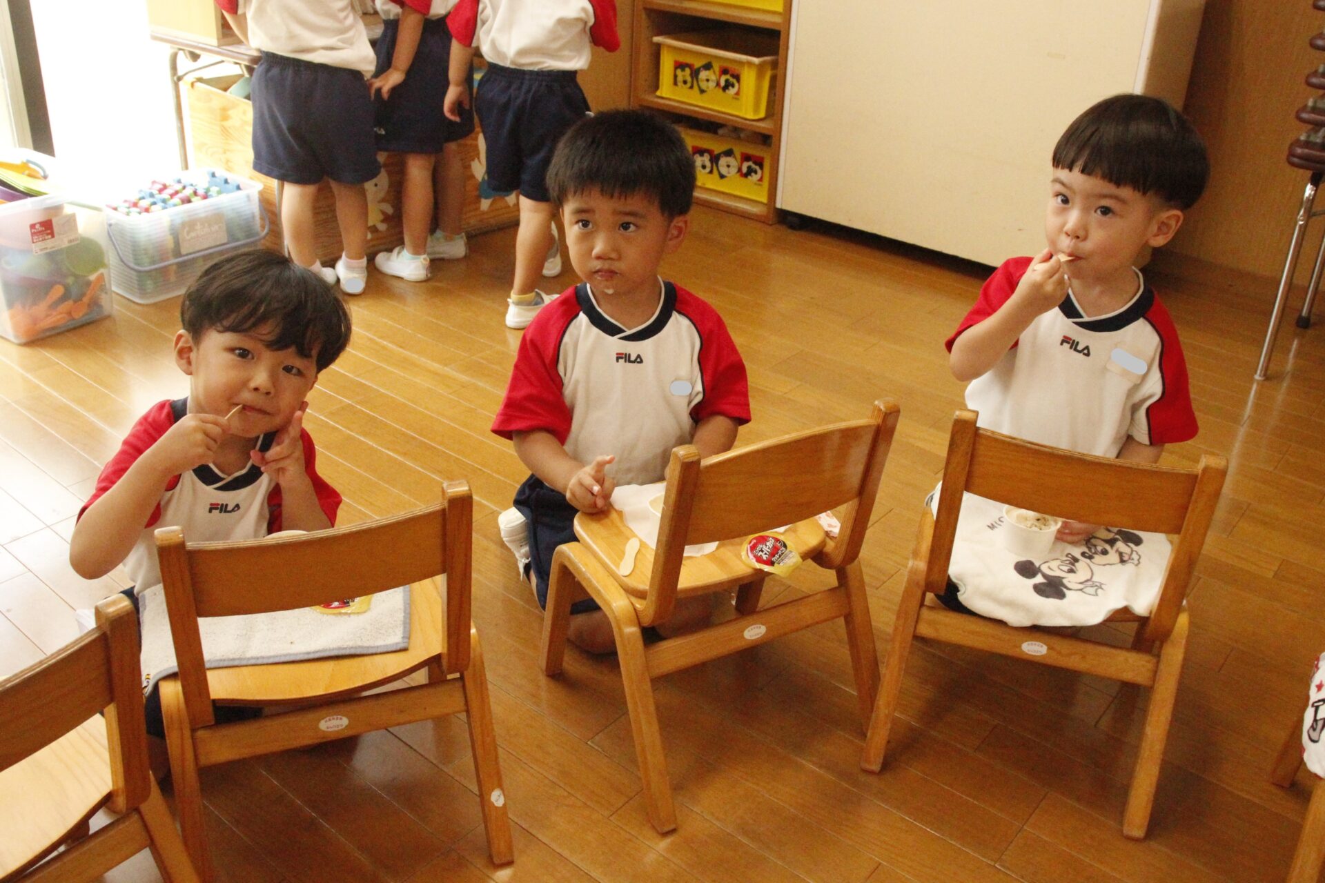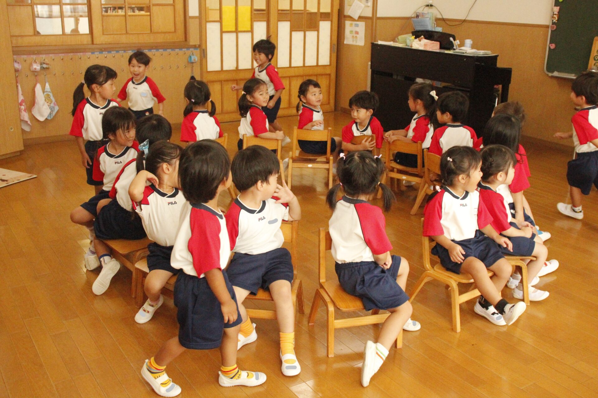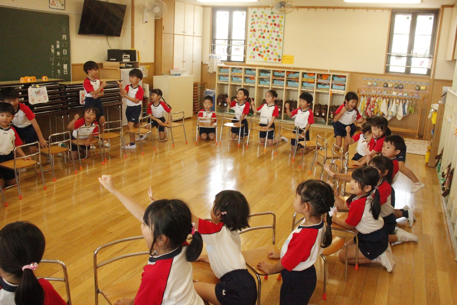 先生やお友達と夏休みの思い出話をしたり、夏の思い出を絵に描いたり、クラス皆で椅子取りゲームをして遊んだりして各クラスで過ごしました。