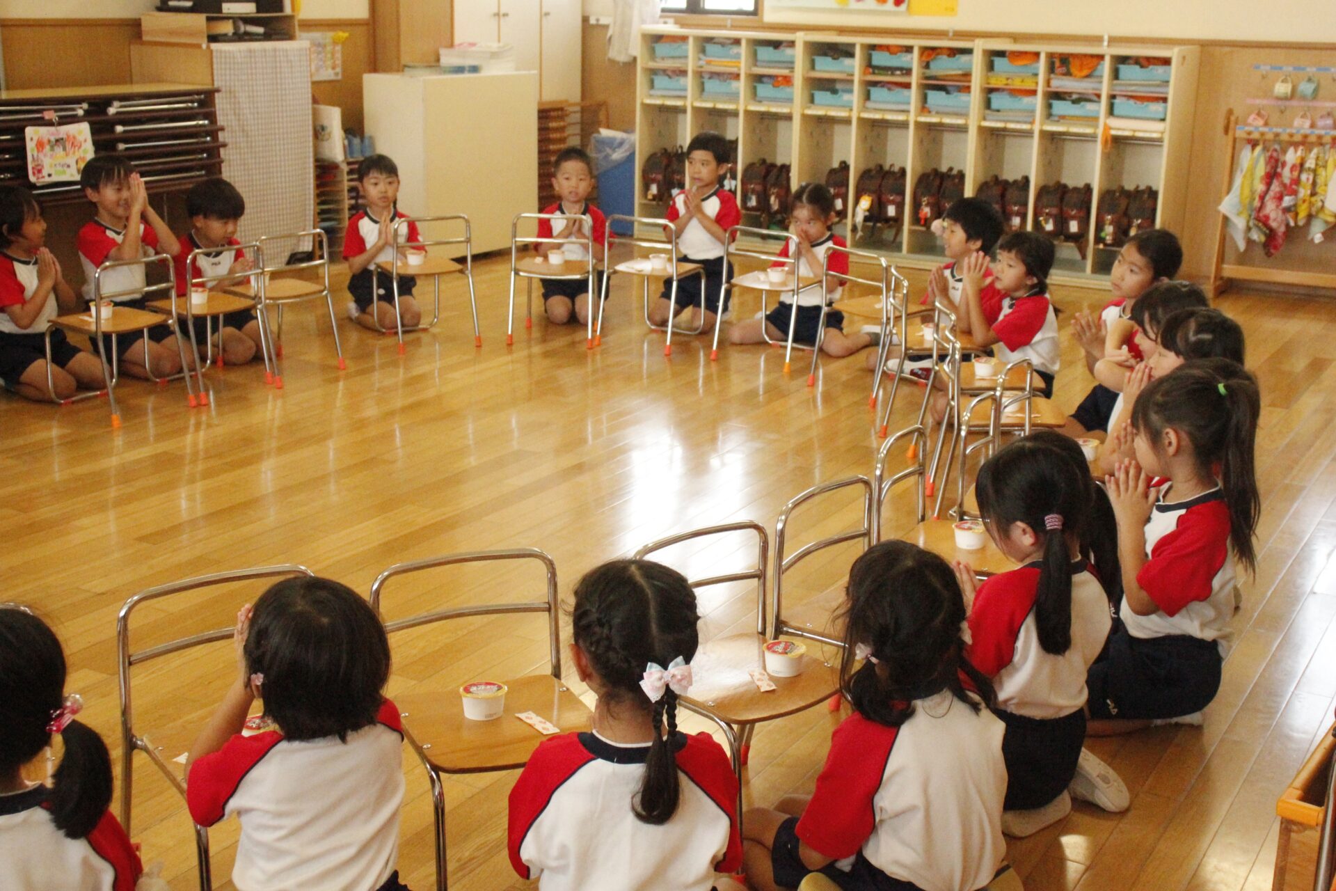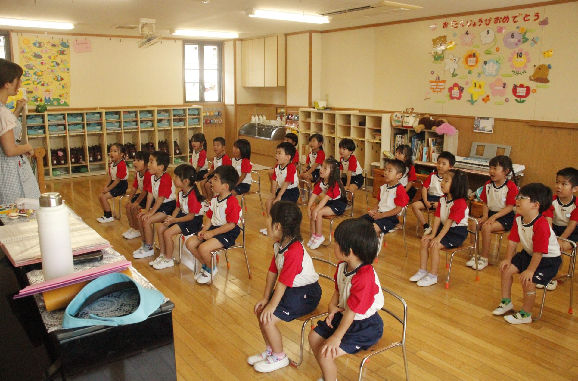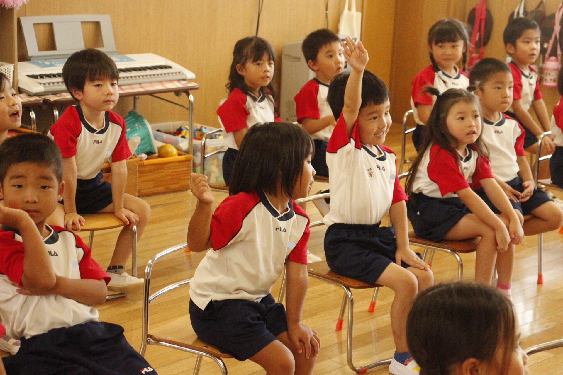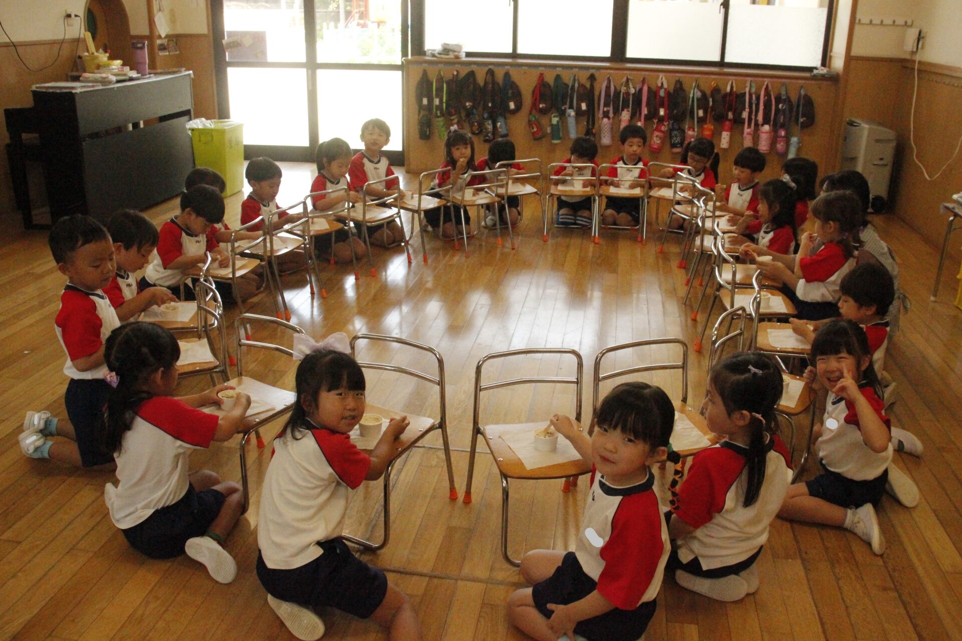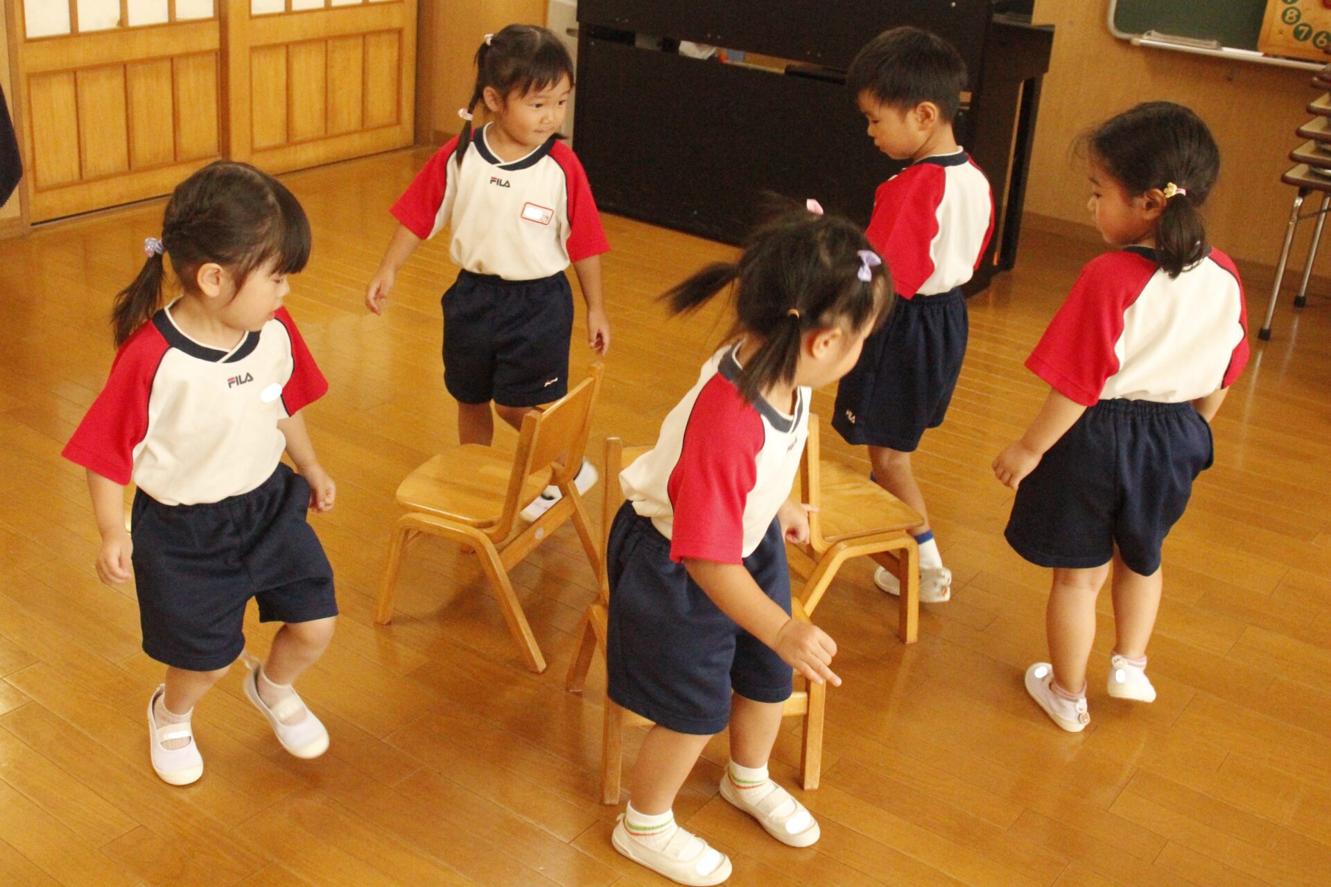 先生やお友達と夏休みの思い出話をしたり、夏の思い出を絵に描いたり、クラス皆で椅子取りゲームをして遊んだりして各クラスで過ごしました。