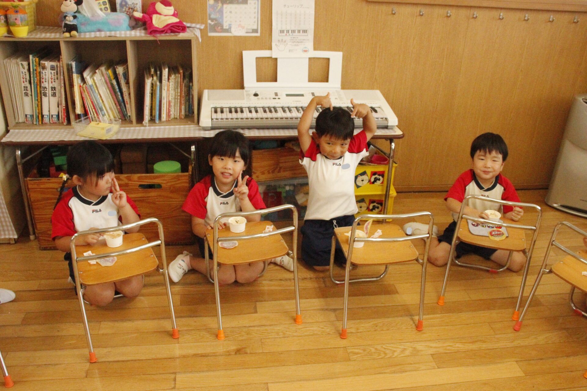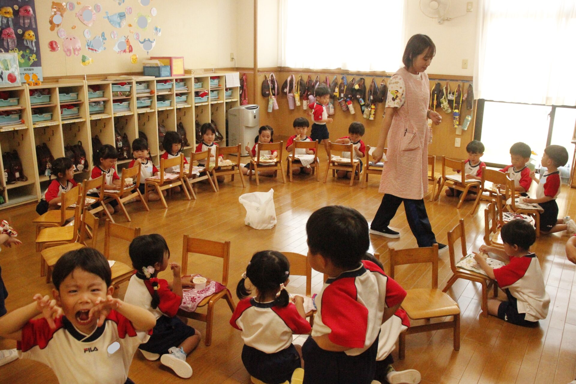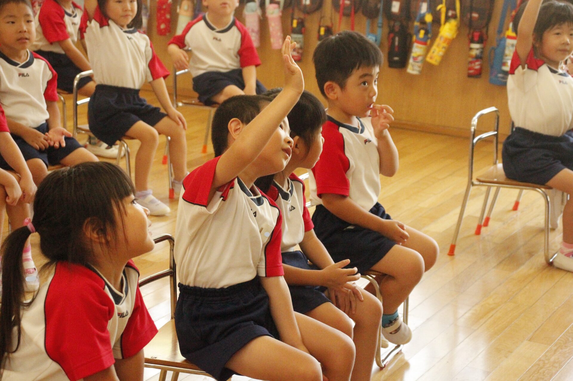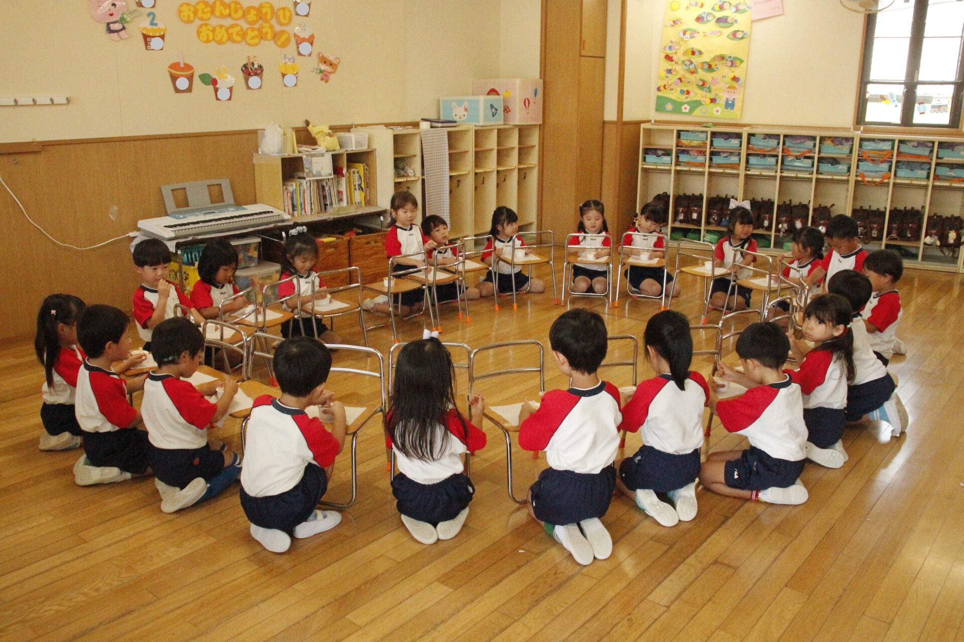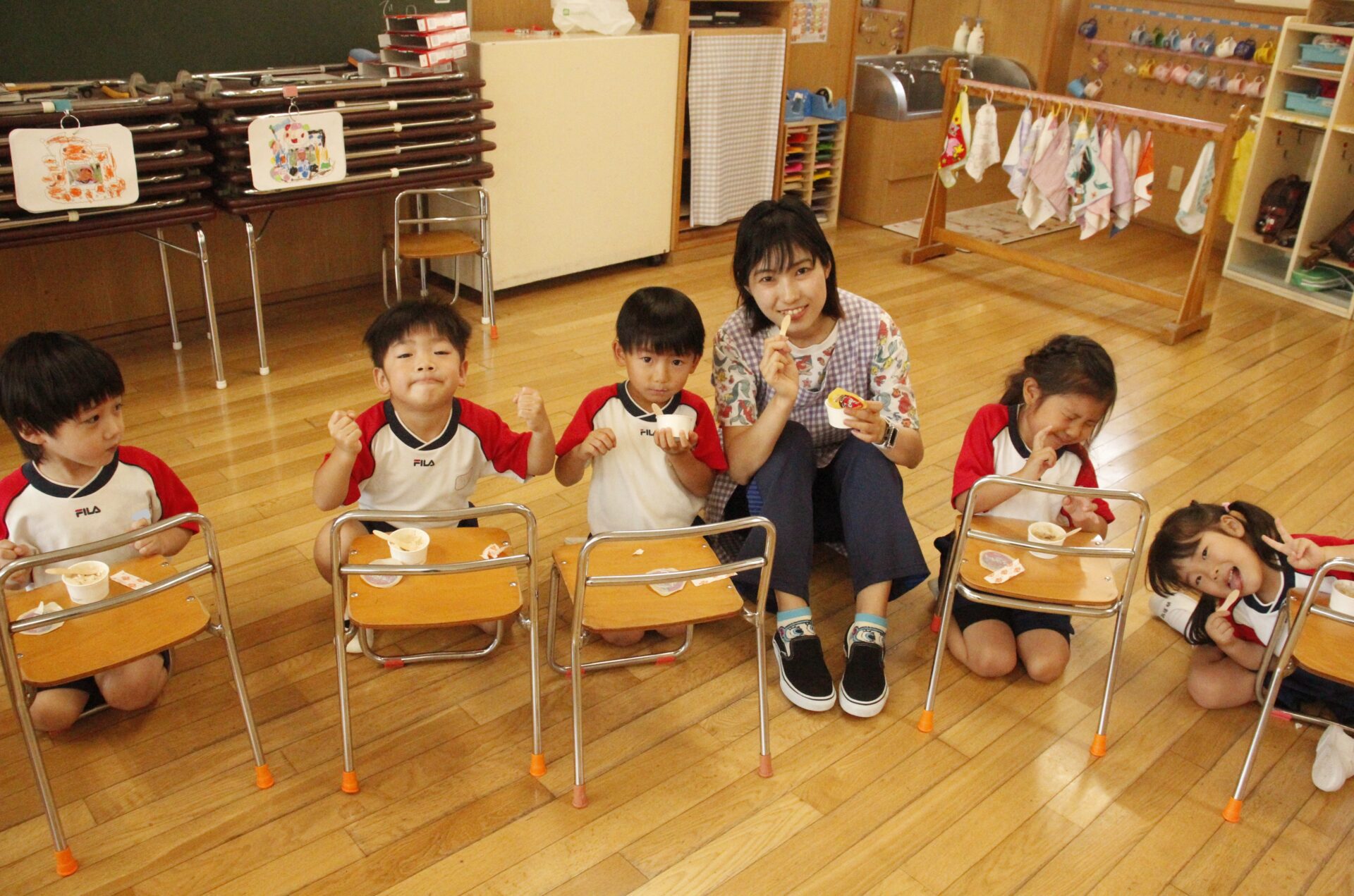 先生やお友達と夏休みの思い出話をしたり、夏の思い出を絵に描いたり、クラス皆で椅子取りゲームをして遊んだりして各クラスで過ごしました。