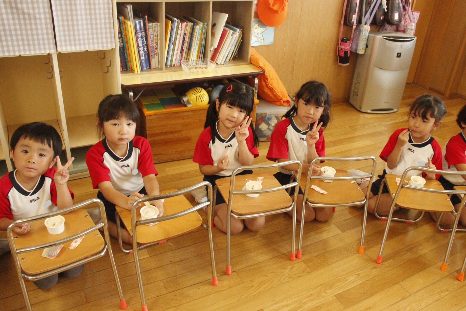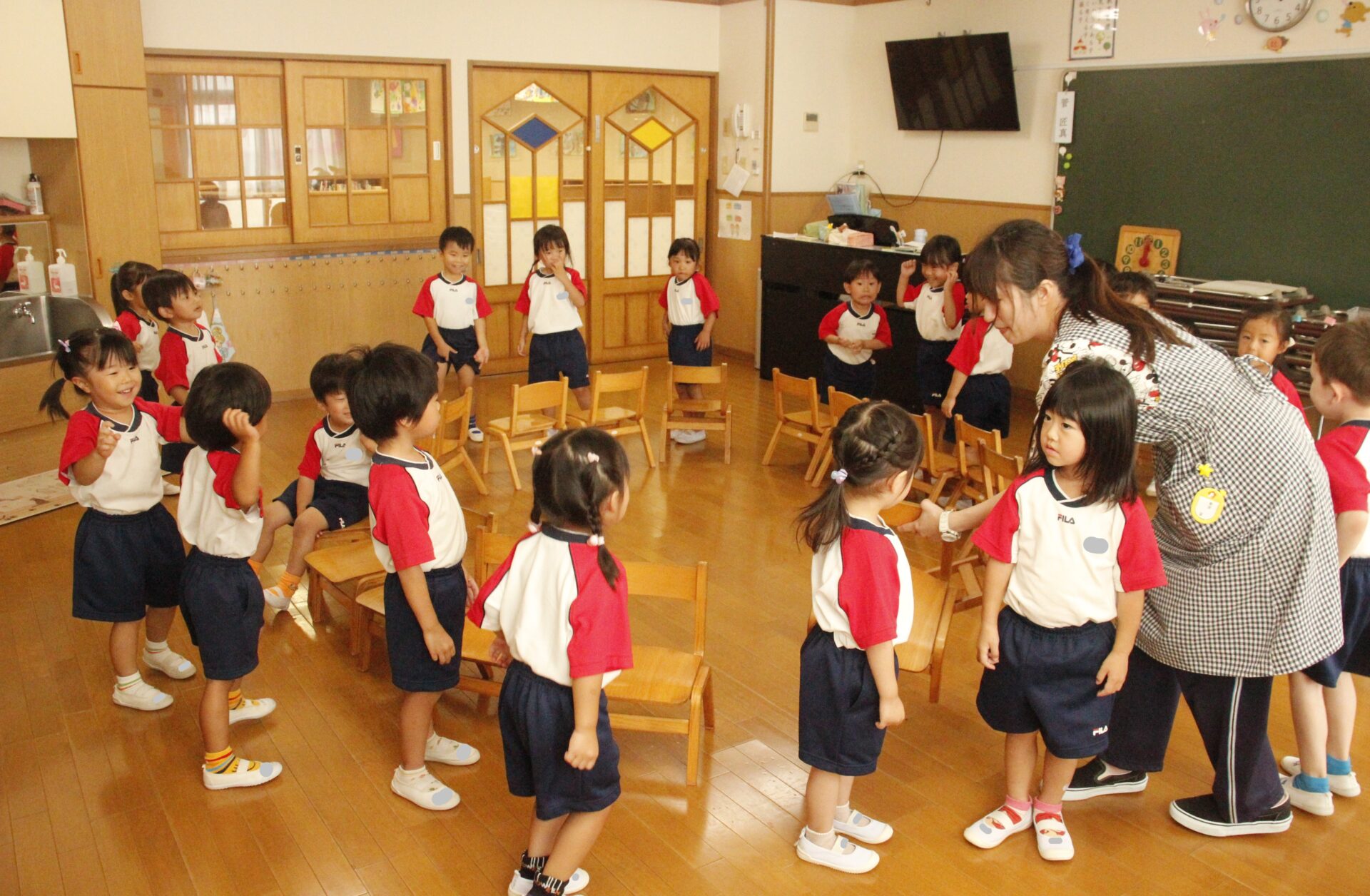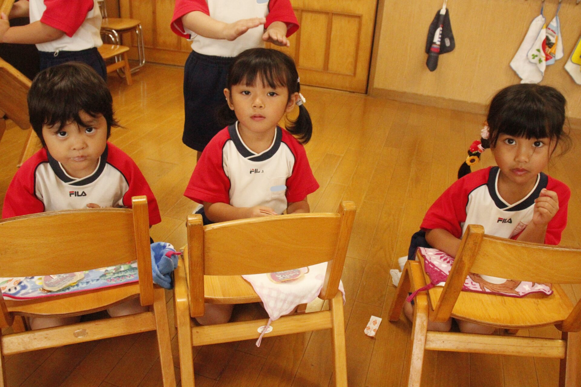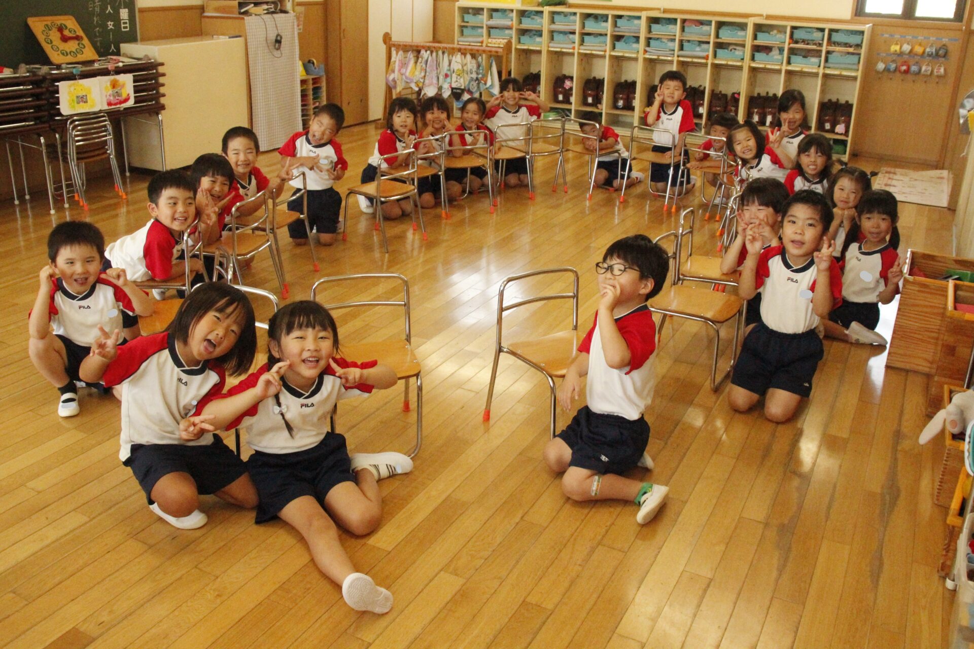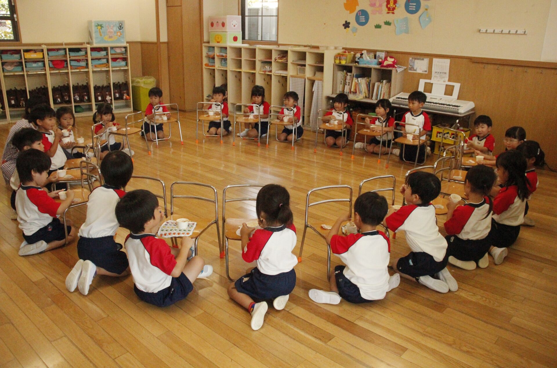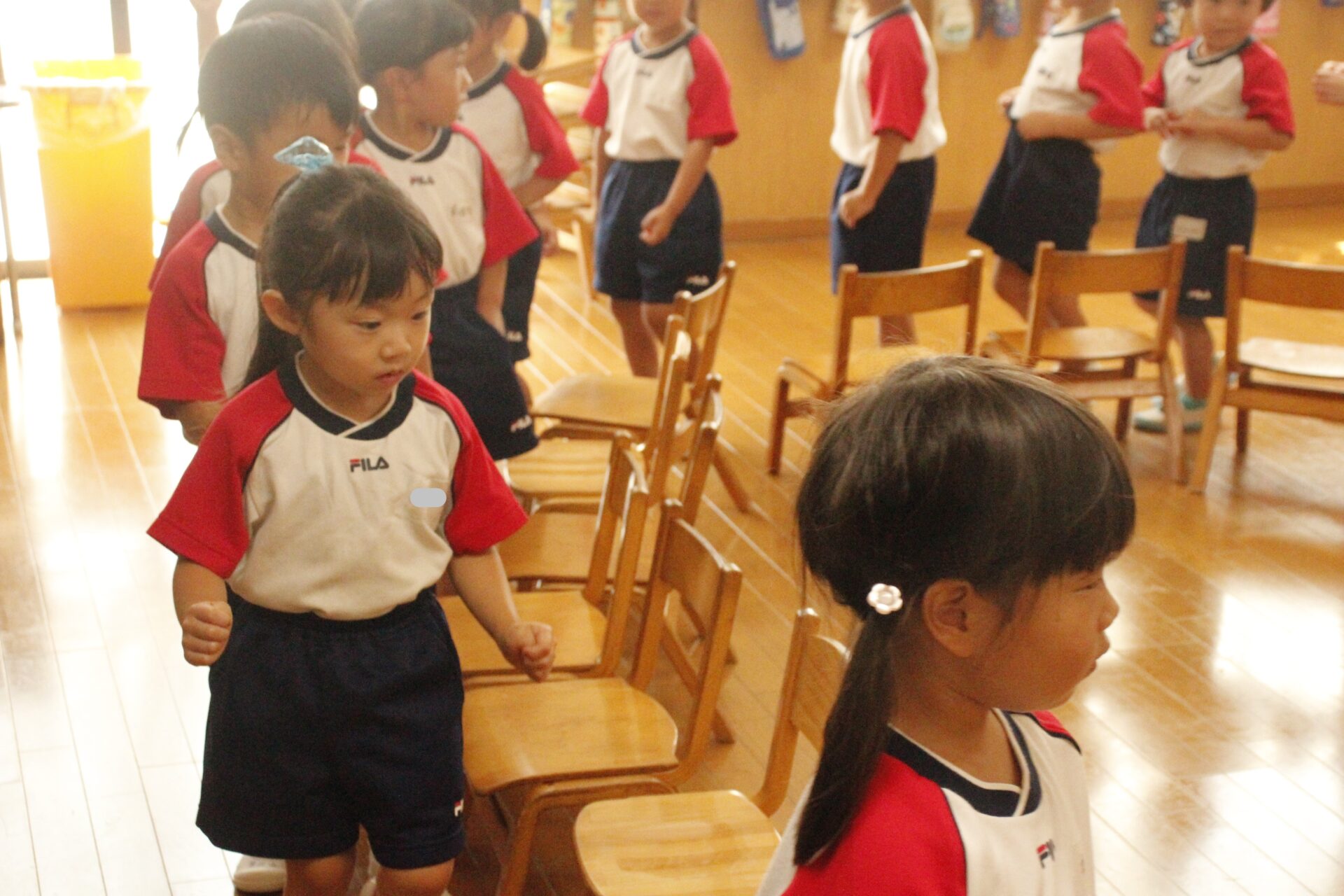 先生やお友達と夏休みの思い出話をしたり、夏の思い出を絵に描いたり、クラス皆で椅子取りゲームをして遊んだりして各クラスで過ごしました。
