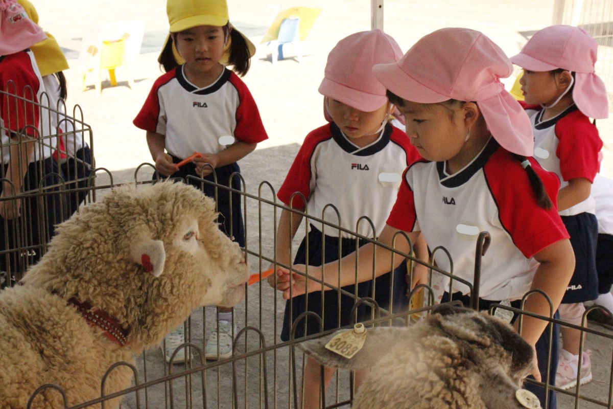 10月8日(水)みほ幼稚園第2グラウンドに、ヒツジやヤギ、ウサギ、モルモット、ヒヨコなど、福田牧場さんで飼育している沢山の動物がやってきました。