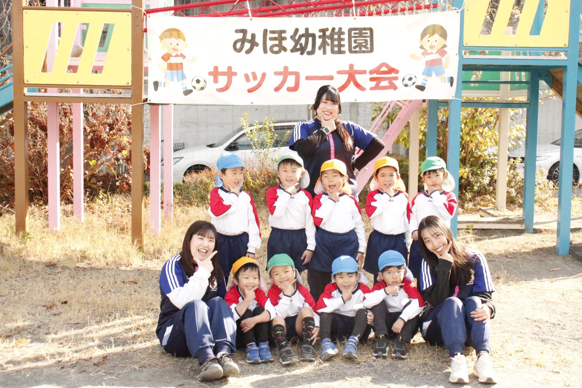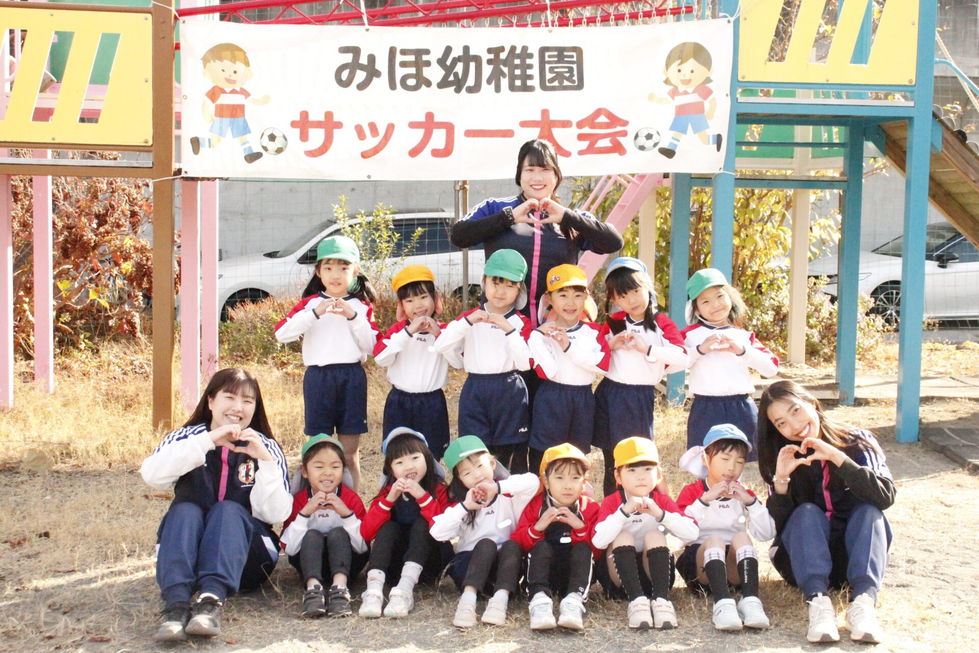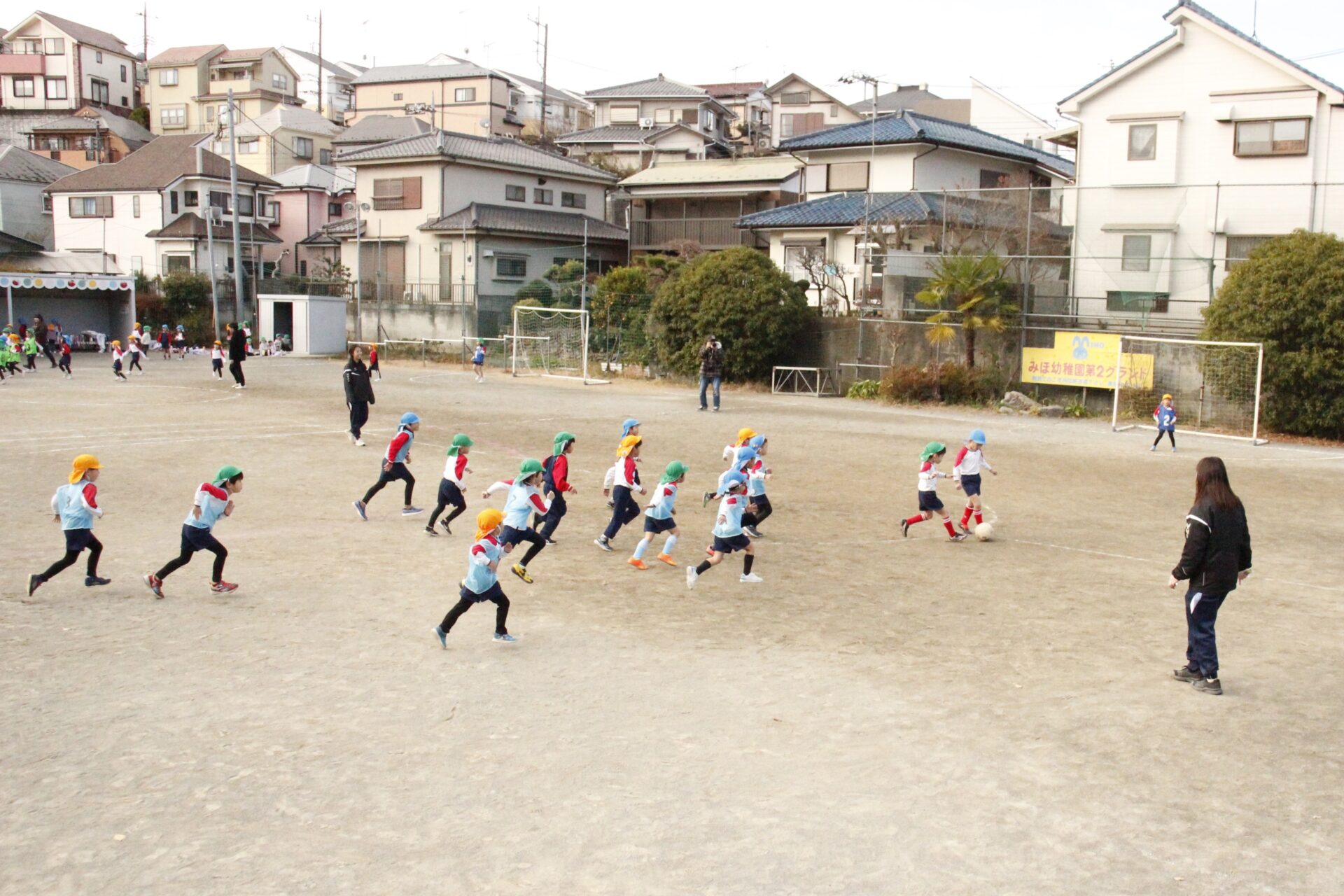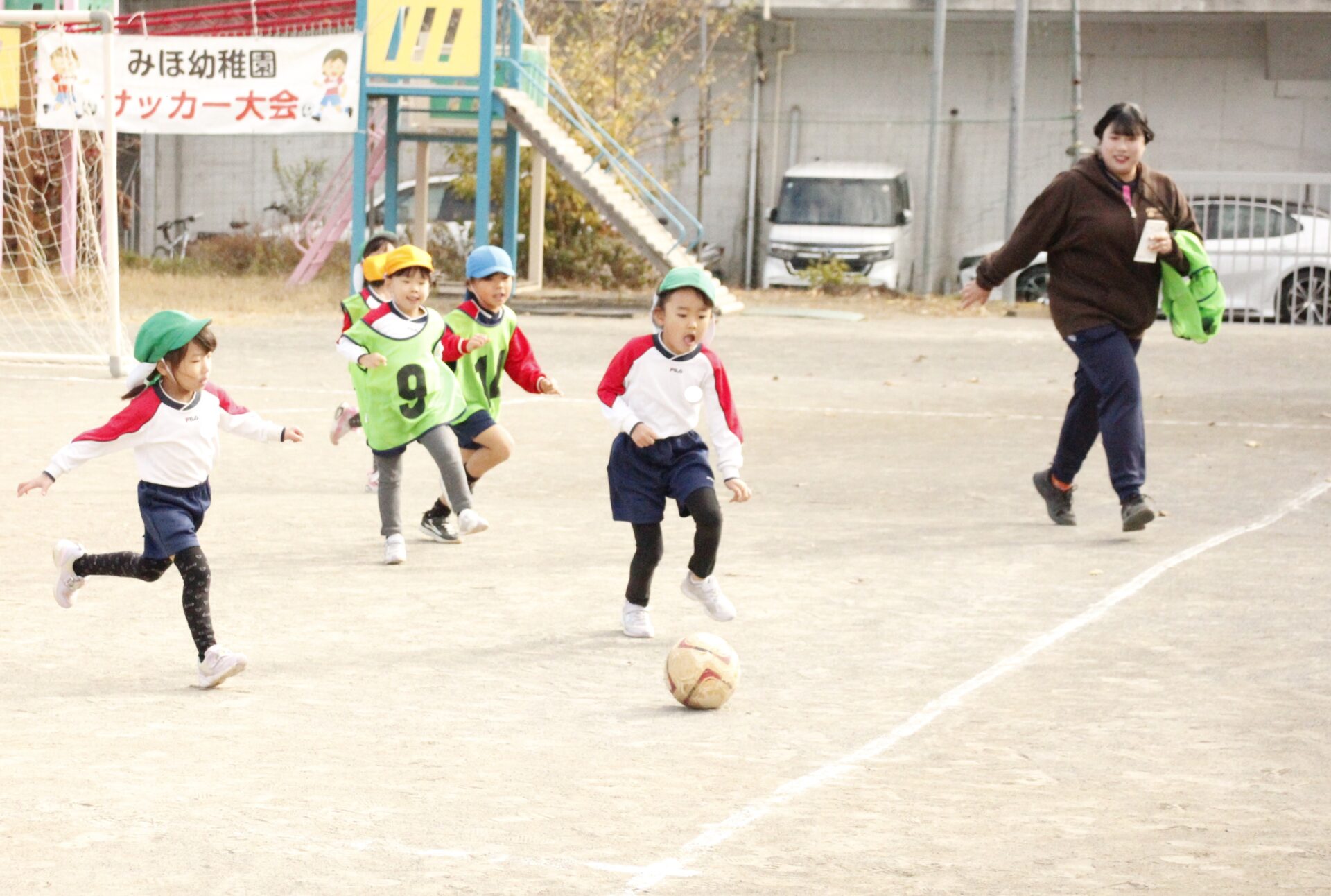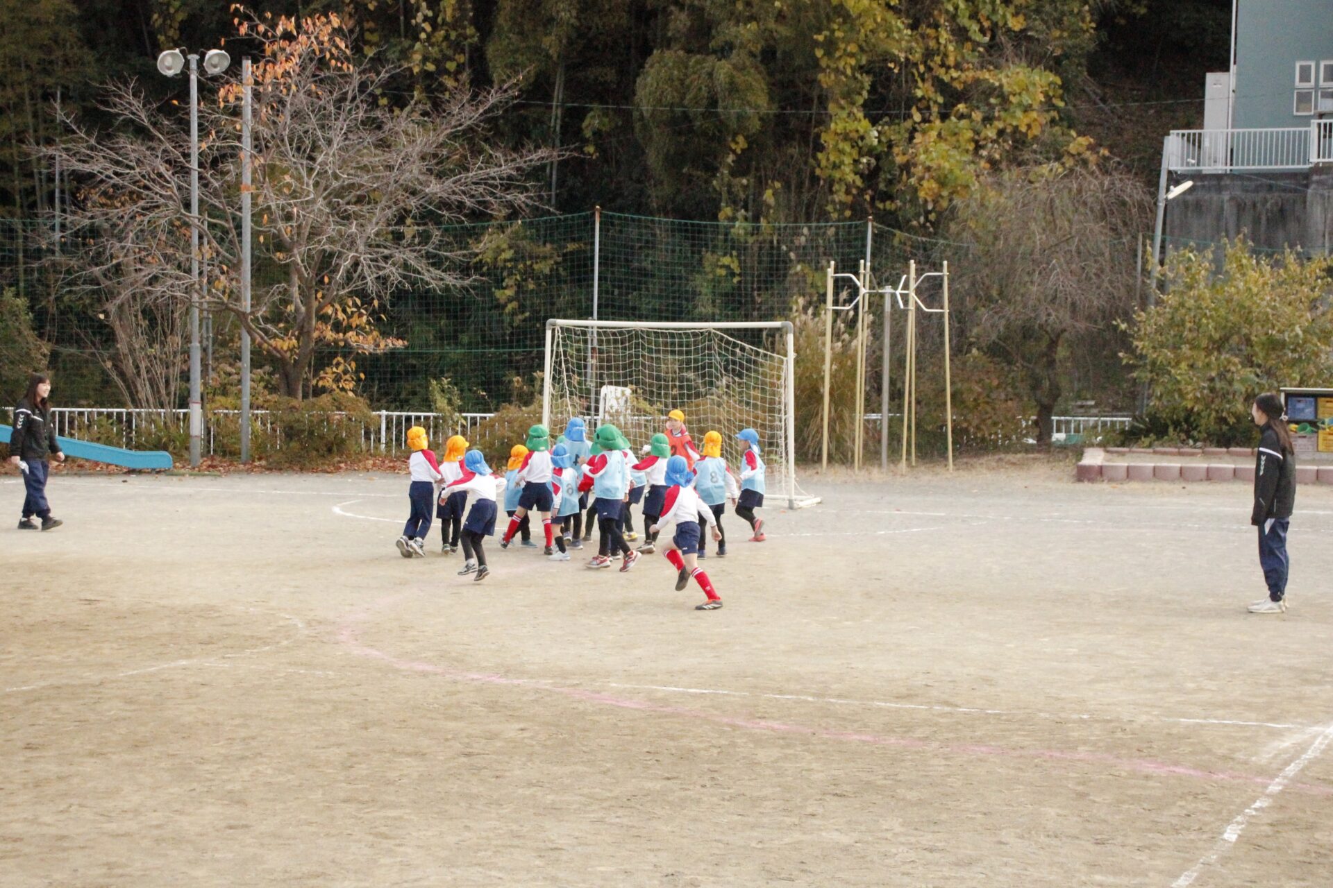 12月9日(火)みほ幼稚園第2グラウンドで、年長サッカー大会を開催しました。クラス関係なく、男女ともににチームを作って競い合いました。風が少し冷たかったのですが、元気な子ども達には全く関係なく、元気にグラウンドを走りまわっていました。