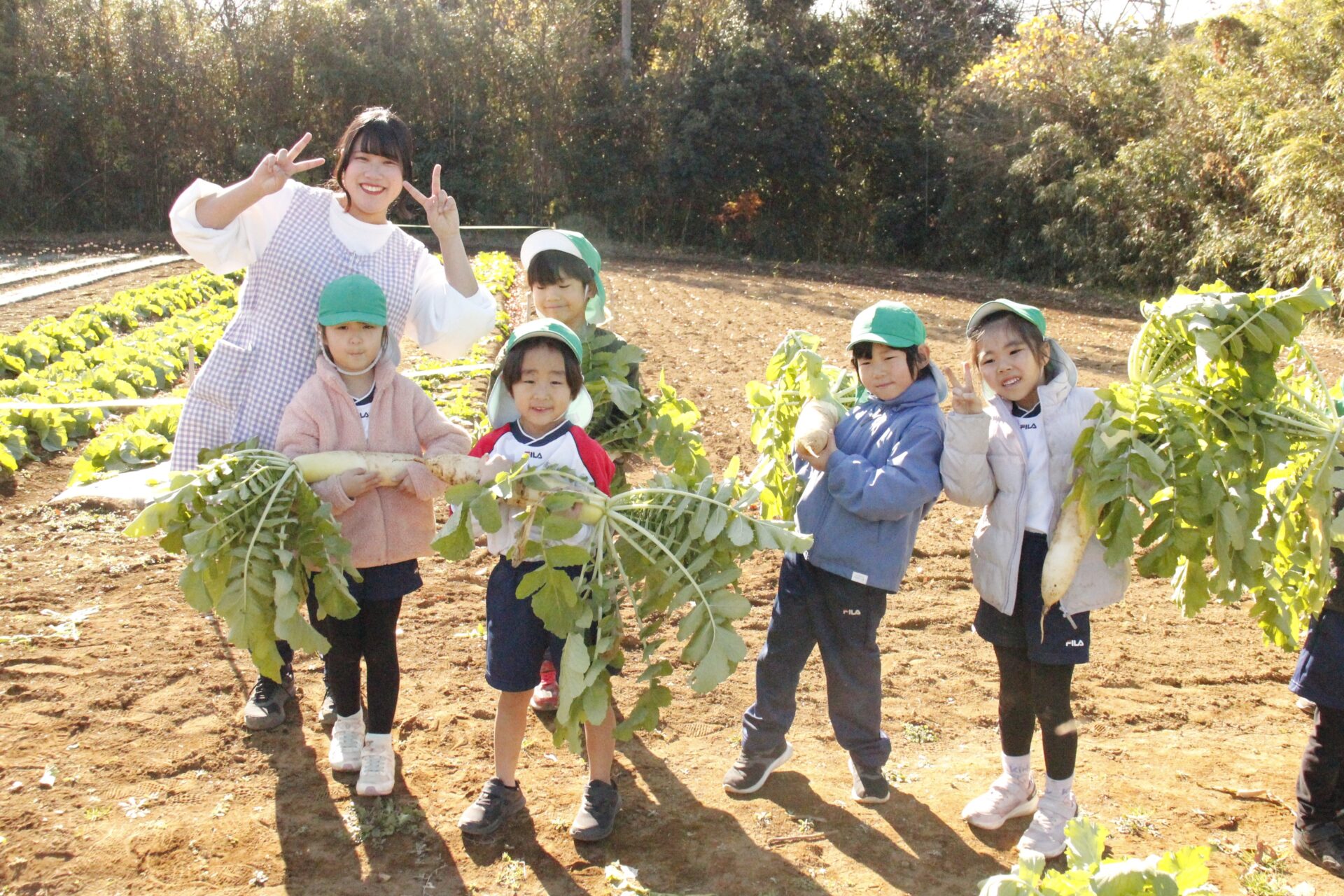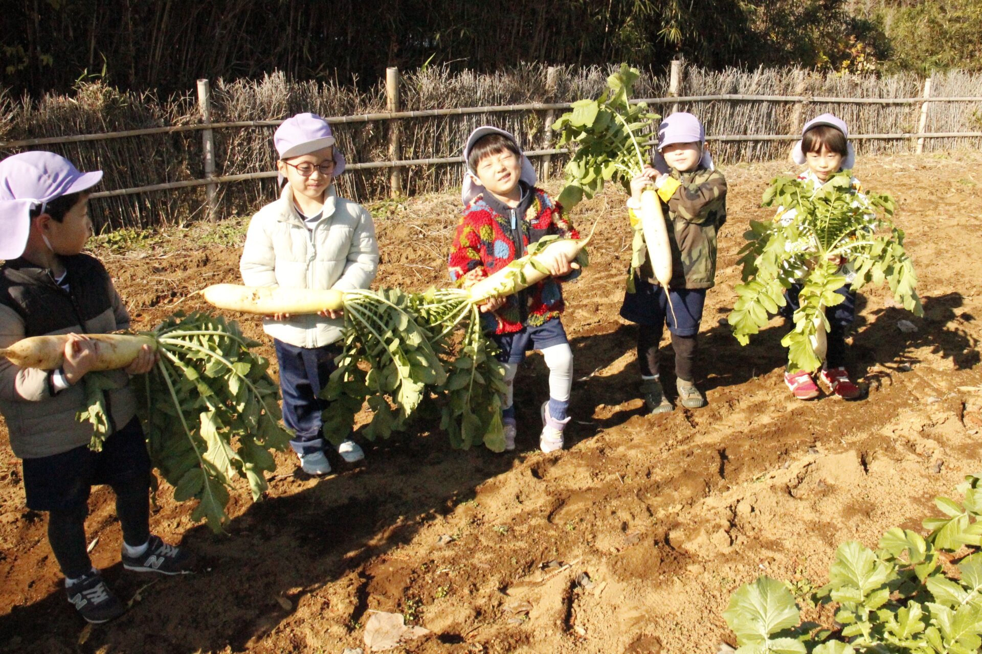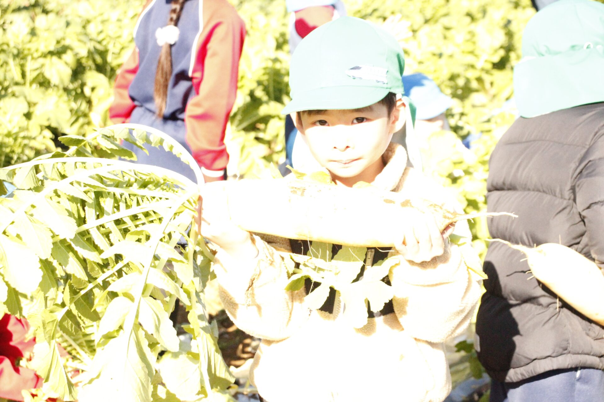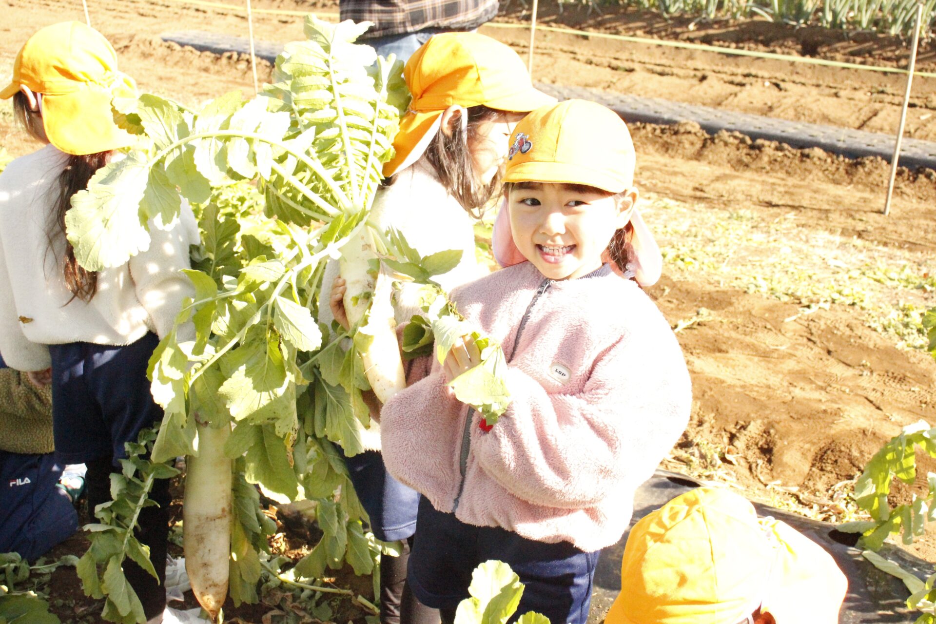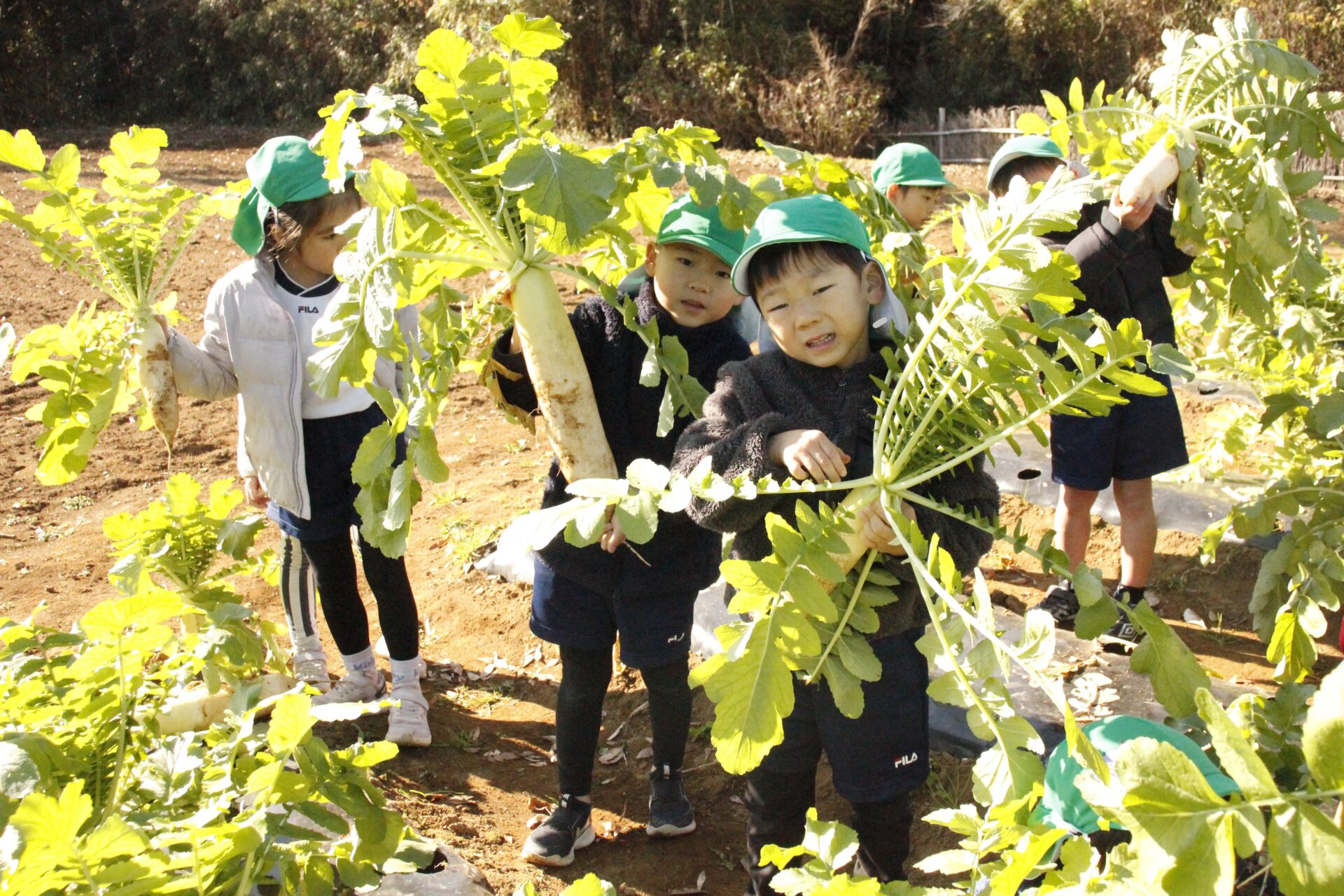 皆上手に大根を引き抜き、大きくて重い大根を頑張って運んでいました。子ども達には、「大根の葉っぱも食べられるんだよ」と伝えると、びっくりしている子もいました。このような収穫体験を通して、収穫の喜び、食への関心の高まり、農家さんへの感謝の姿勢などが育ってくれたら嬉しいです。