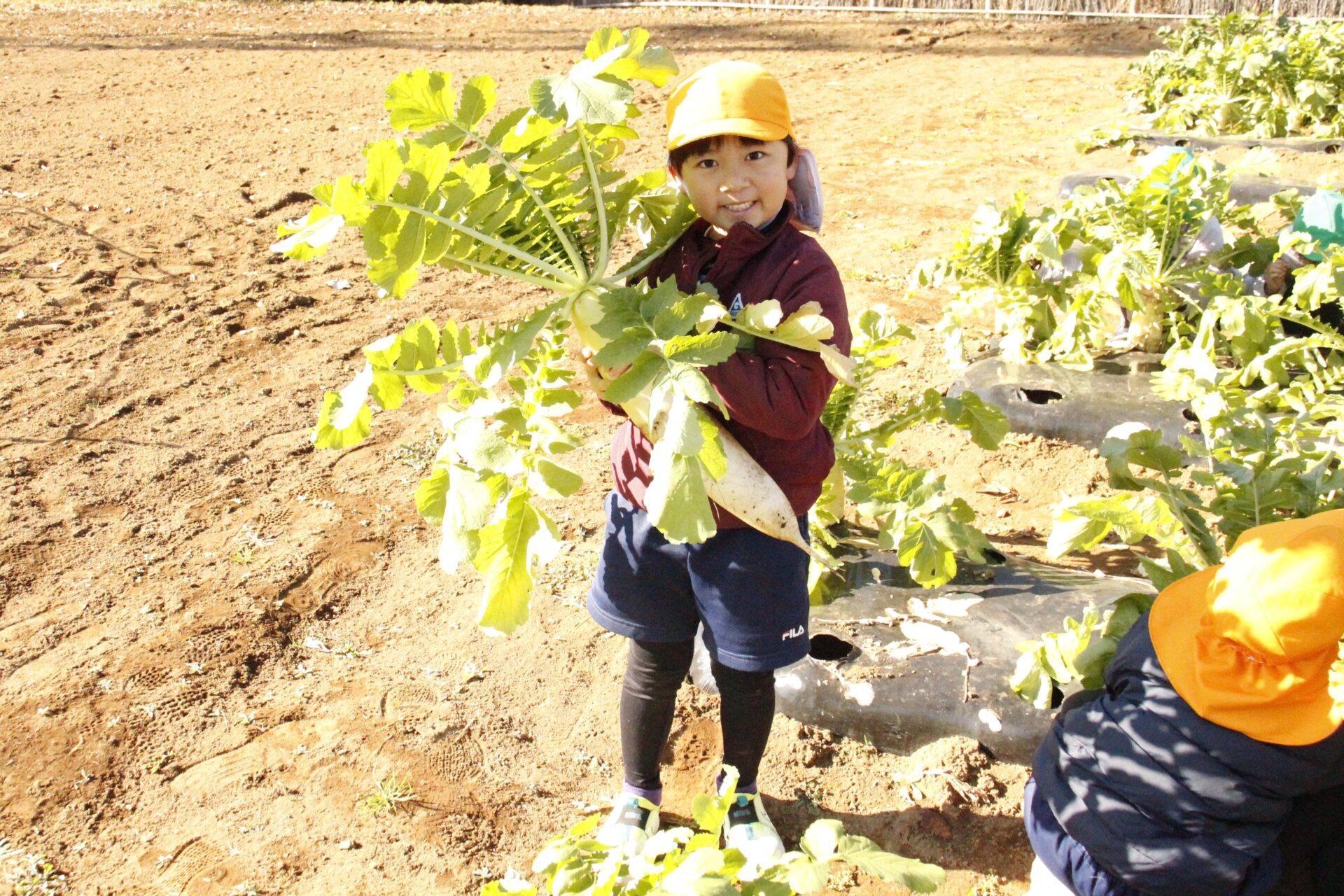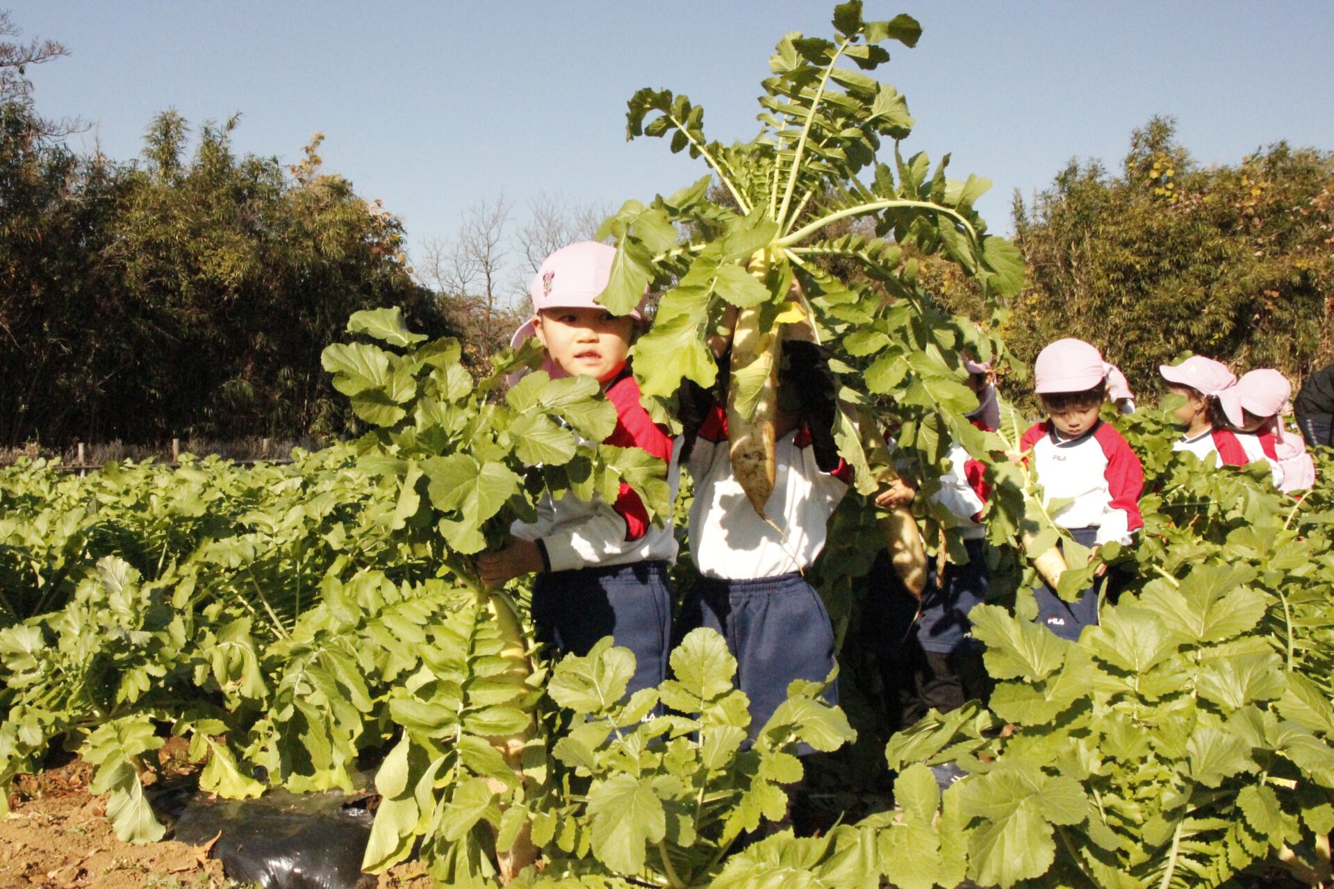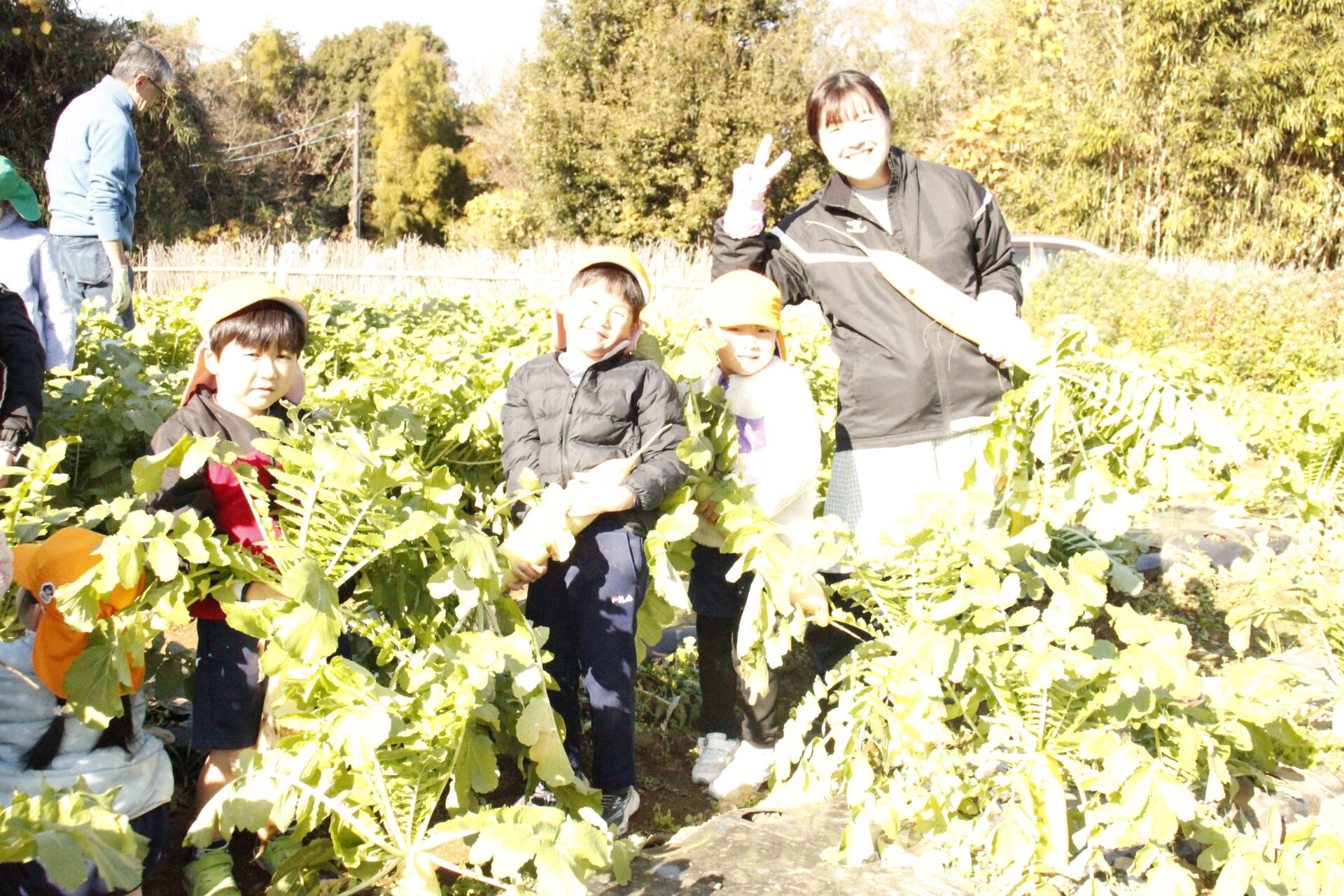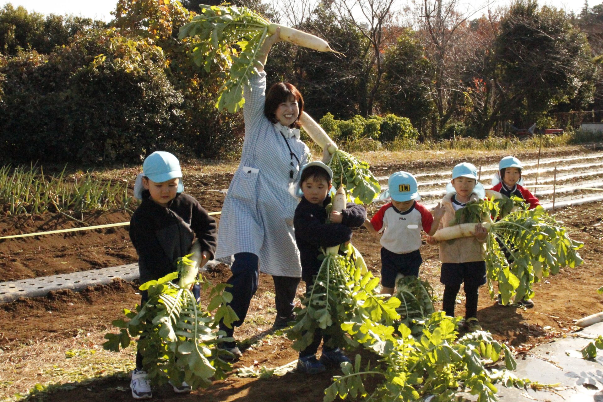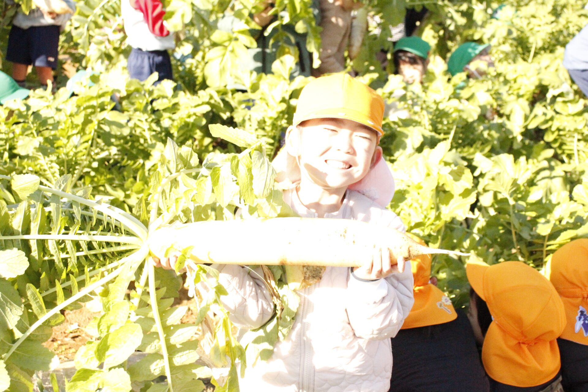 皆上手に大根を引き抜き、大きくて重い大根を頑張って運んでいました。子ども達には、「大根の葉っぱも食べられるんだよ」と伝えると、びっくりしている子もいました。このような収穫体験を通して、収穫の喜び、食への関心の高まり、農家さんへの感謝の姿勢などが育ってくれたら嬉しいです。
