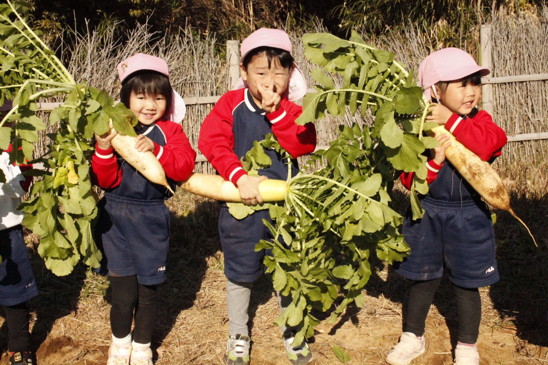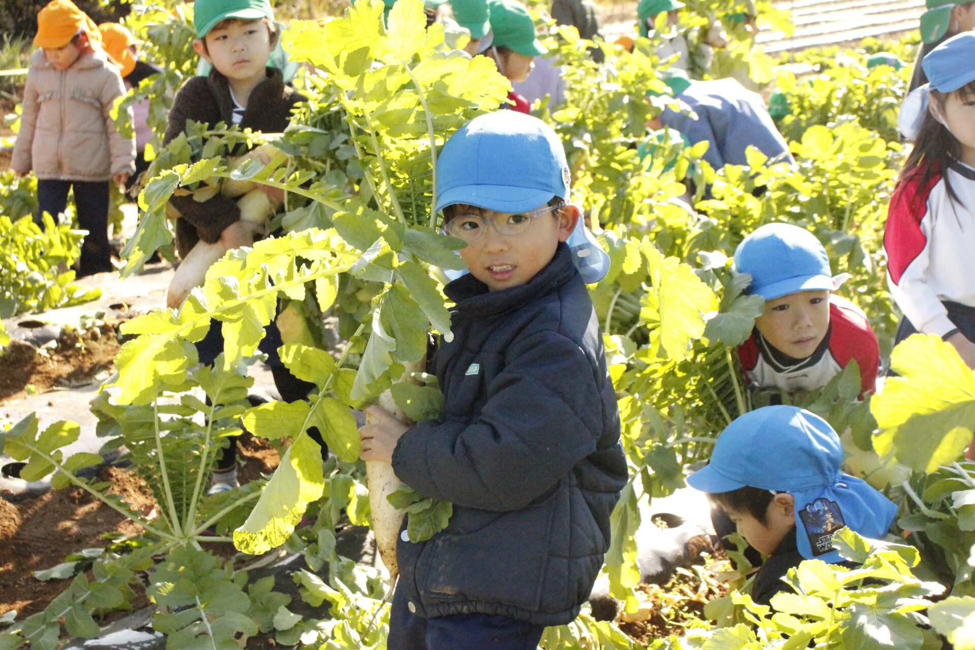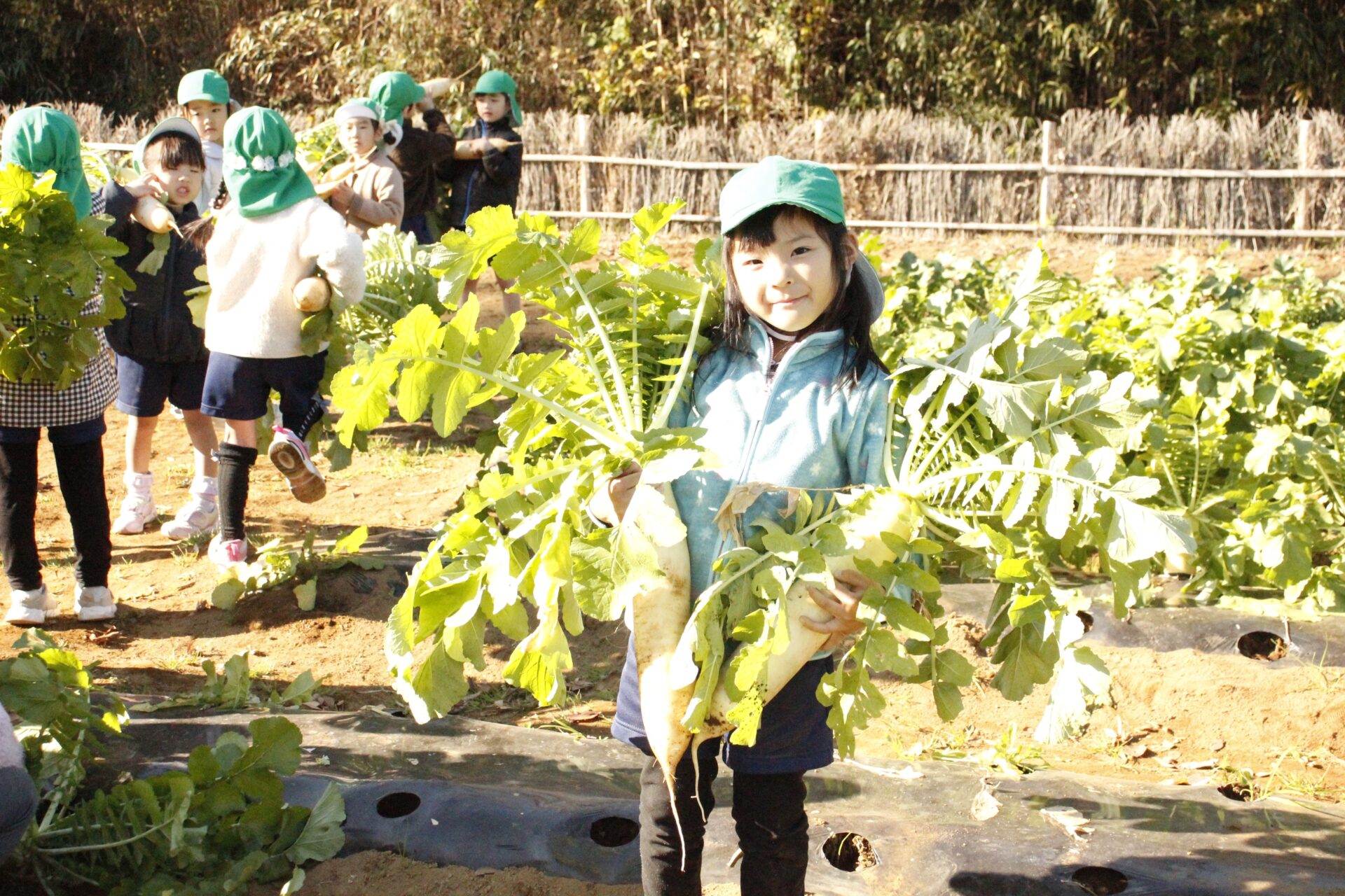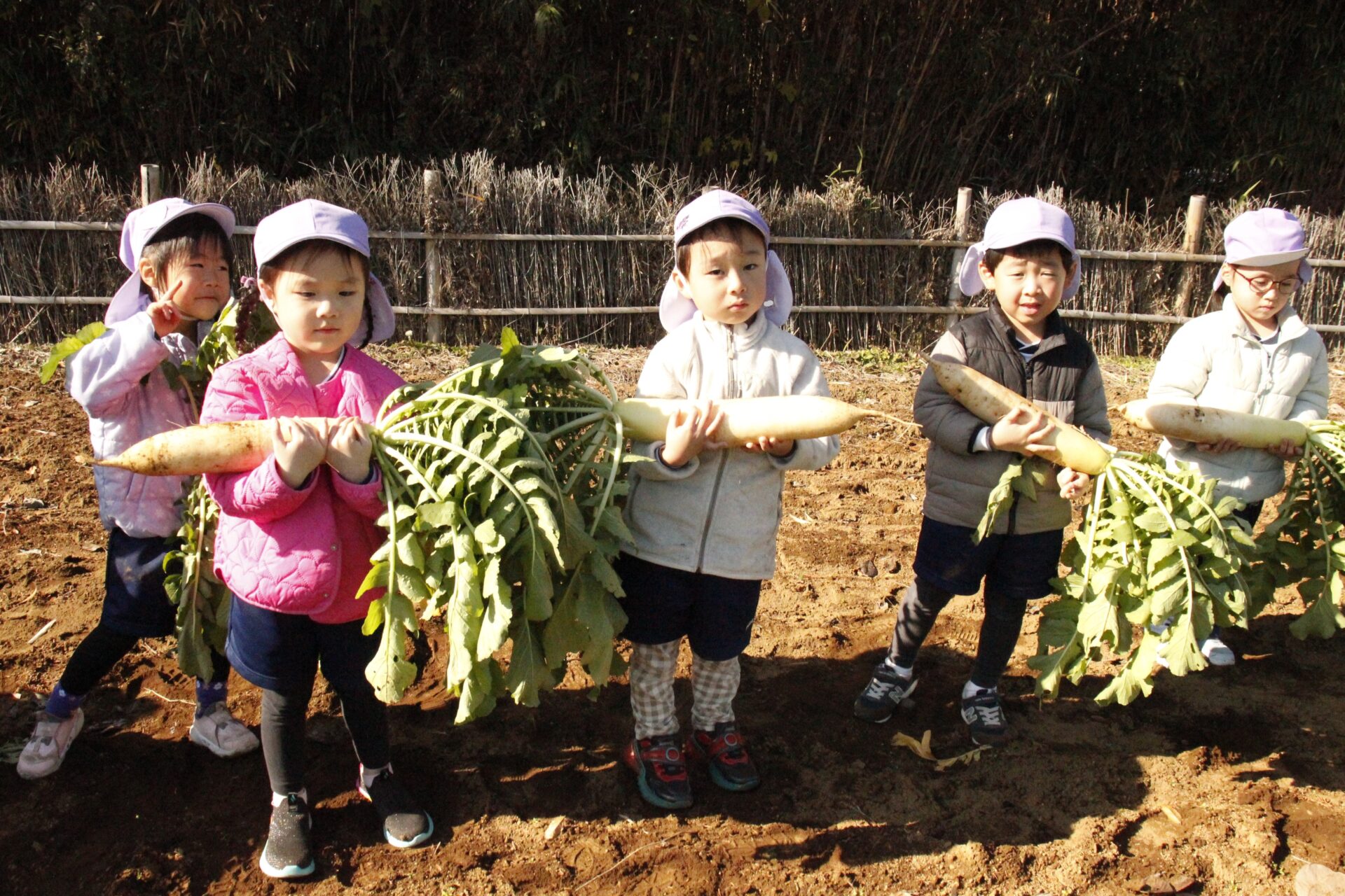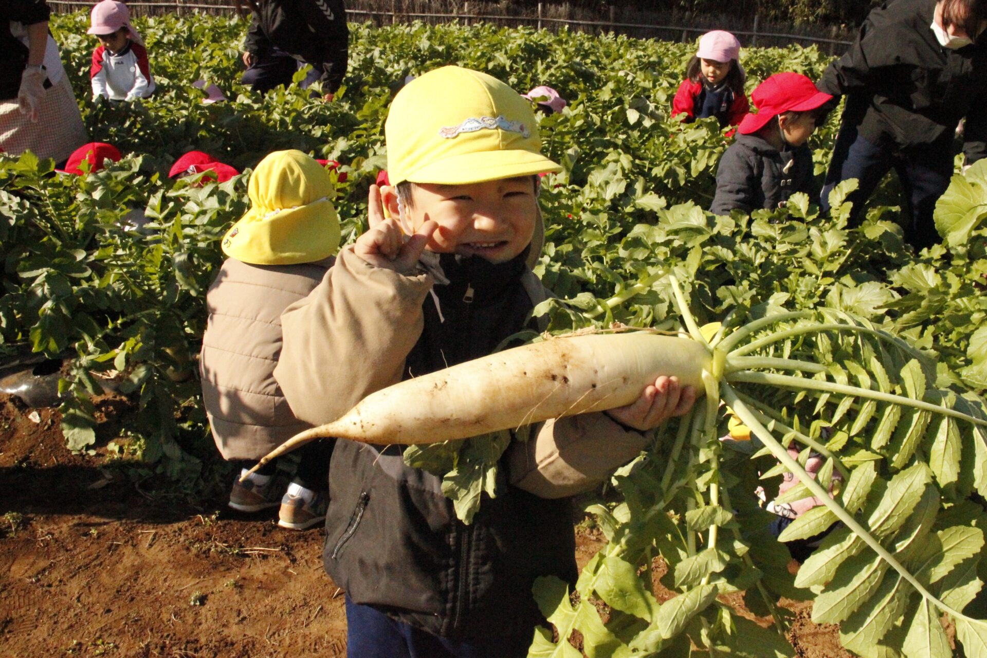 皆上手に大根を引き抜き、大きくて重い大根を頑張って運んでいました。子ども達には、「大根の葉っぱも食べられるんだよ」と伝えると、びっくりしている子もいました。このような収穫体験を通して、収穫の喜び、食への関心の高まり、農家さんへの感謝の姿勢などが育ってくれたら嬉しいです。