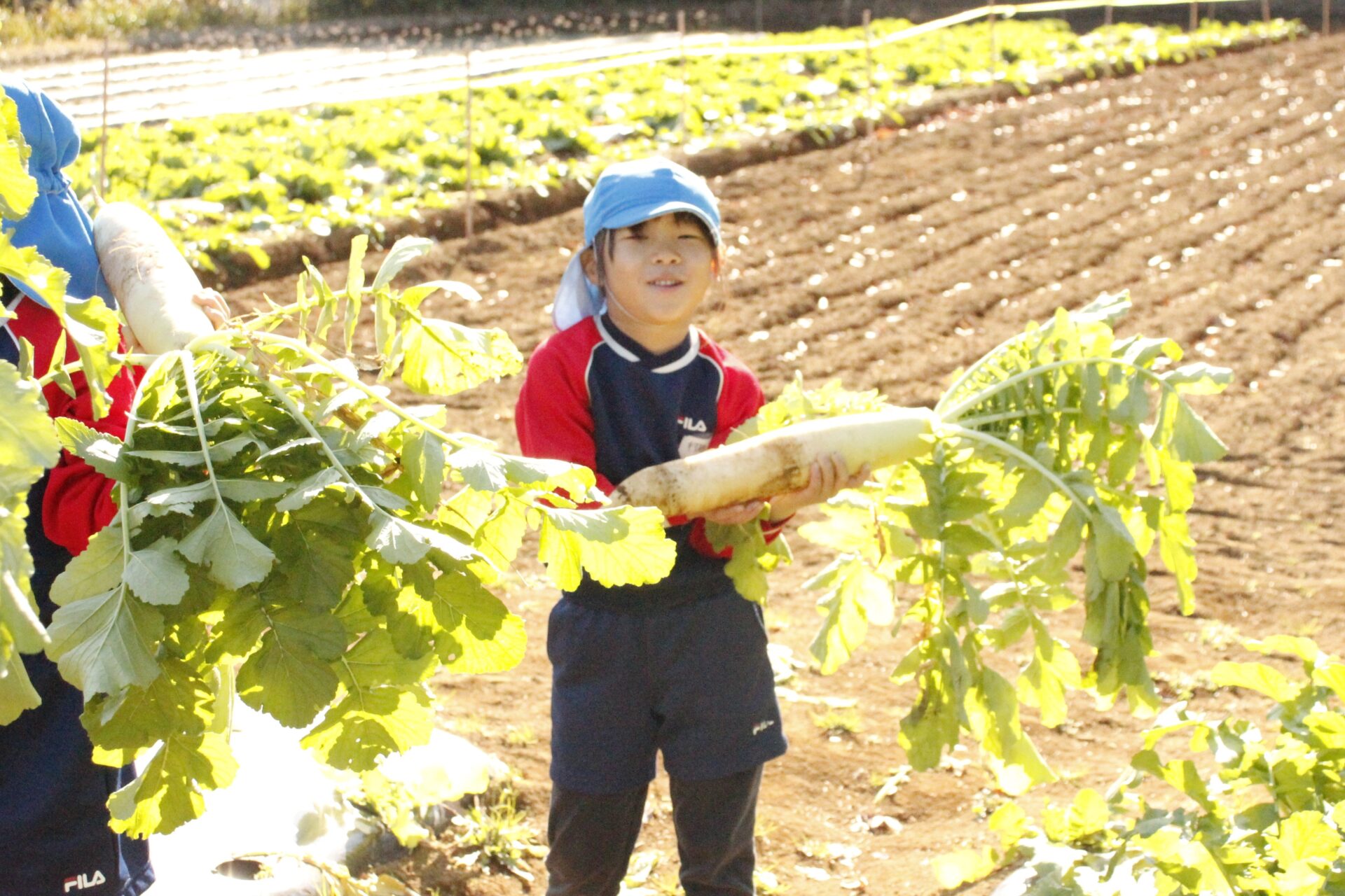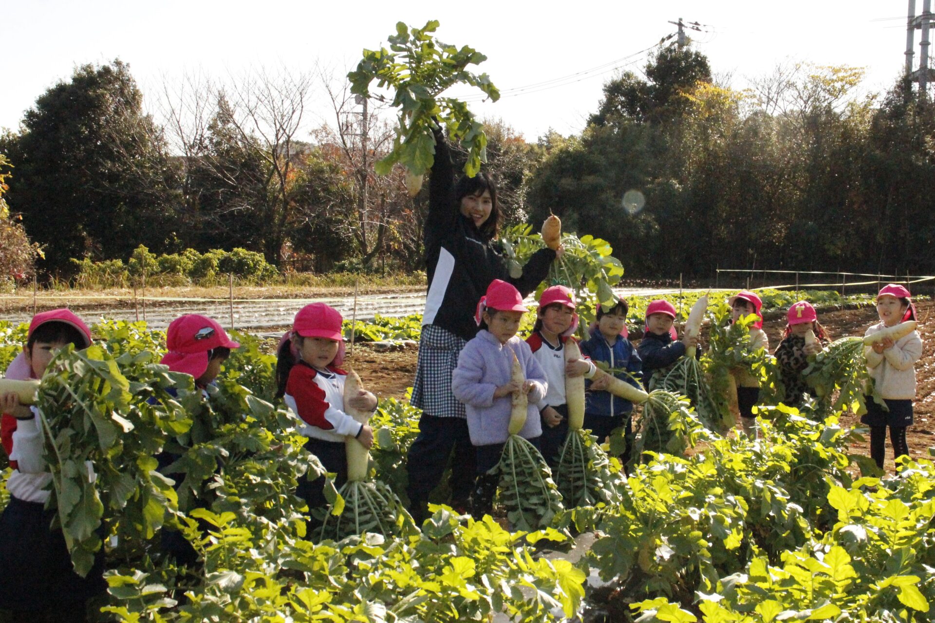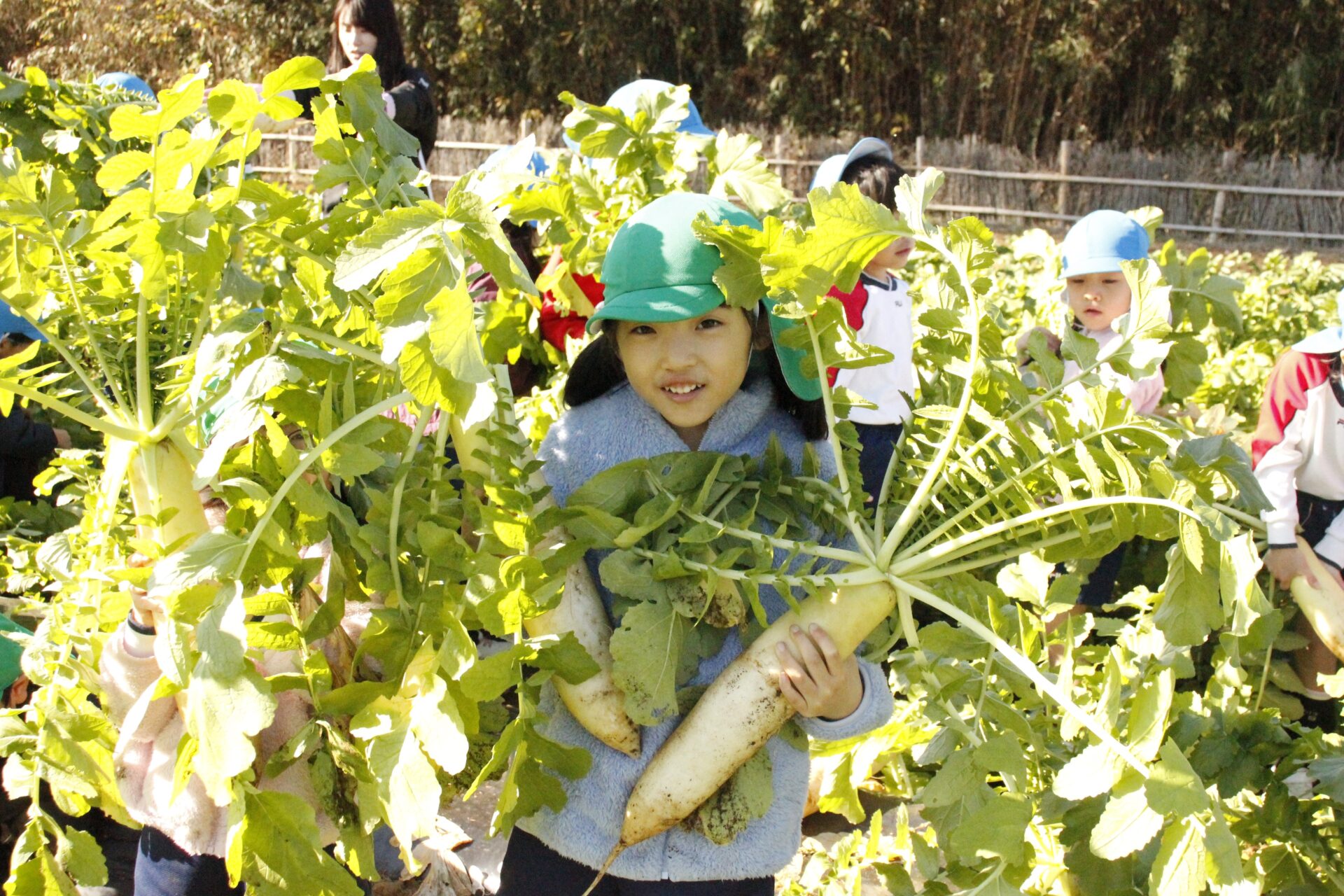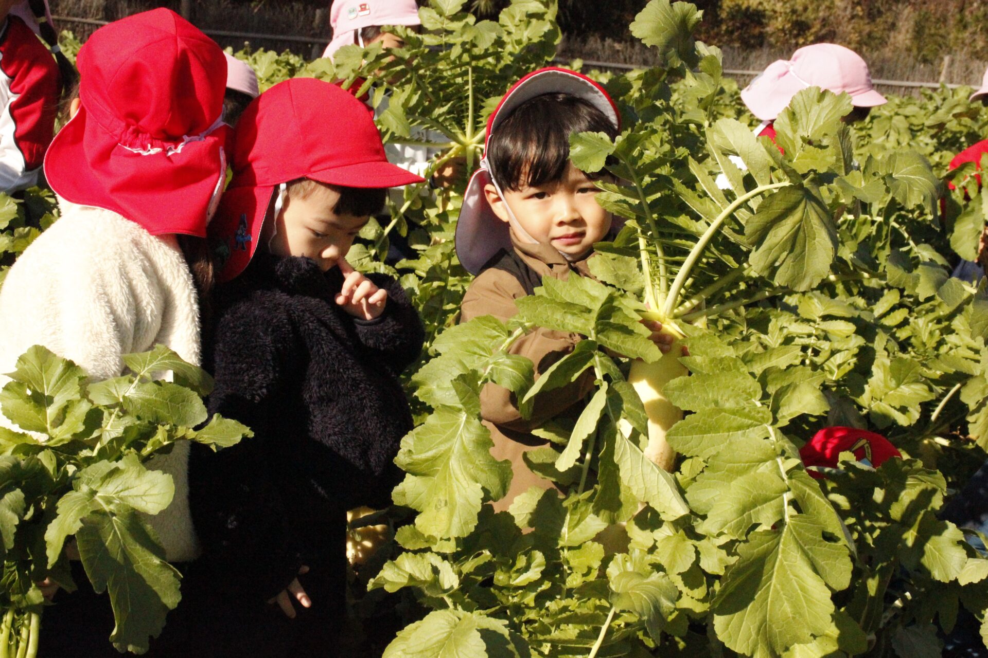 皆上手に大根を引き抜き、大きくて重い大根を頑張って運んでいました。子ども達には、「大根の葉っぱも食べられるんだよ」と伝えると、びっくりしている子もいました。このような収穫体験を通して、収穫の喜び、食への関心の高まり、農家さんへの感謝の姿勢などが育ってくれたら嬉しいです。