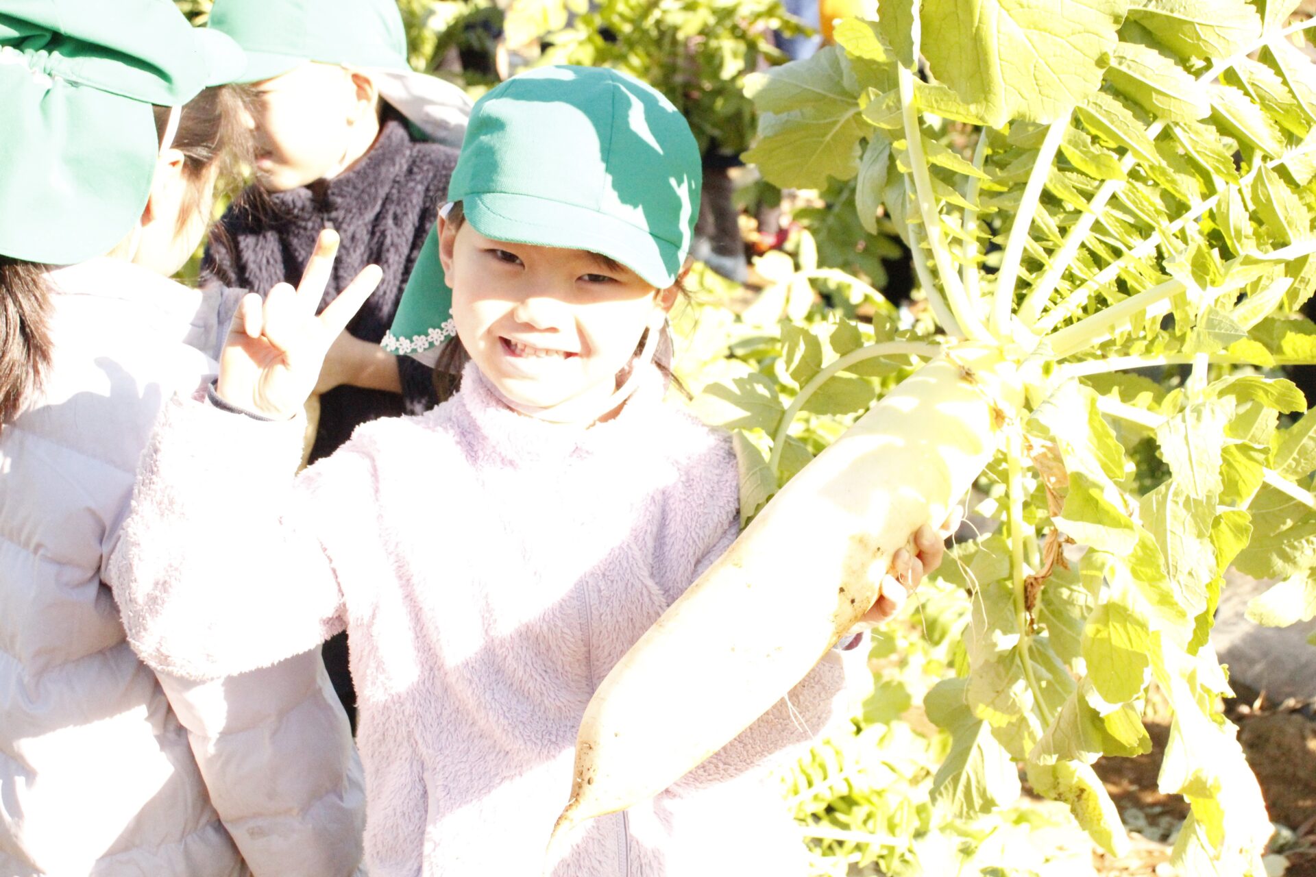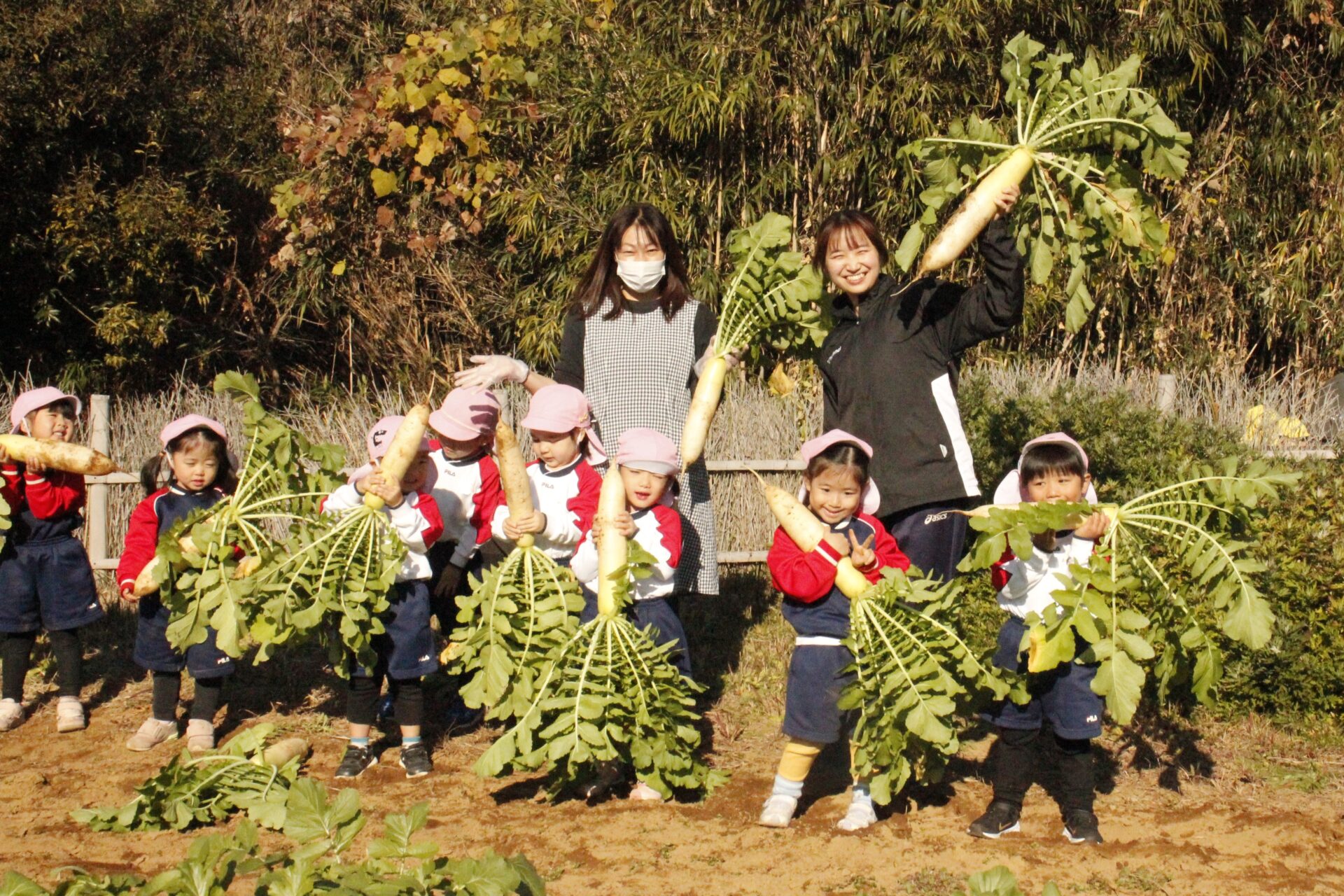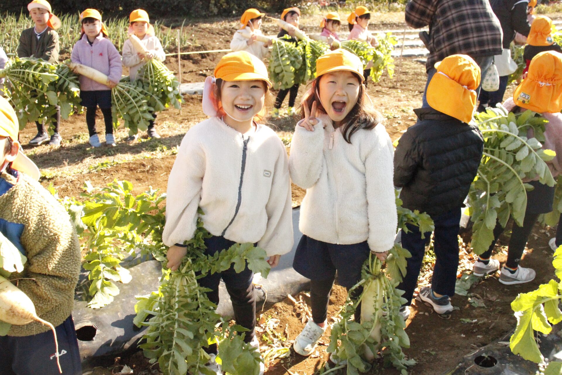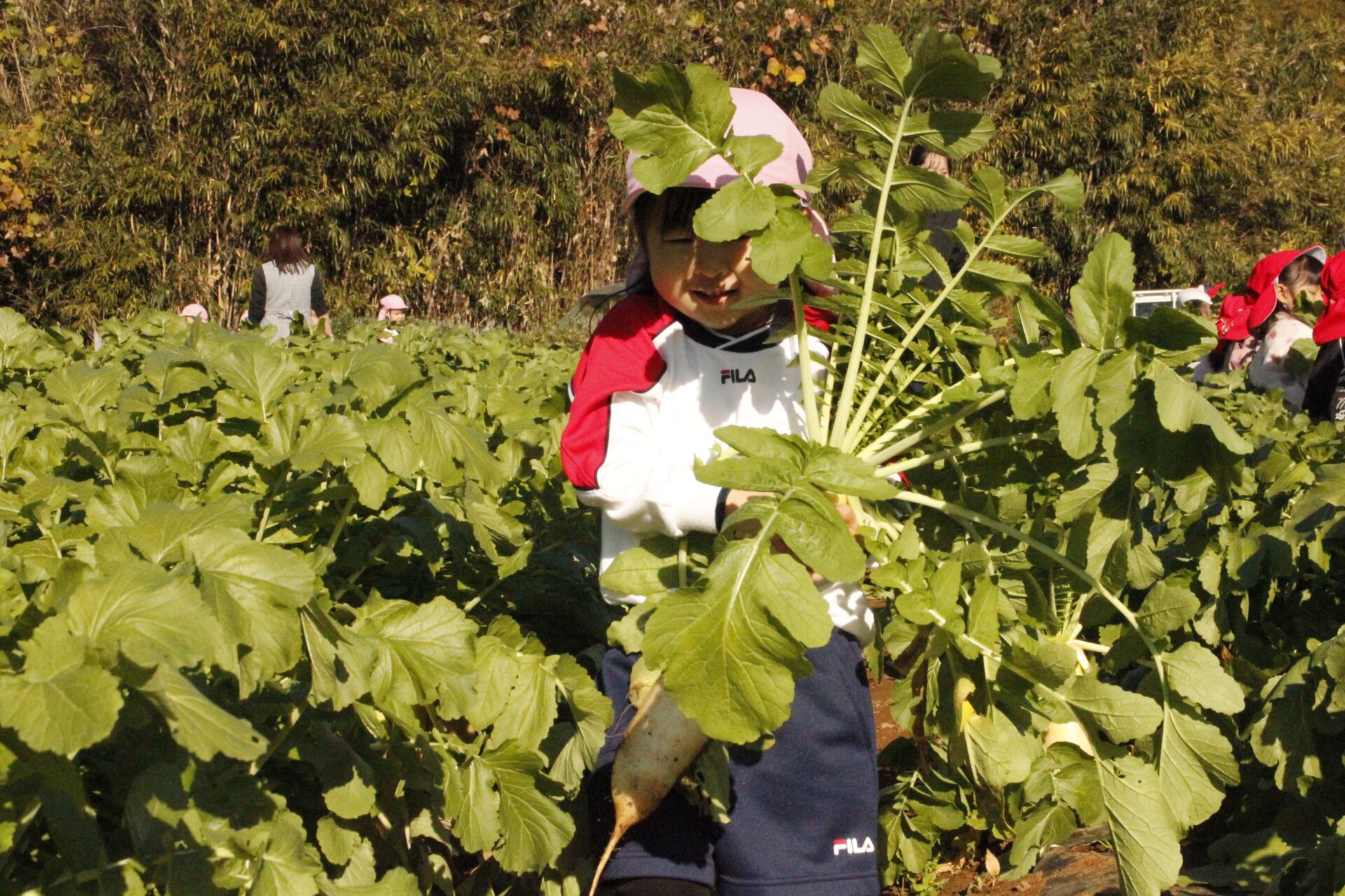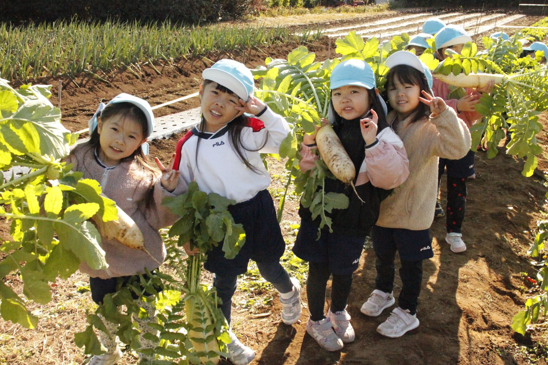 皆上手に大根を引き抜き、大きくて重い大根を頑張って運んでいました。子ども達には、「大根の葉っぱも食べられるんだよ」と伝えると、びっくりしている子もいました。このような収穫体験を通して、収穫の喜び、食への関心の高まり、農家さんへの感謝の姿勢などが育ってくれたら嬉しいです。