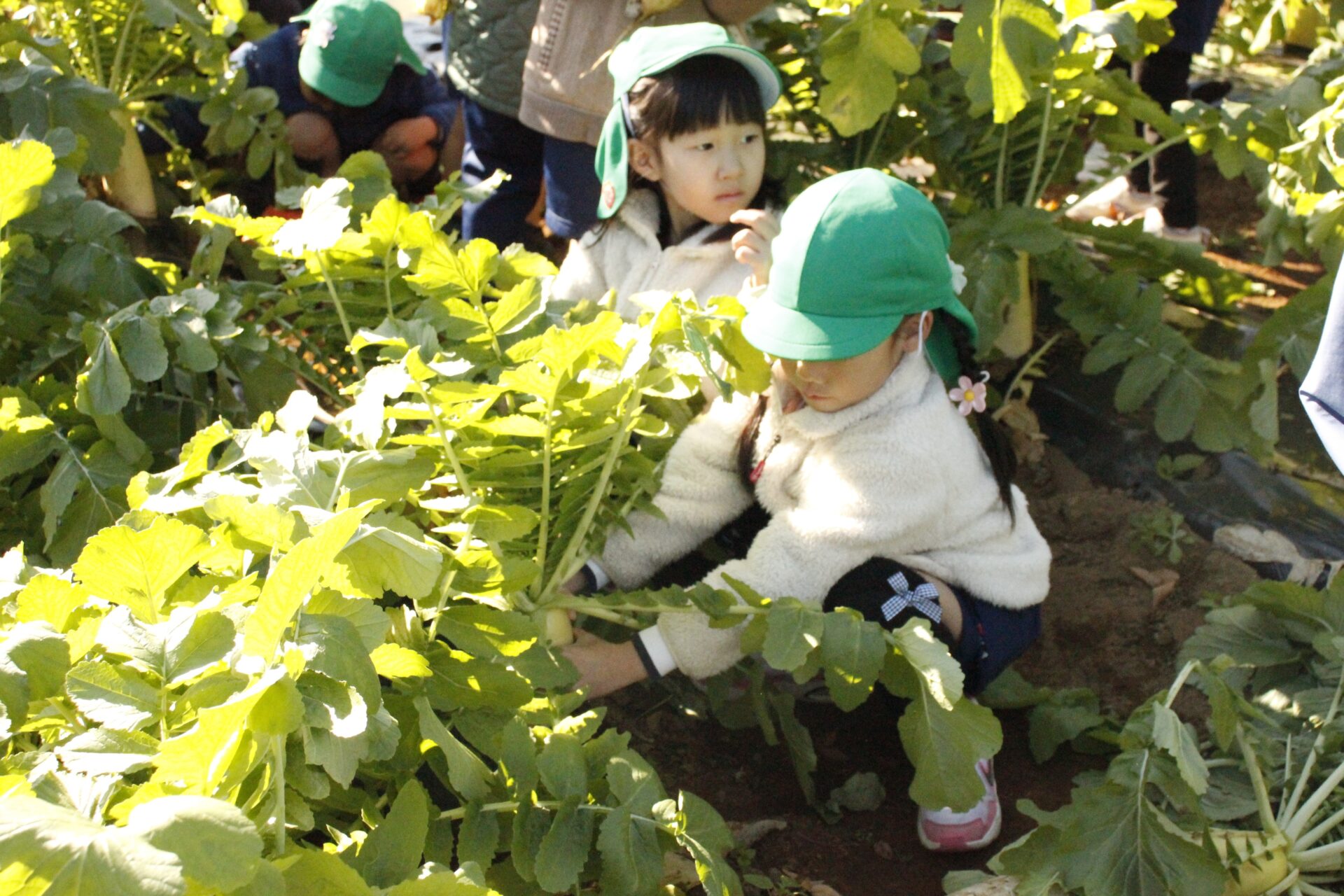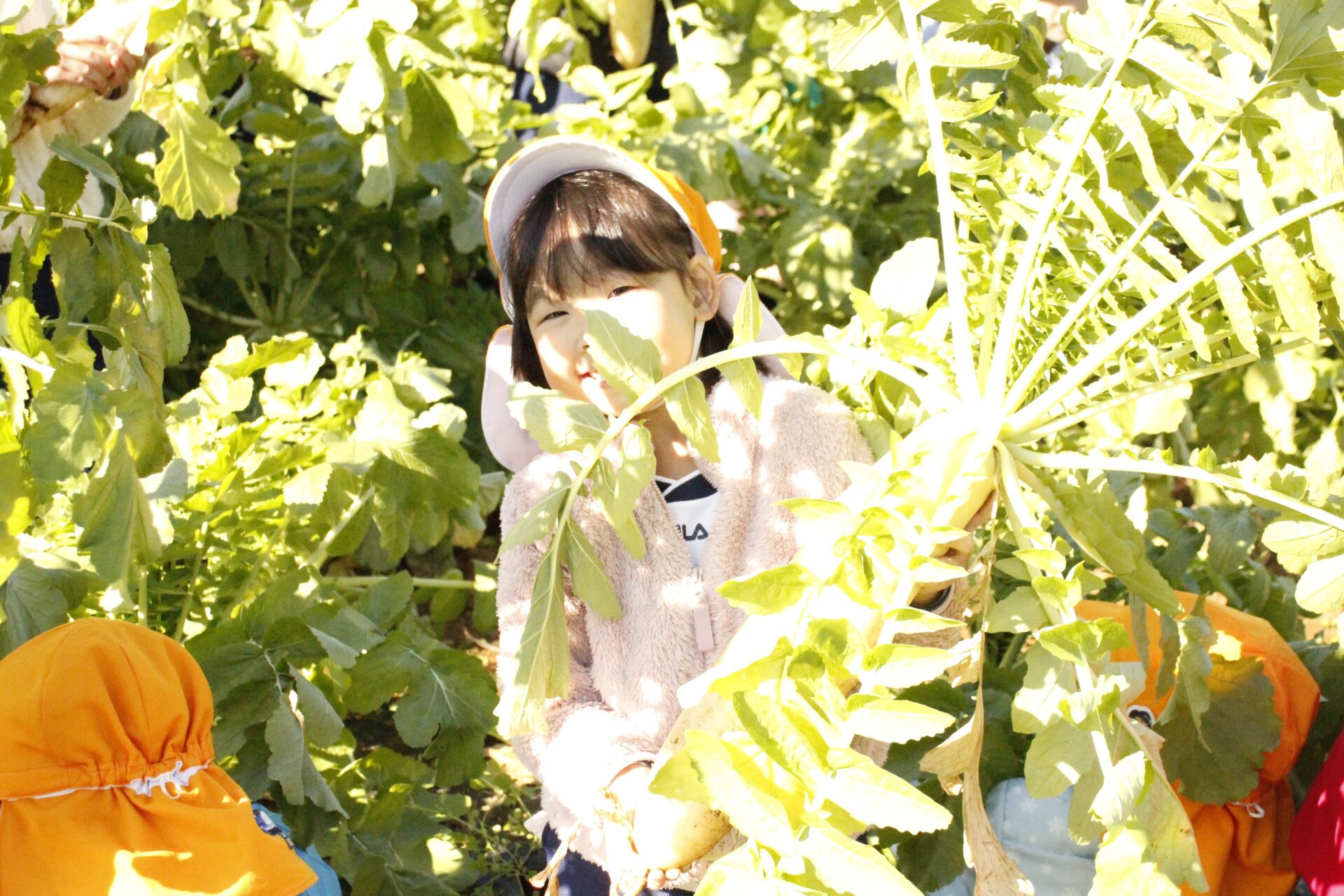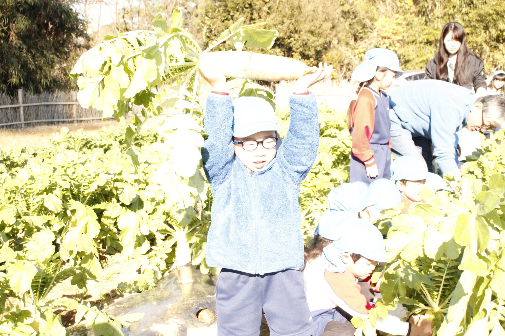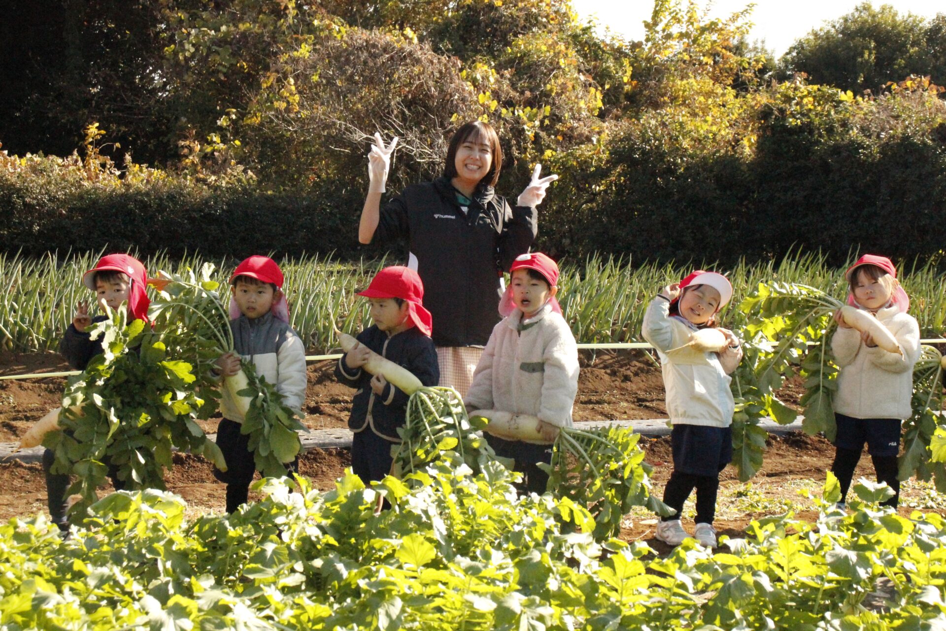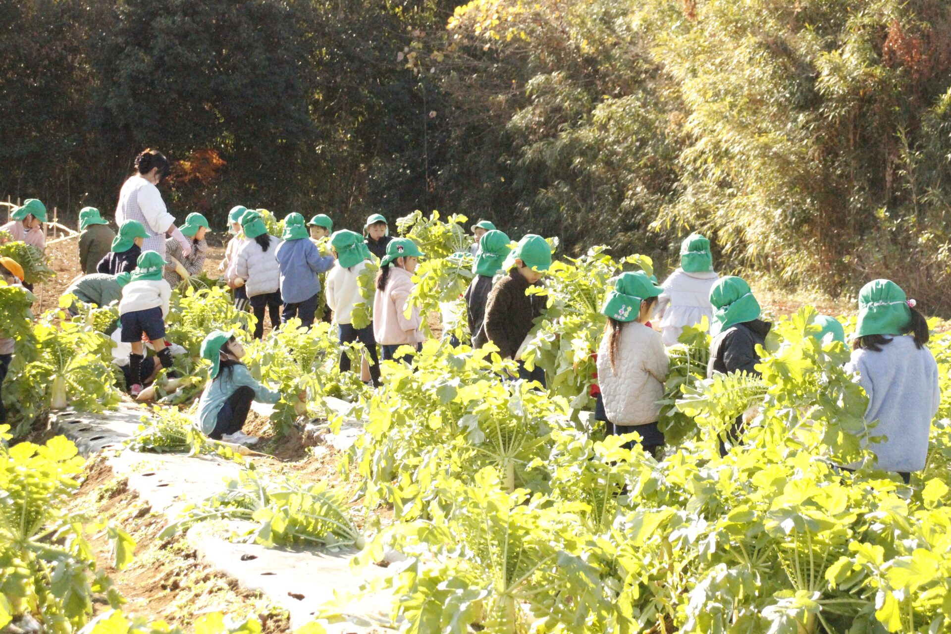 皆上手に大根を引き抜き、大きくて重い大根を頑張って運んでいました。子ども達には、「大根の葉っぱも食べられるんだよ」と伝えると、びっくりしている子もいました。このような収穫体験を通して、収穫の喜び、食への関心の高まり、農家さんへの感謝の姿勢などが育ってくれたら嬉しいです。