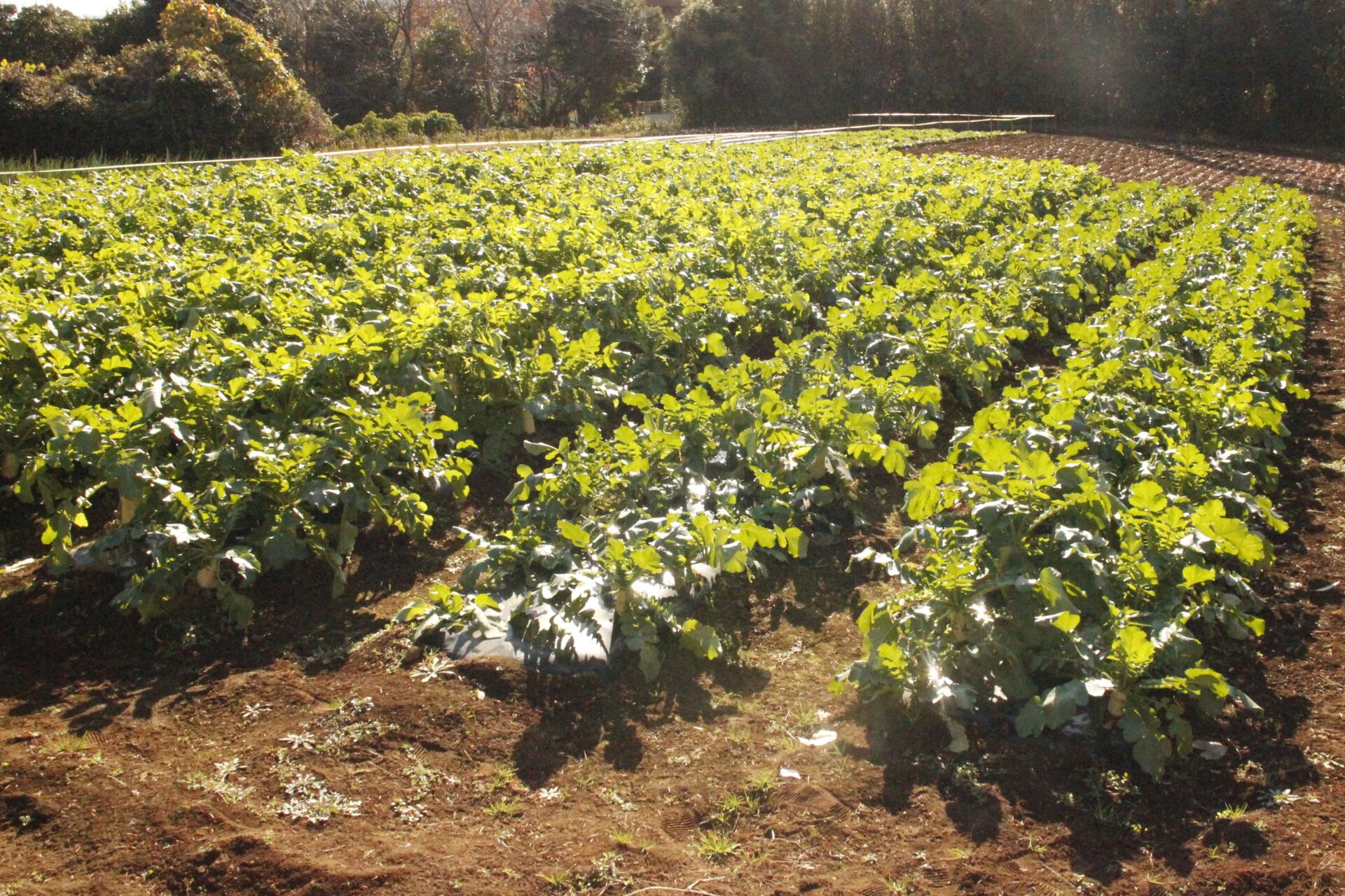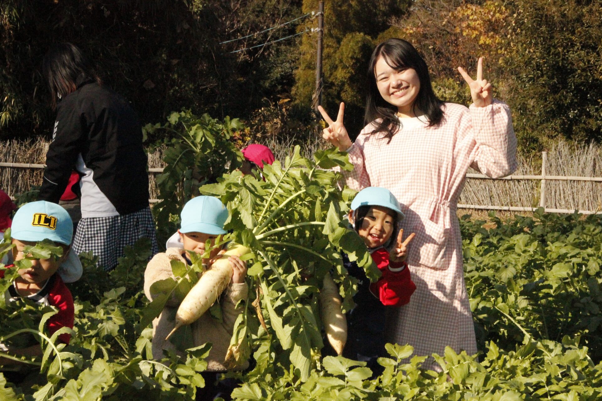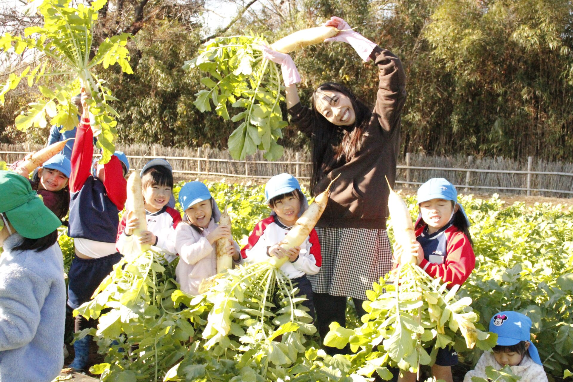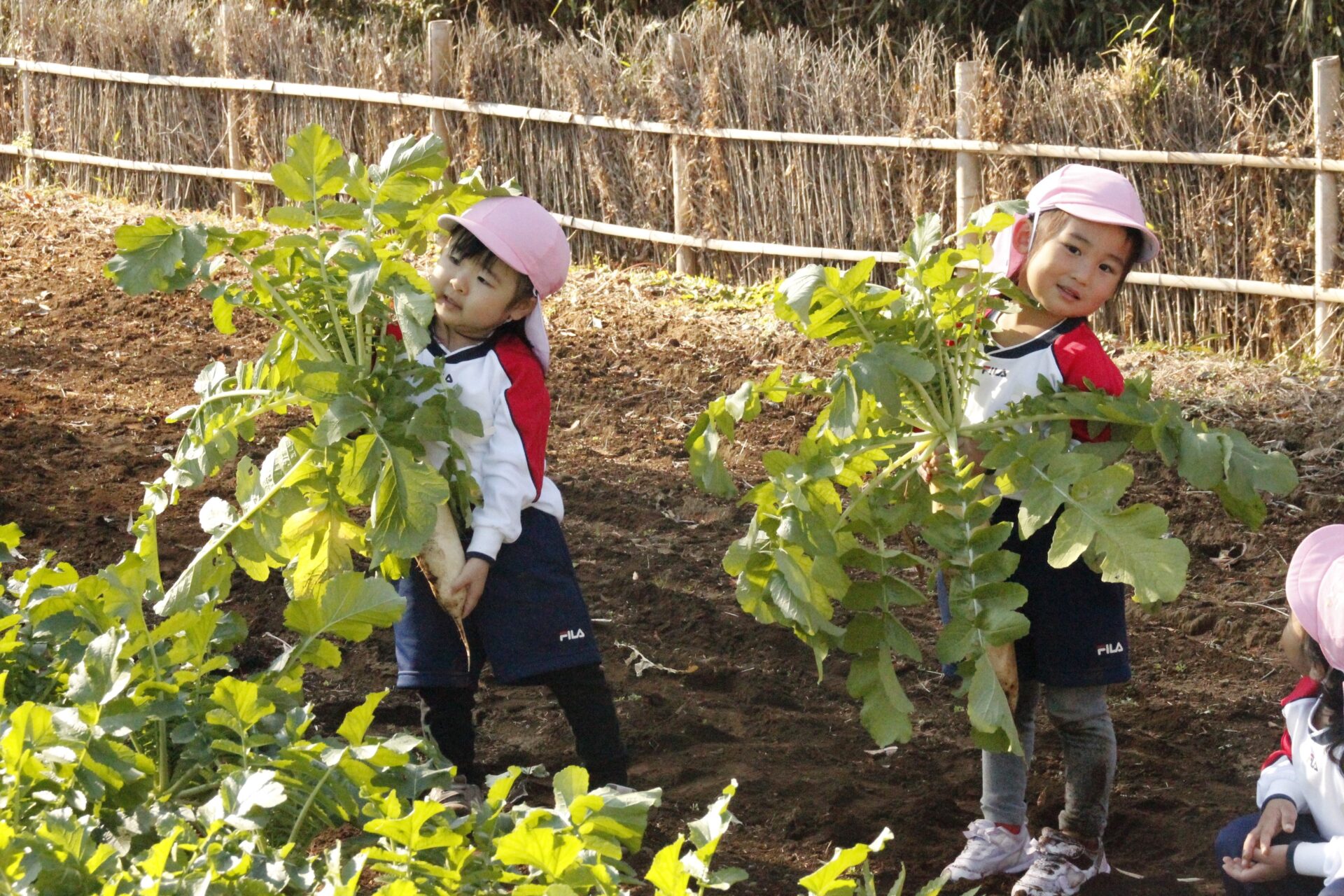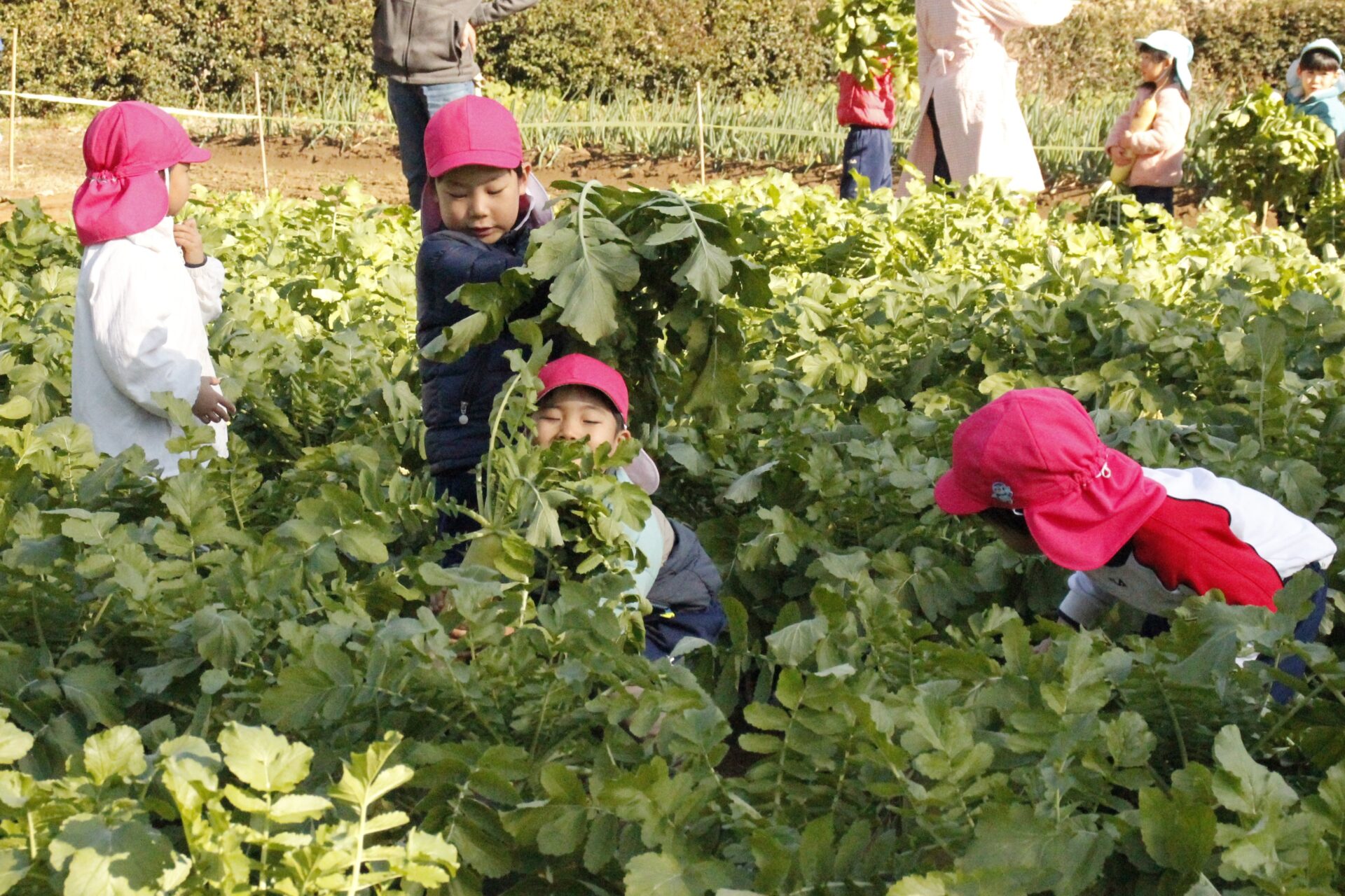 皆上手に大根を引き抜き、大きくて重い大根を頑張って運んでいました。子ども達には、「大根の葉っぱも食べられるんだよ」と伝えると、びっくりしている子もいました。このような収穫体験を通して、収穫の喜び、食への関心の高まり、農家さんへの感謝の姿勢などが育ってくれたら嬉しいです。