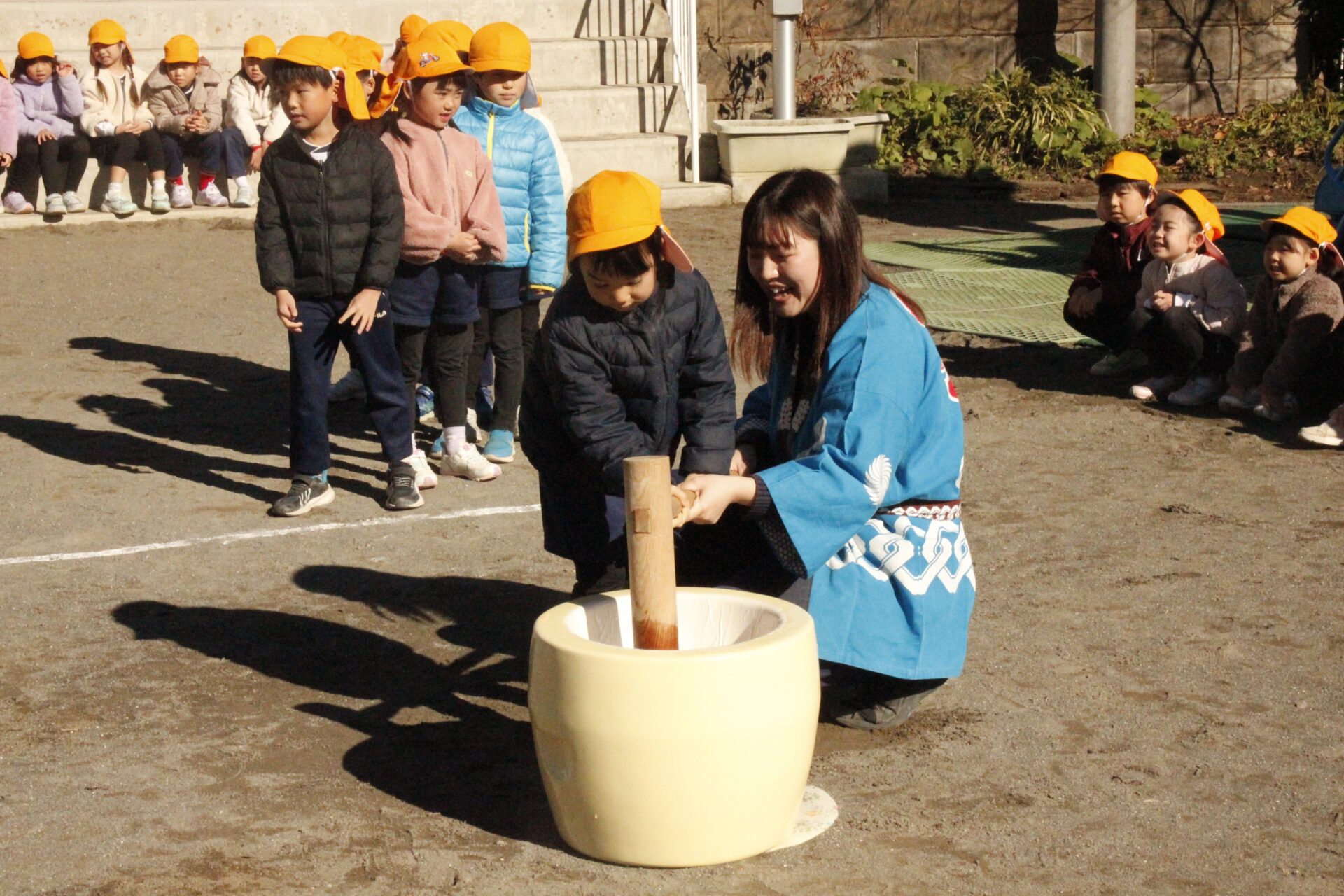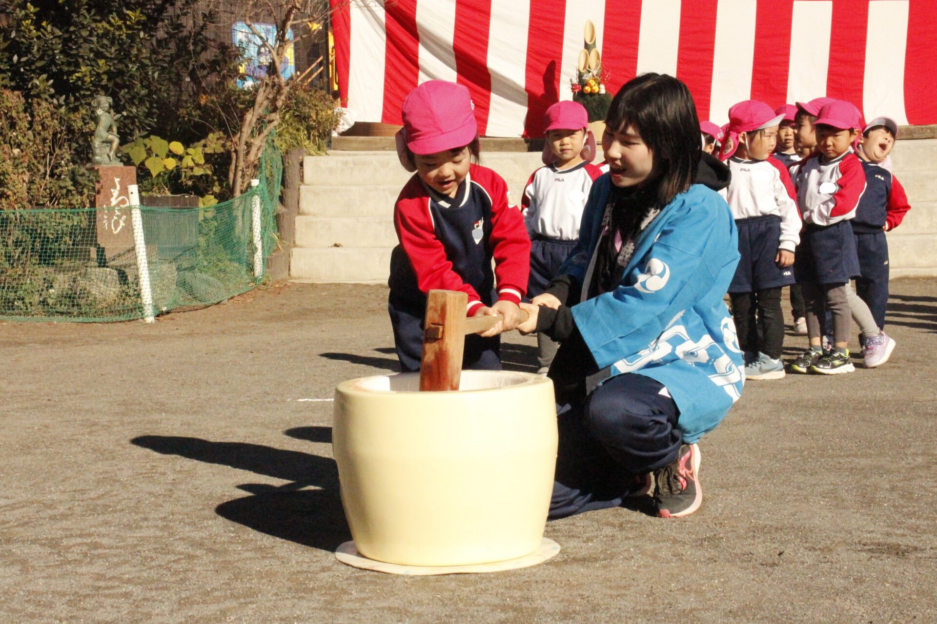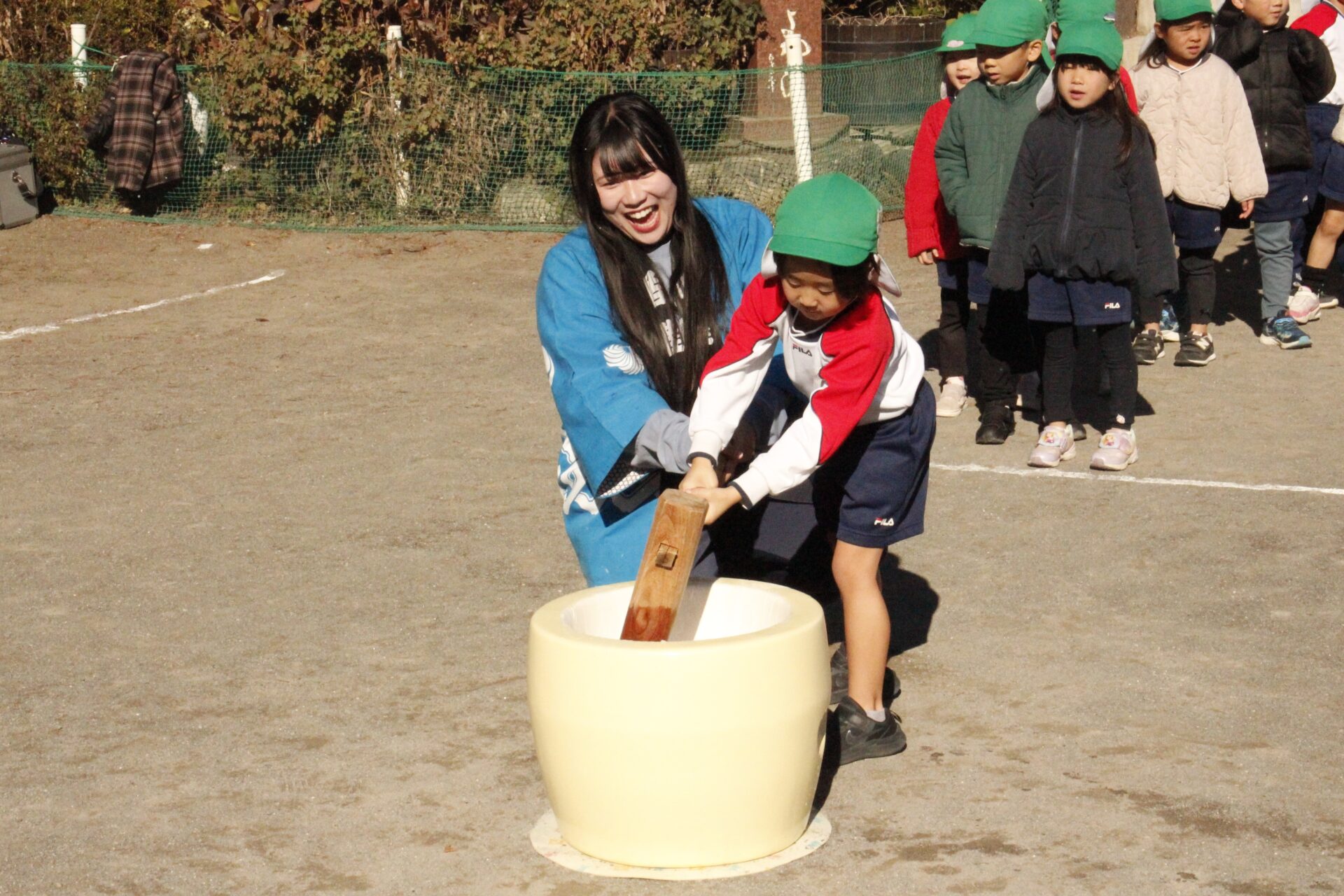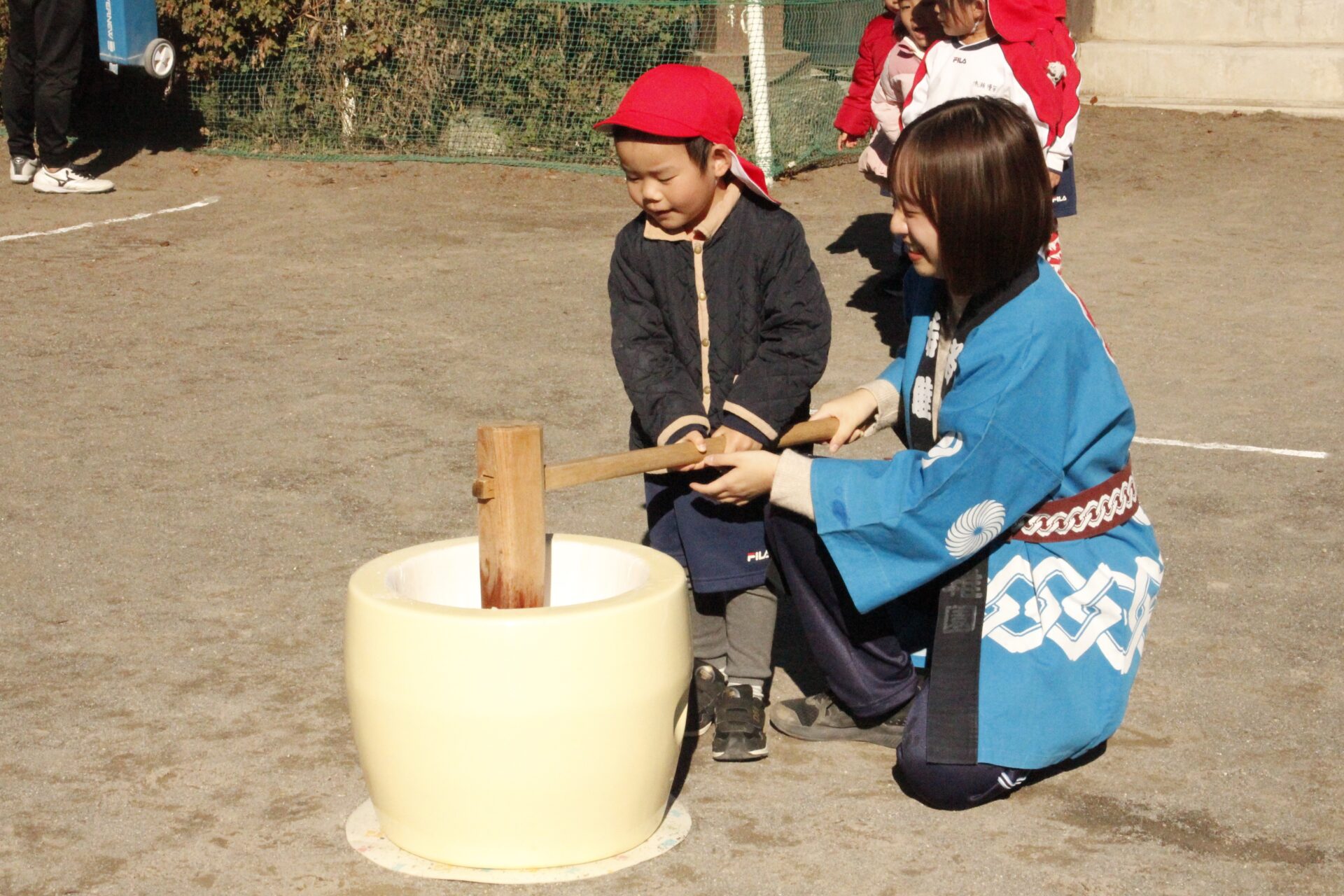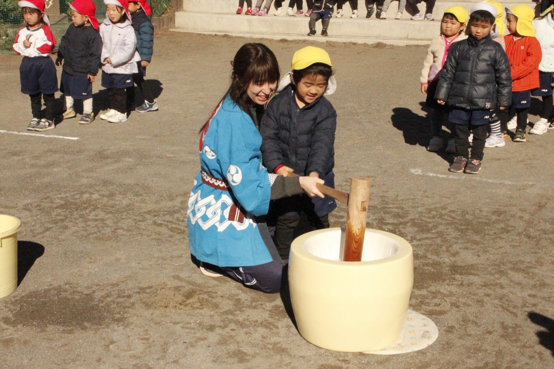 12月15日(月)みほ幼稚園園庭にてお餅つきを行いました。みほ幼稚園では、お子様に日本の伝統文化を継承する意味から毎年12月にお餅つきを行っています。必ず皆がお餅をつけるようにし、ついたお餅は鏡餅にしています。鏡餅は神様へのお供え物であり、1年の無事や健康を願ったり、幸福を分けてもらう意味があります。そんな意味を子ども達に伝えながら、子ども達の幸福や健やかな成長を願い、これからも日々の保育に努めてまいります。