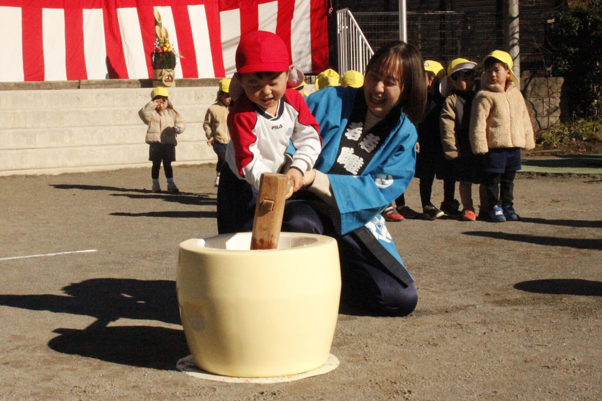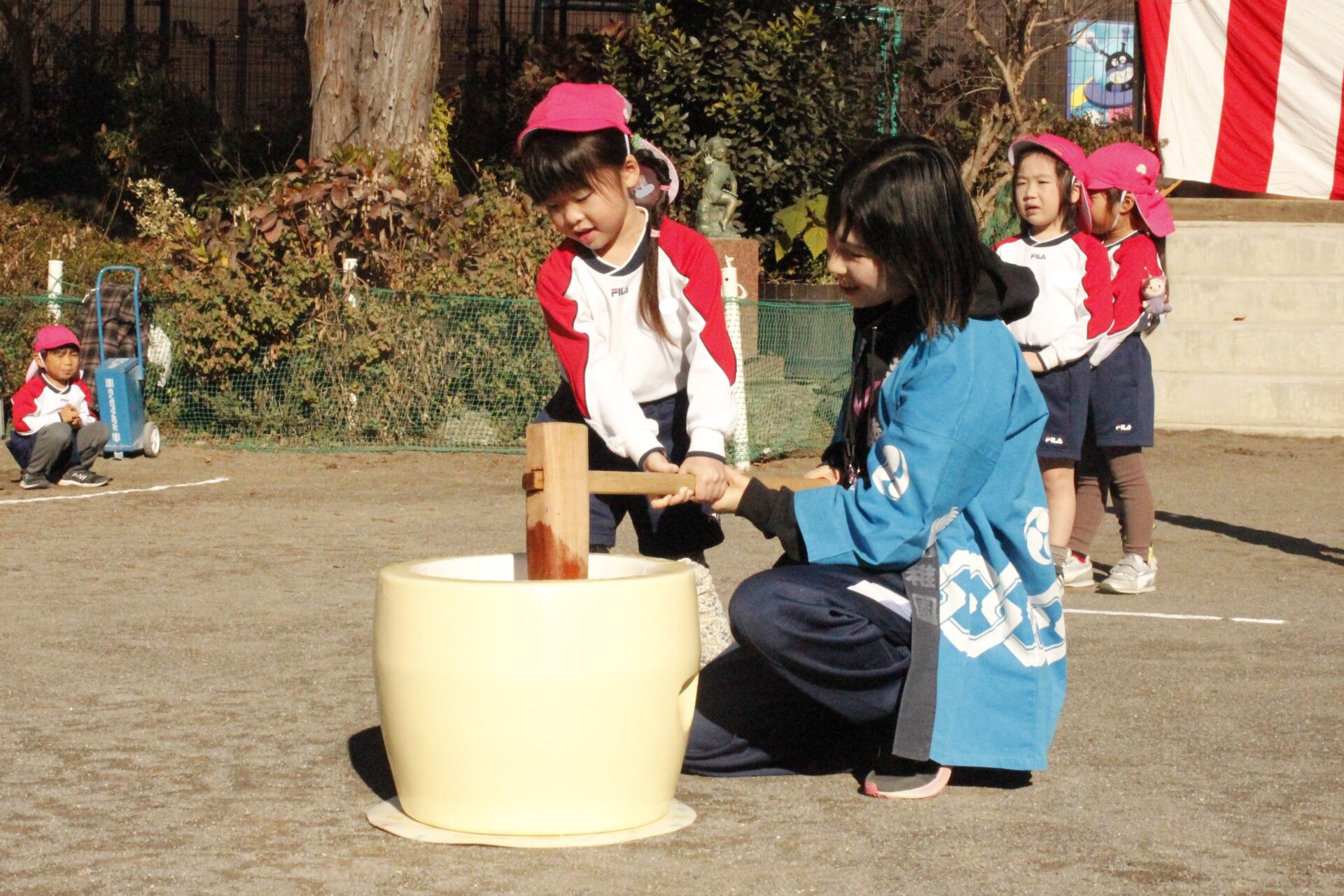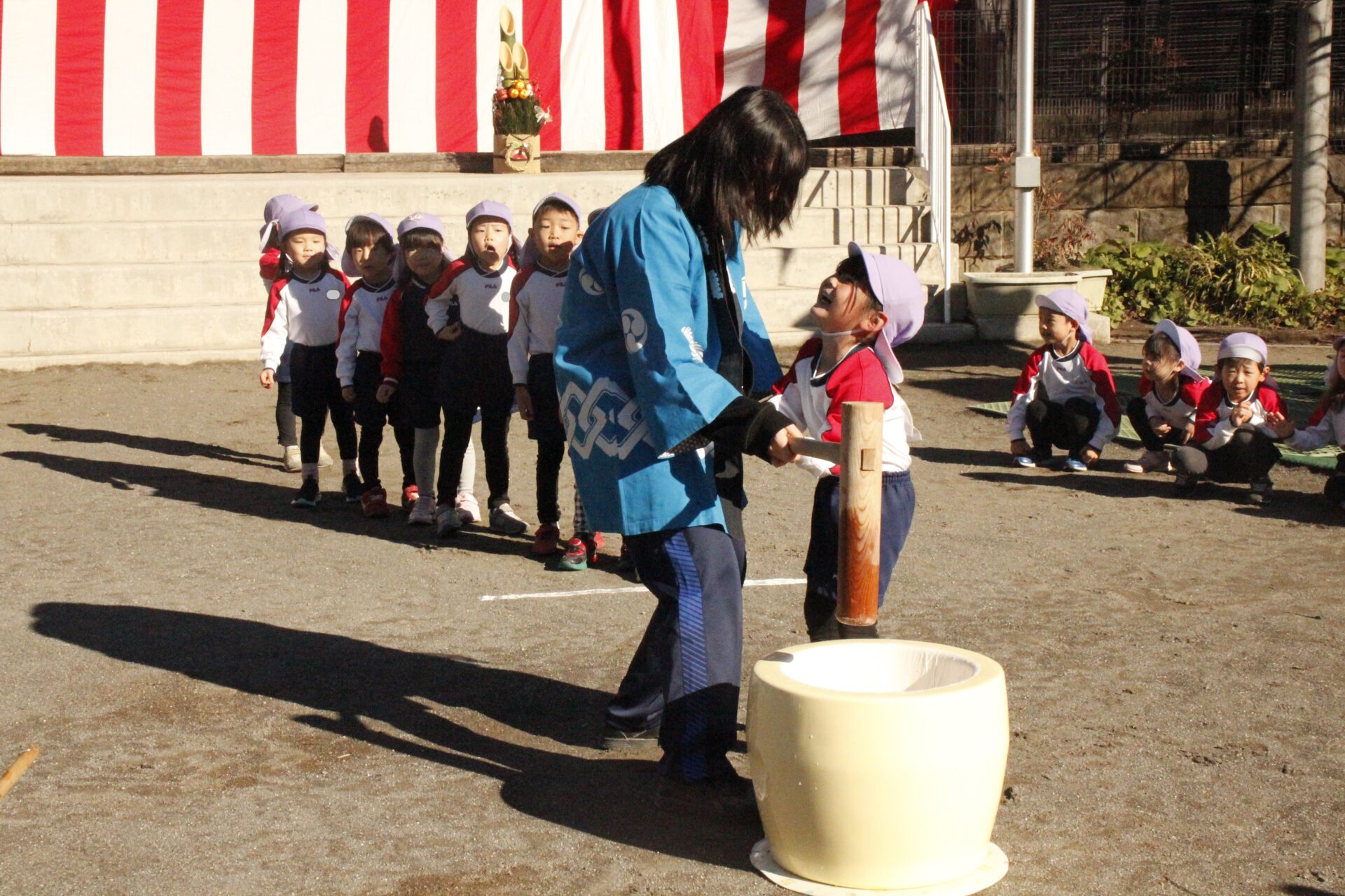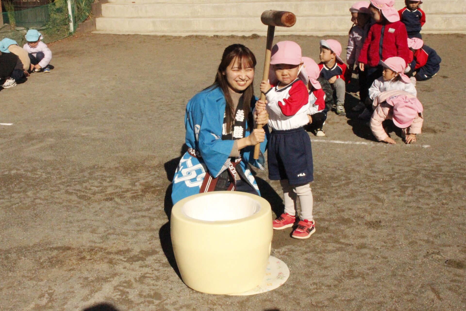 12月15日(月)みほ幼稚園園庭にてお餅つきを行いました。みほ幼稚園では、お子様に日本の伝統文化を継承する意味から毎年12月にお餅つきを行っています。必ず皆がお餅をつけるようにし、ついたお餅は鏡餅にしています。鏡餅は神様へのお供え物であり、1年の無事や健康を願ったり、幸福を分けてもらう意味があります。そんな意味を子ども達に伝えながら、子ども達の幸福や健やかな成長を願い、これからも日々の保育に努めてまいります。