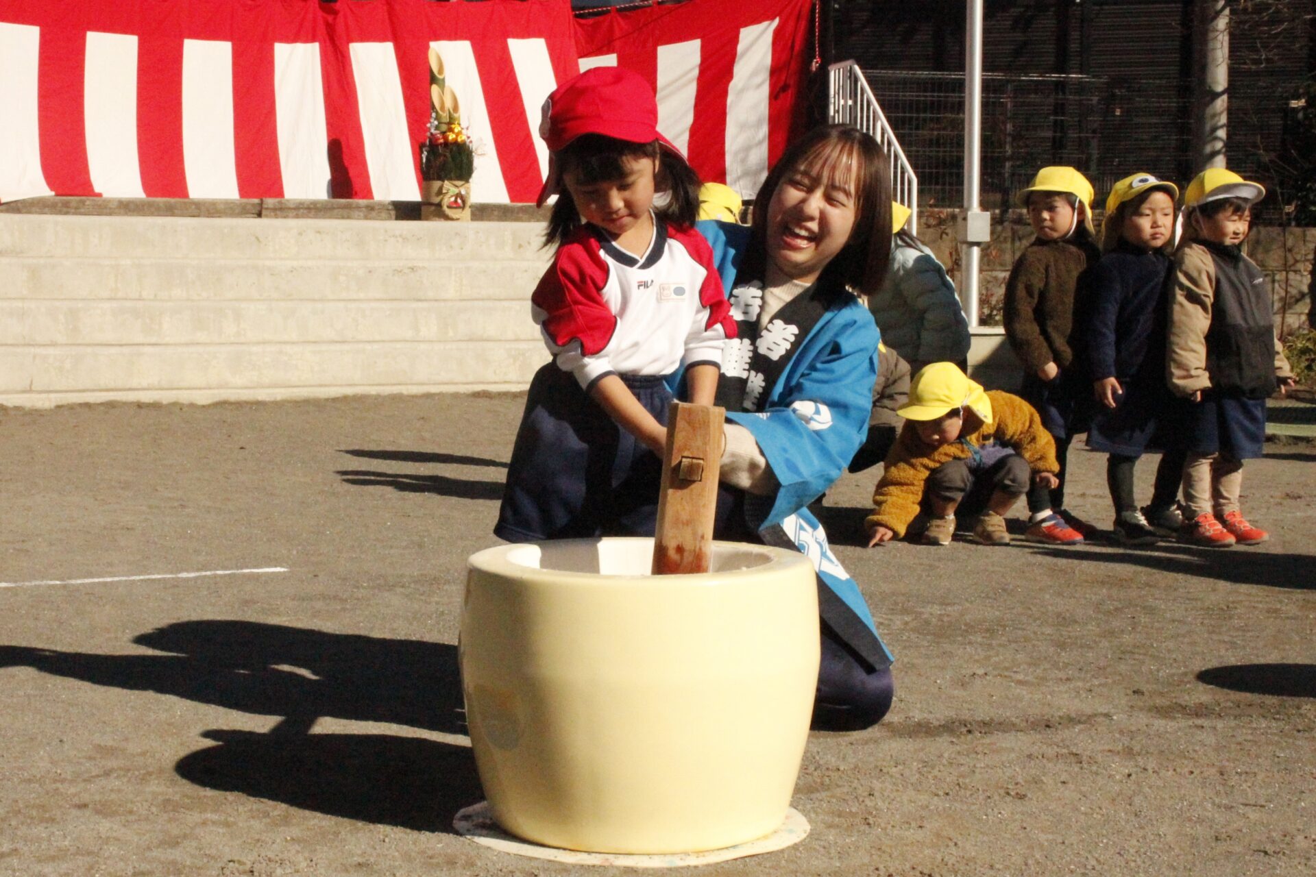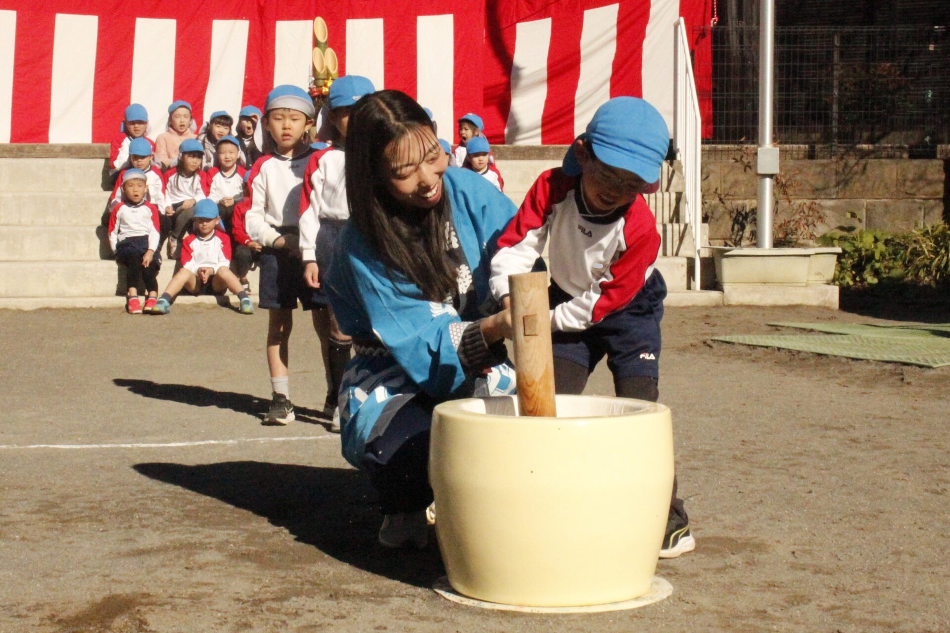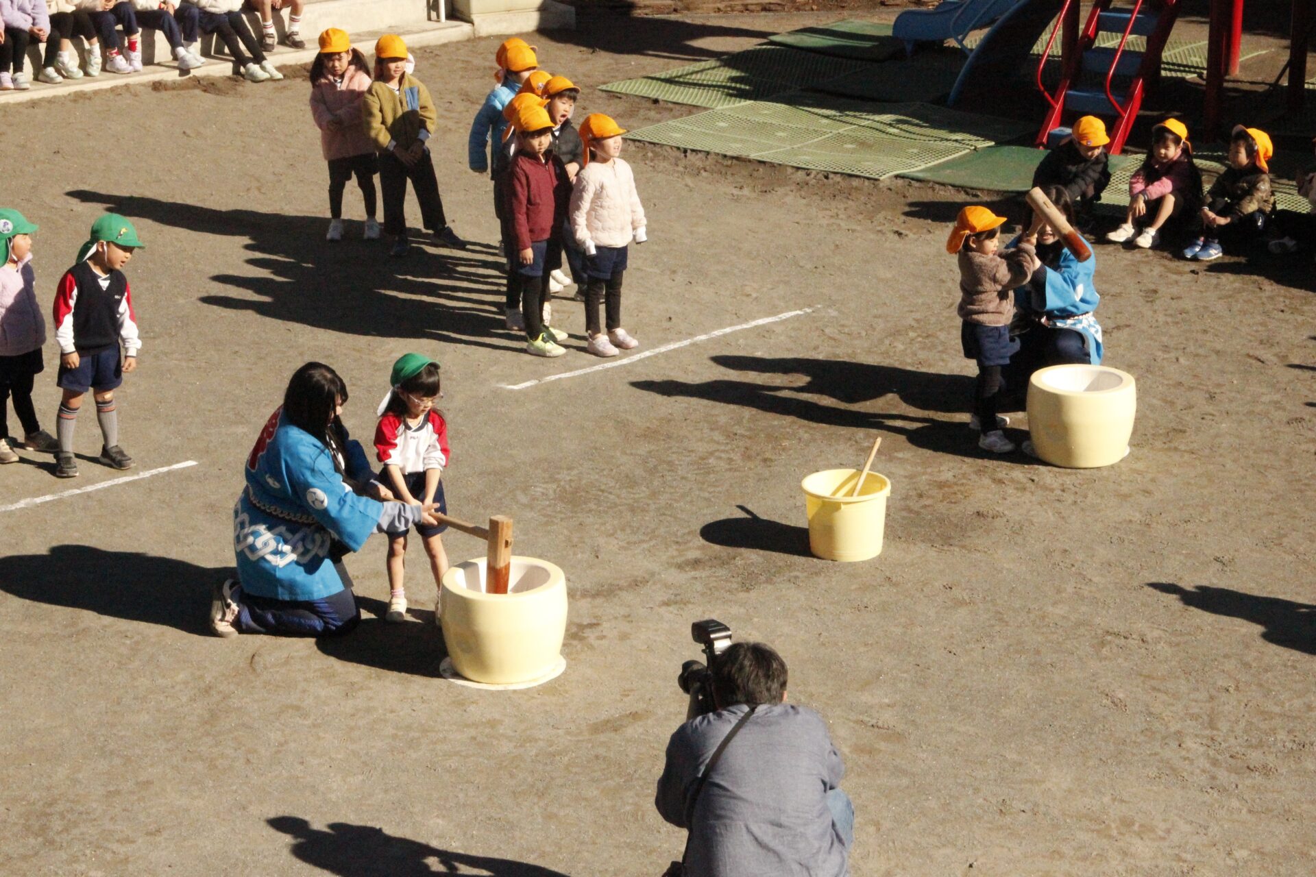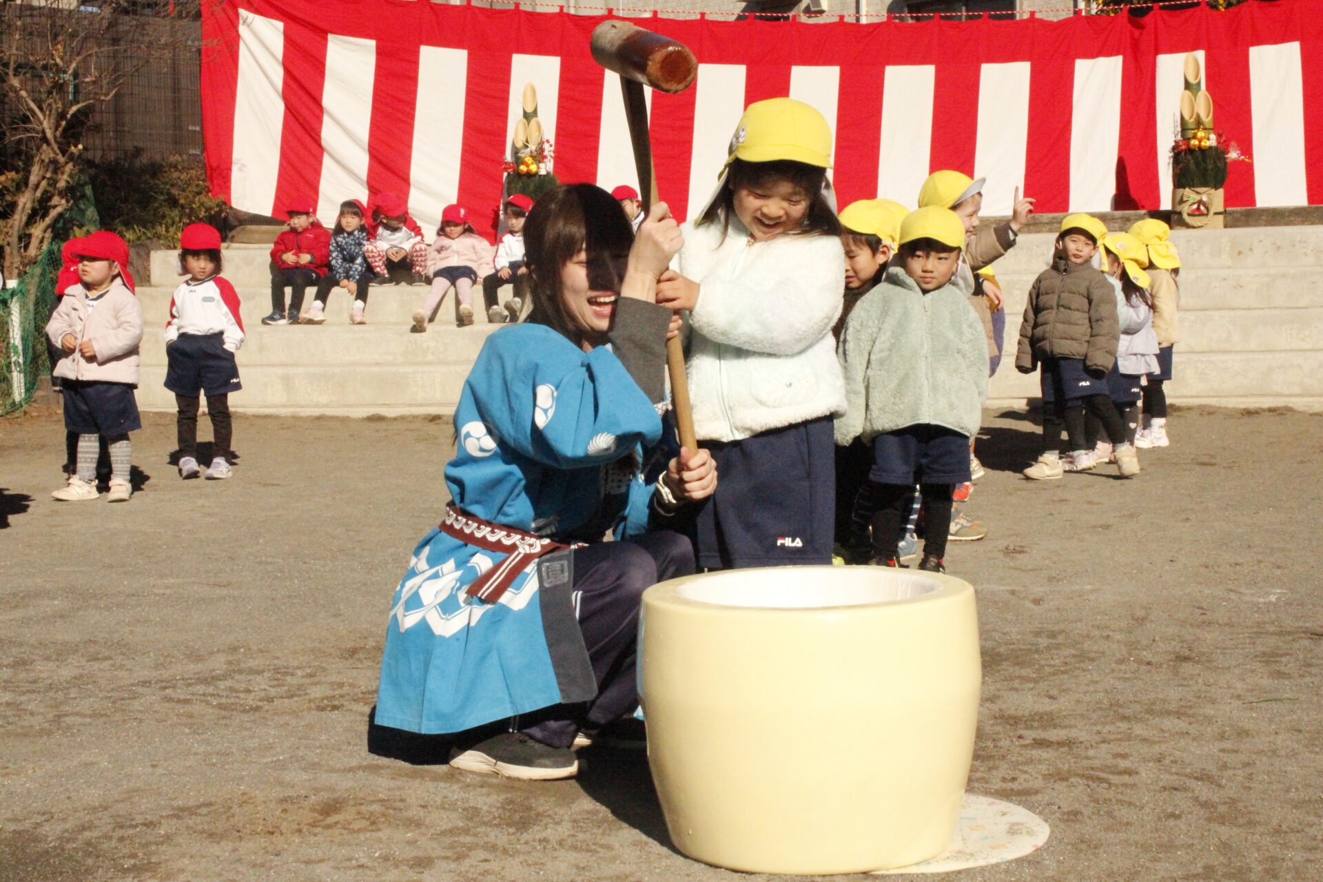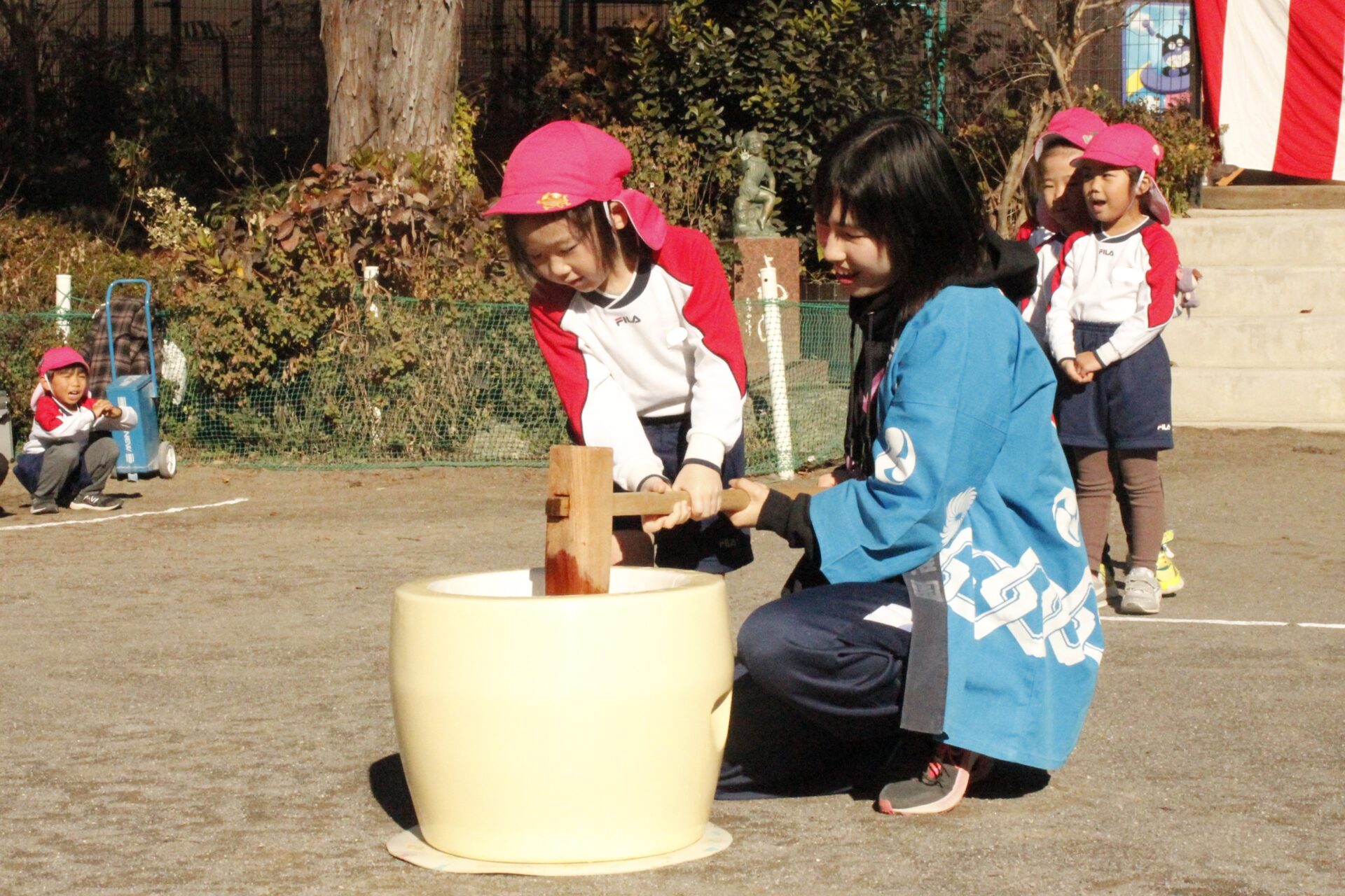 12月15日(月)みほ幼稚園園庭にてお餅つきを行いました。みほ幼稚園では、お子様に日本の伝統文化を継承する意味から毎年12月にお餅つきを行っています。必ず皆がお餅をつけるようにし、ついたお餅は鏡餅にしています。鏡餅は神様へのお供え物であり、1年の無事や健康を願ったり、幸福を分けてもらう意味があります。そんな意味を子ども達に伝えながら、子ども達の幸福や健やかな成長を願い、これからも日々の保育に努めてまいります。
