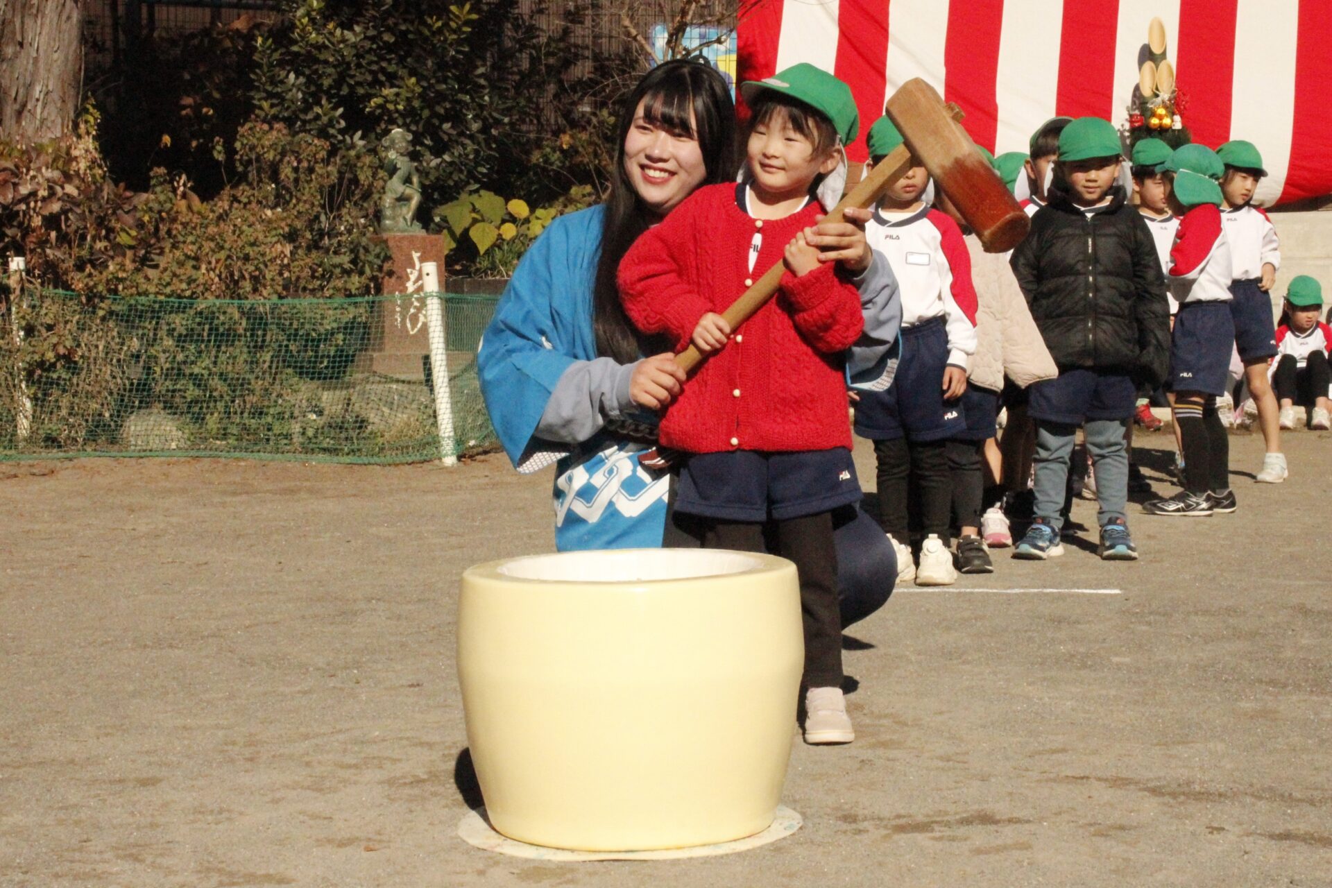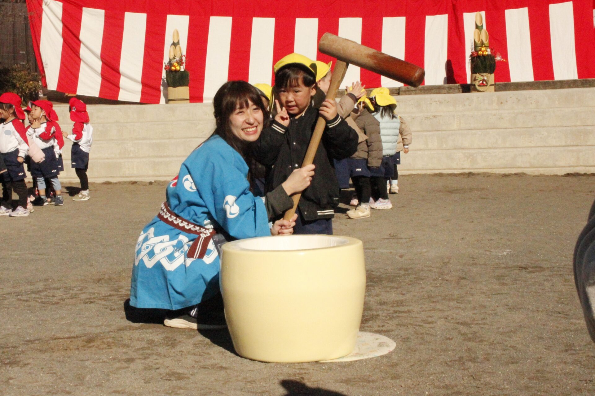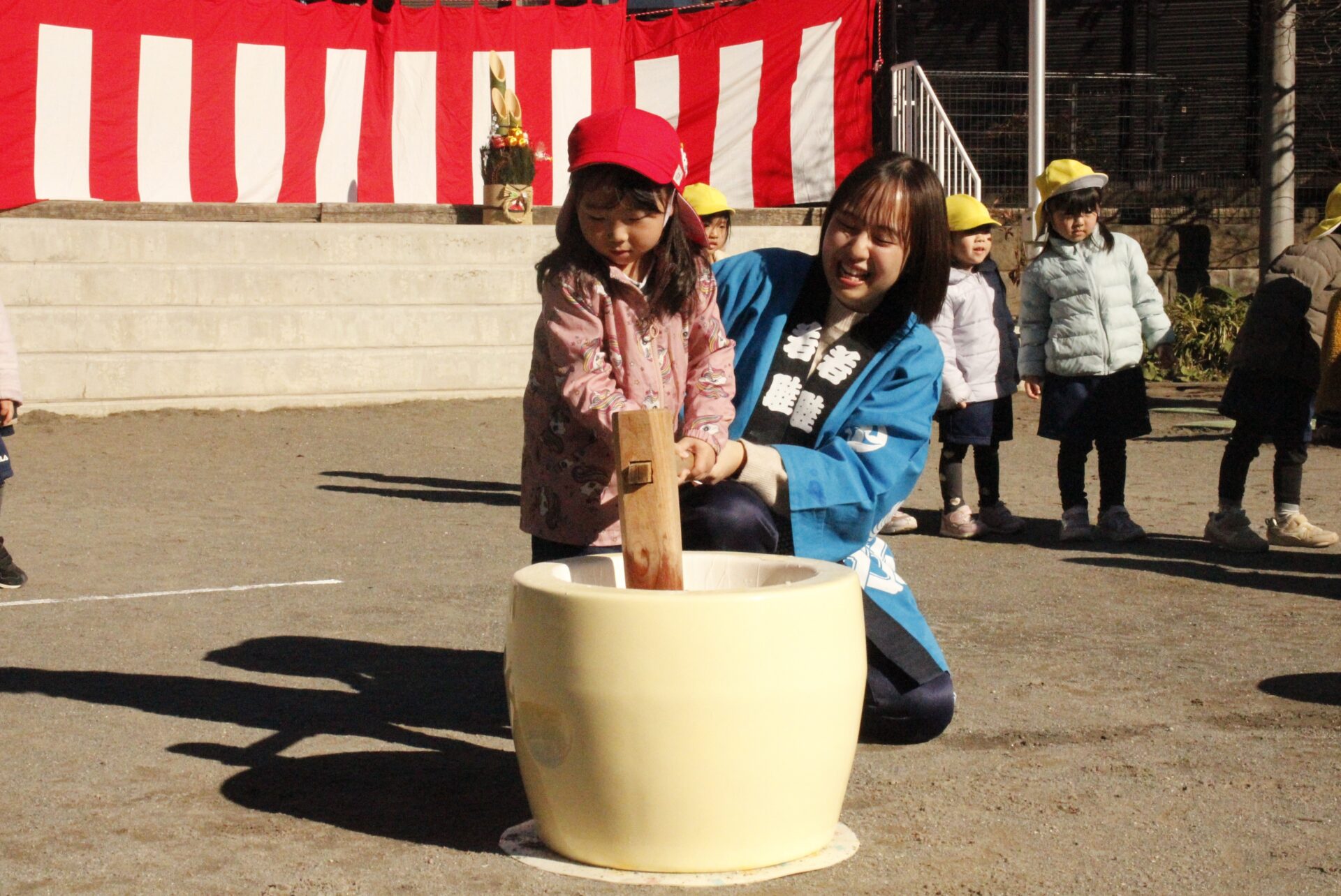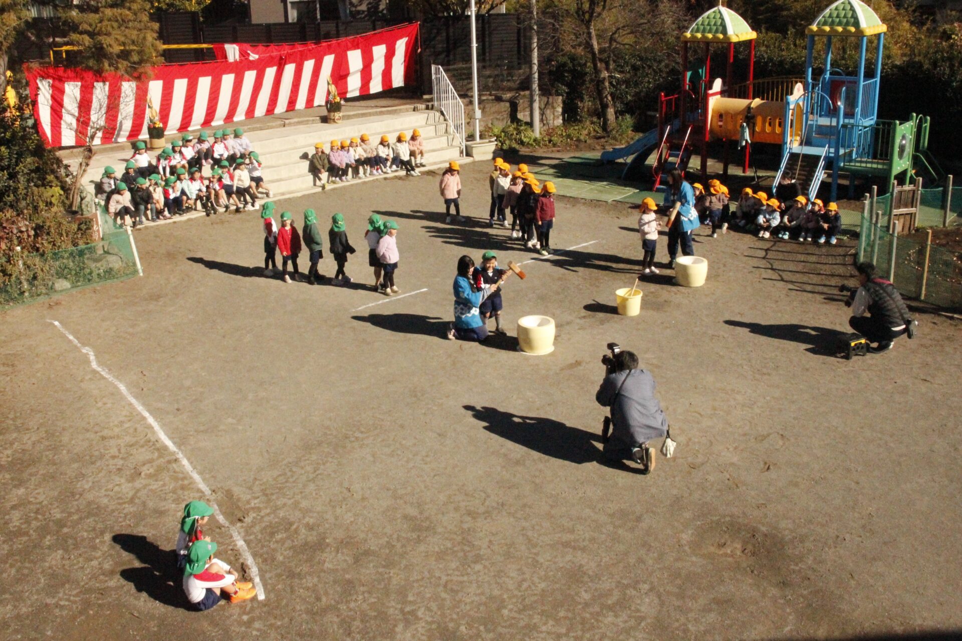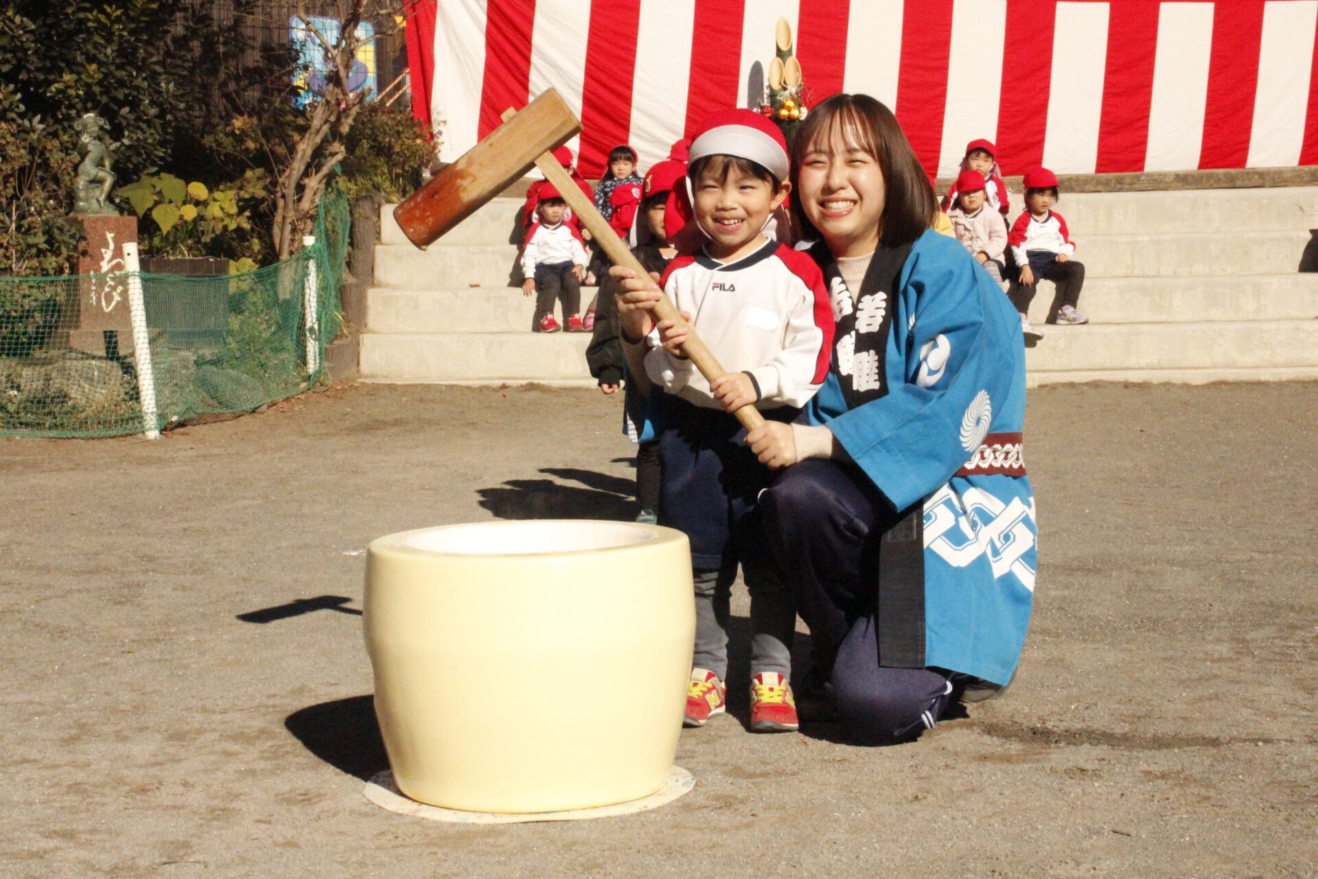 12月15日(月)みほ幼稚園園庭にてお餅つきを行いました。みほ幼稚園では、お子様に日本の伝統文化を継承する意味から毎年12月にお餅つきを行っています。必ず皆がお餅をつけるようにし、ついたお餅は鏡餅にしています。鏡餅は神様へのお供え物であり、1年の無事や健康を願ったり、幸福を分けてもらう意味があります。そんな意味を子ども達に伝えながら、子ども達の幸福や健やかな成長を願い、これからも日々の保育に努めてまいります。