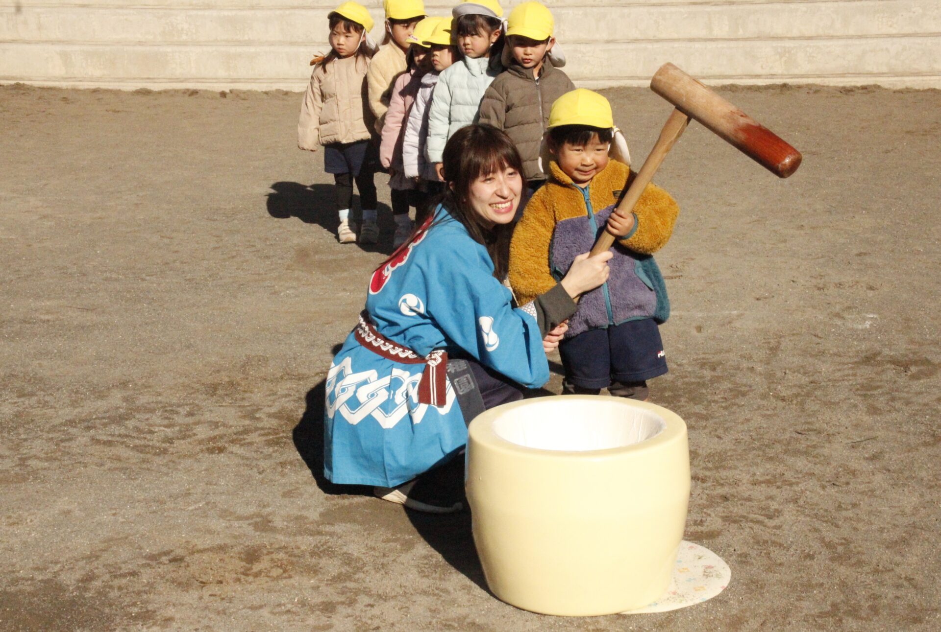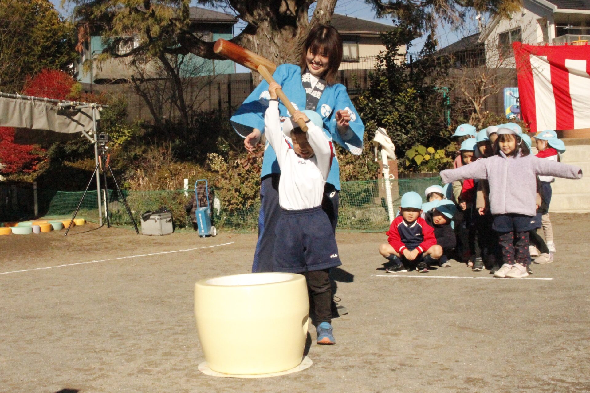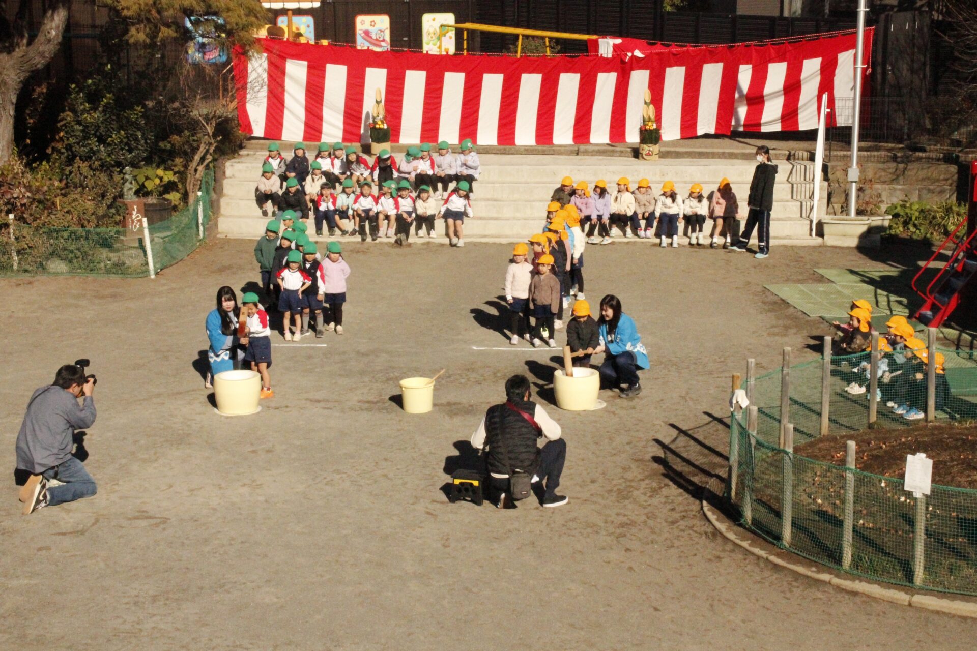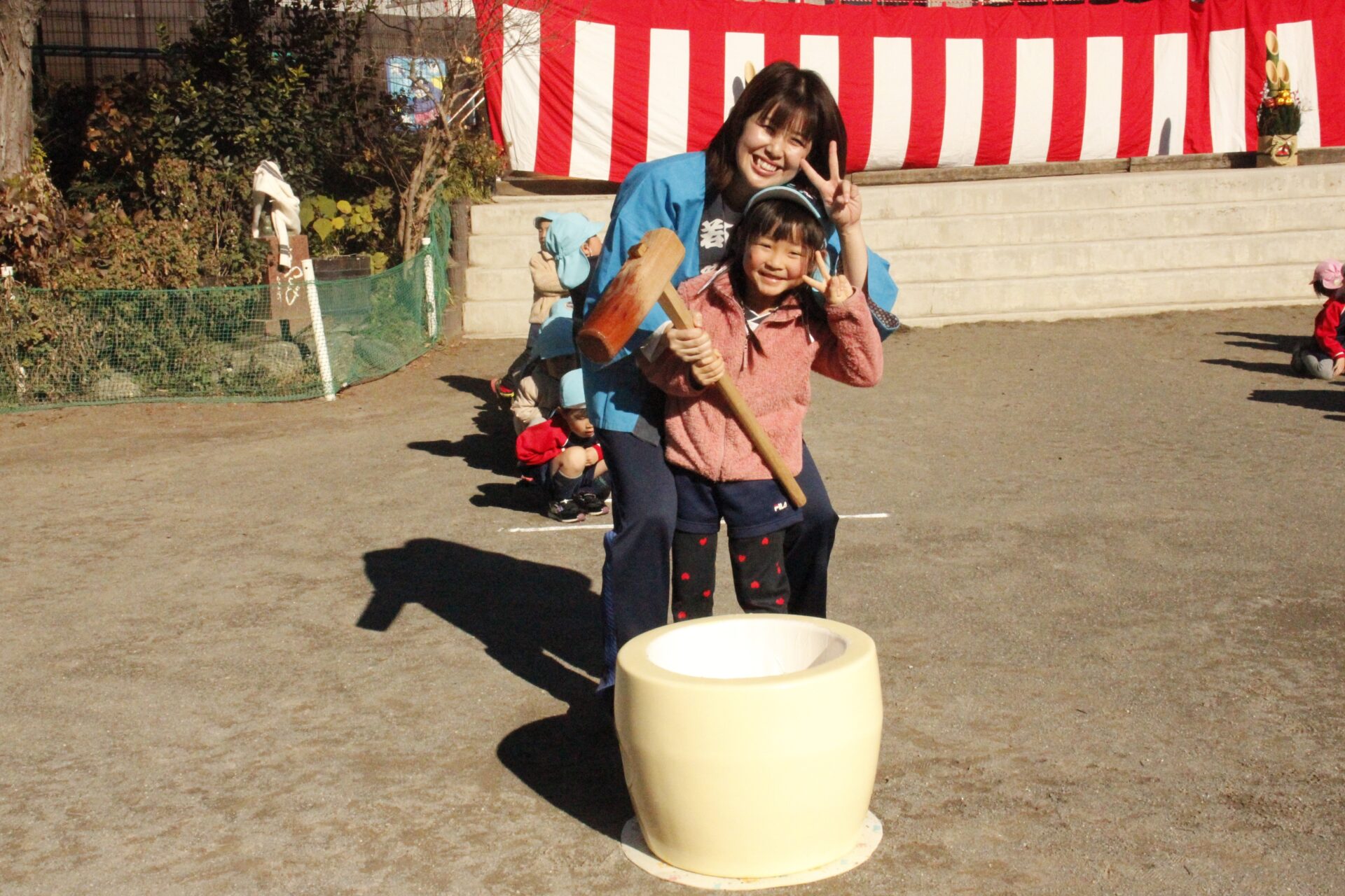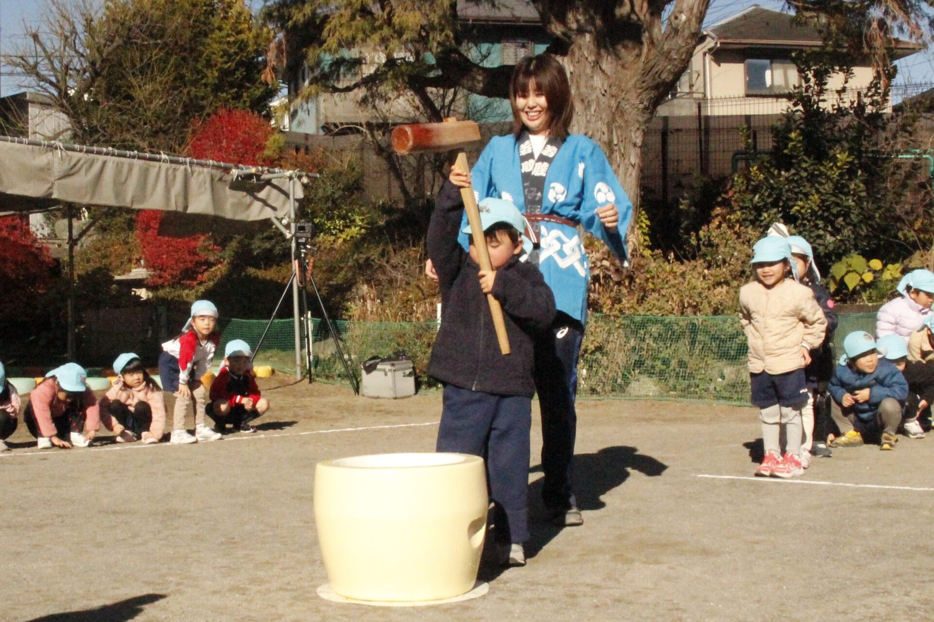 12月15日(月)みほ幼稚園園庭にてお餅つきを行いました。みほ幼稚園では、お子様に日本の伝統文化を継承する意味から毎年12月にお餅つきを行っています。必ず皆がお餅をつけるようにし、ついたお餅は鏡餅にしています。鏡餅は神様へのお供え物であり、1年の無事や健康を願ったり、幸福を分けてもらう意味があります。そんな意味を子ども達に伝えながら、子ども達の幸福や健やかな成長を願い、これからも日々の保育に努めてまいります。