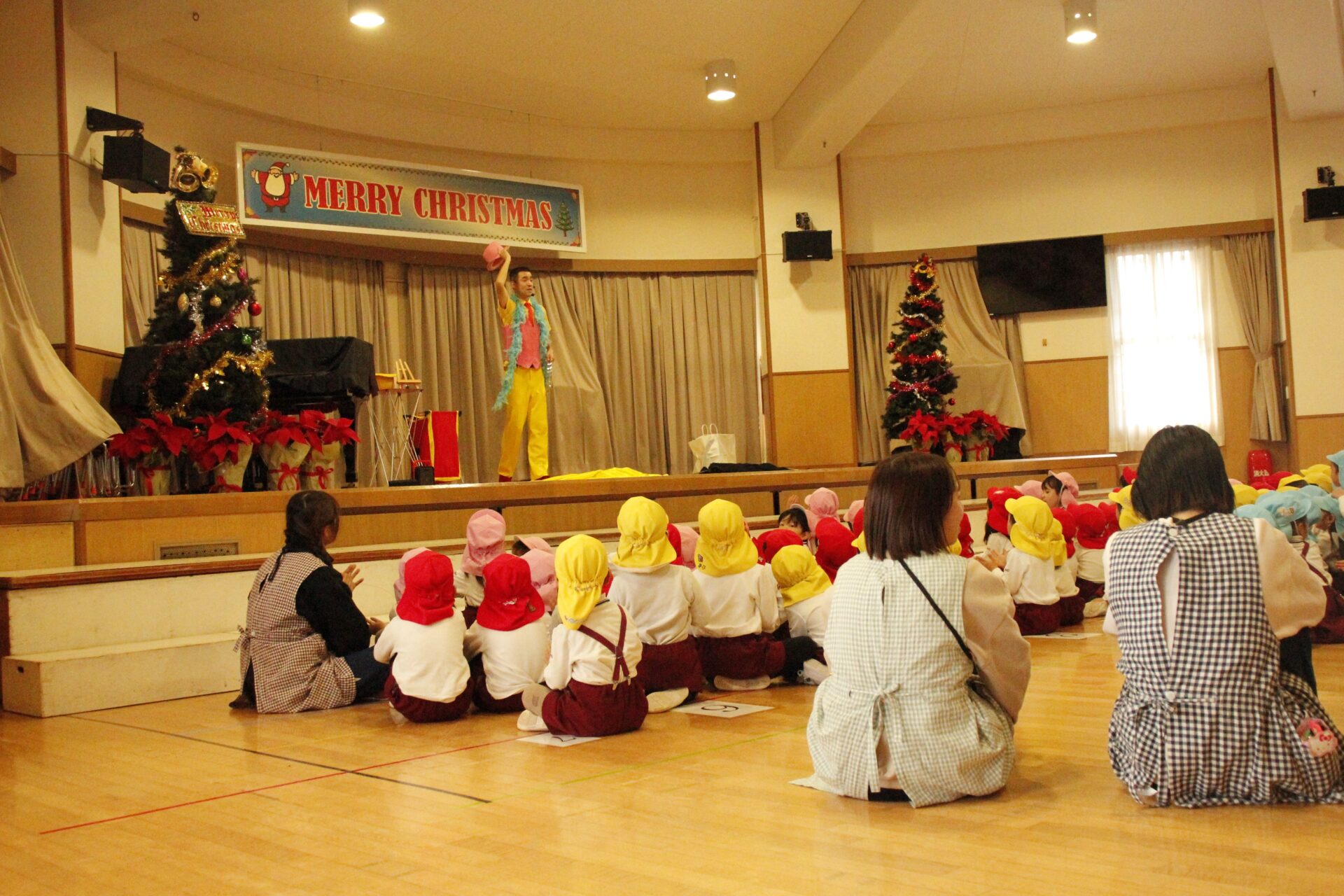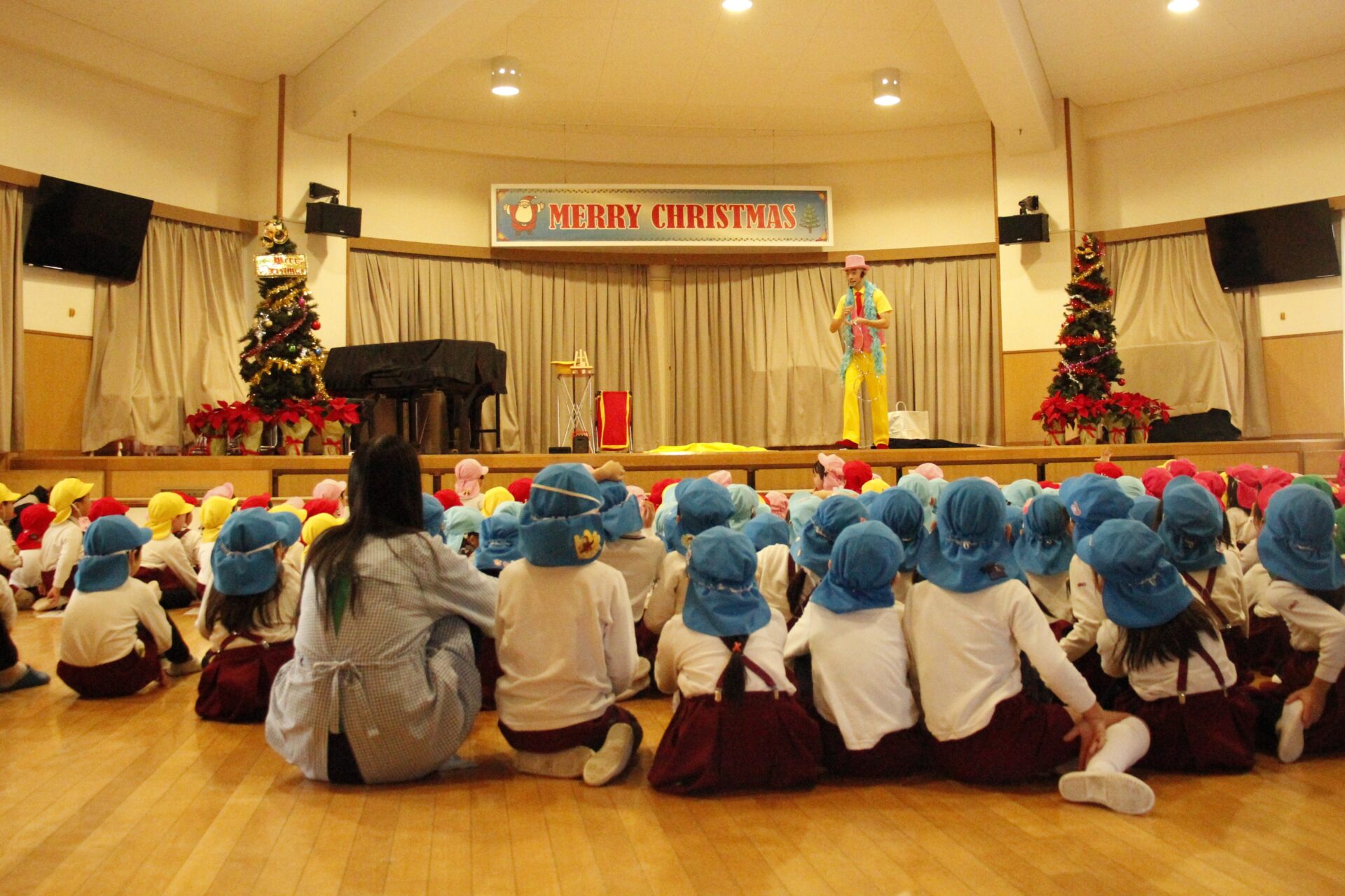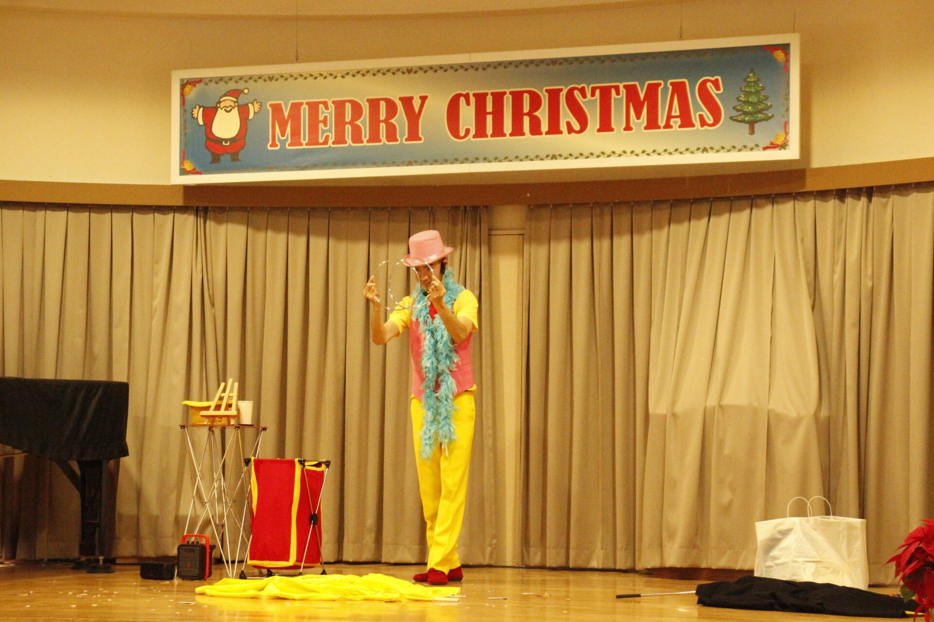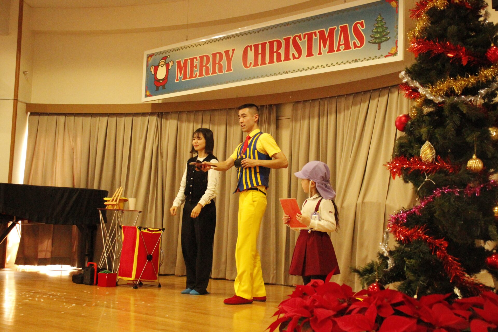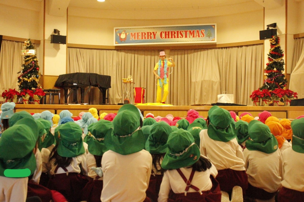 2学期の終業日の12月18日(木)みほ幼稚園ホールにてクリスマス会を行いました。クリスマス会では、パフォーマーの『マジカルおじさん』に楽しいマジックショーをしてもらいました。