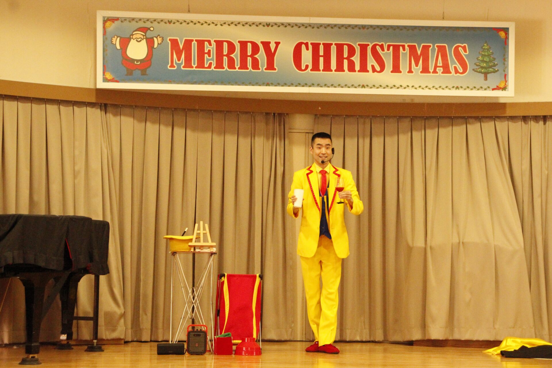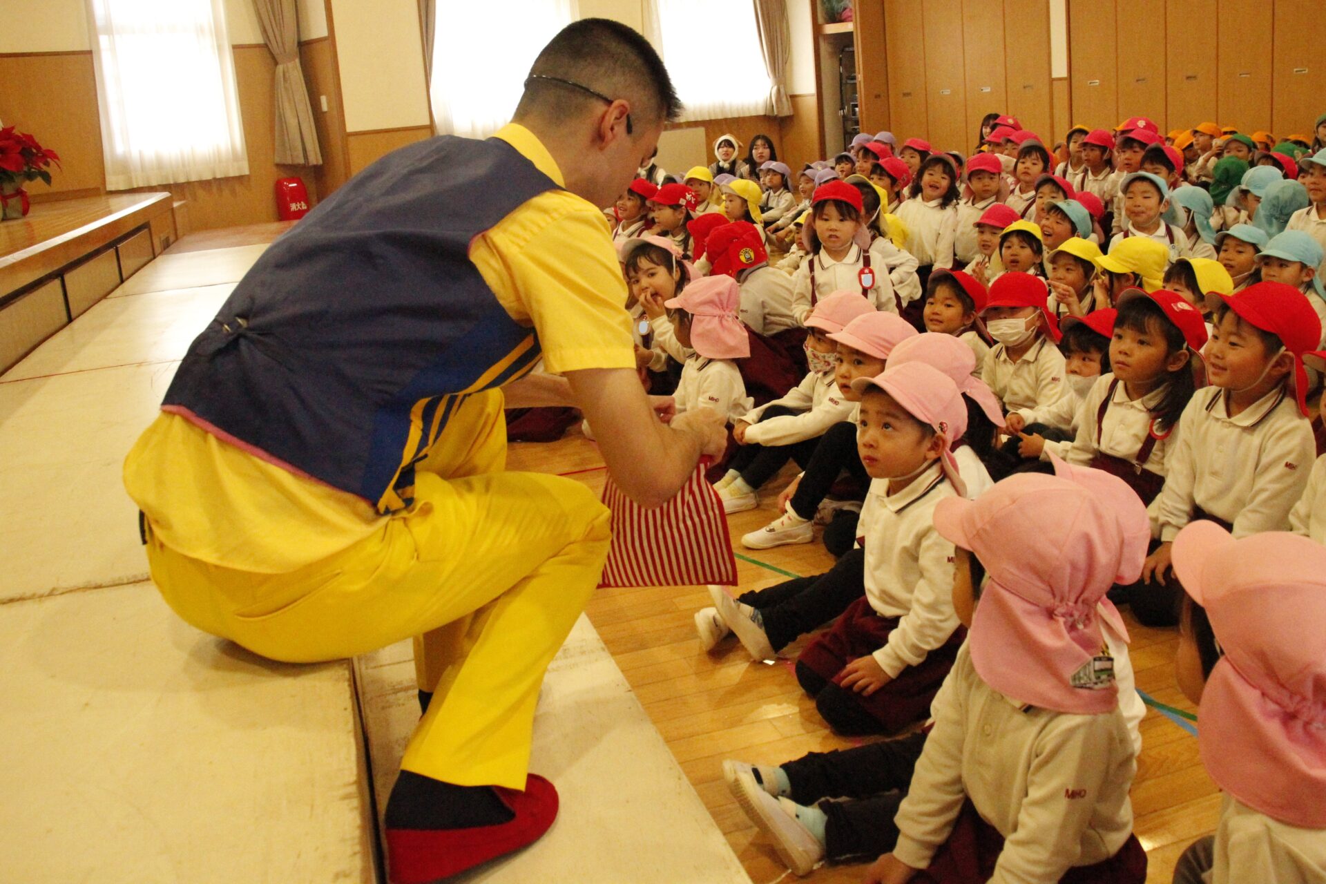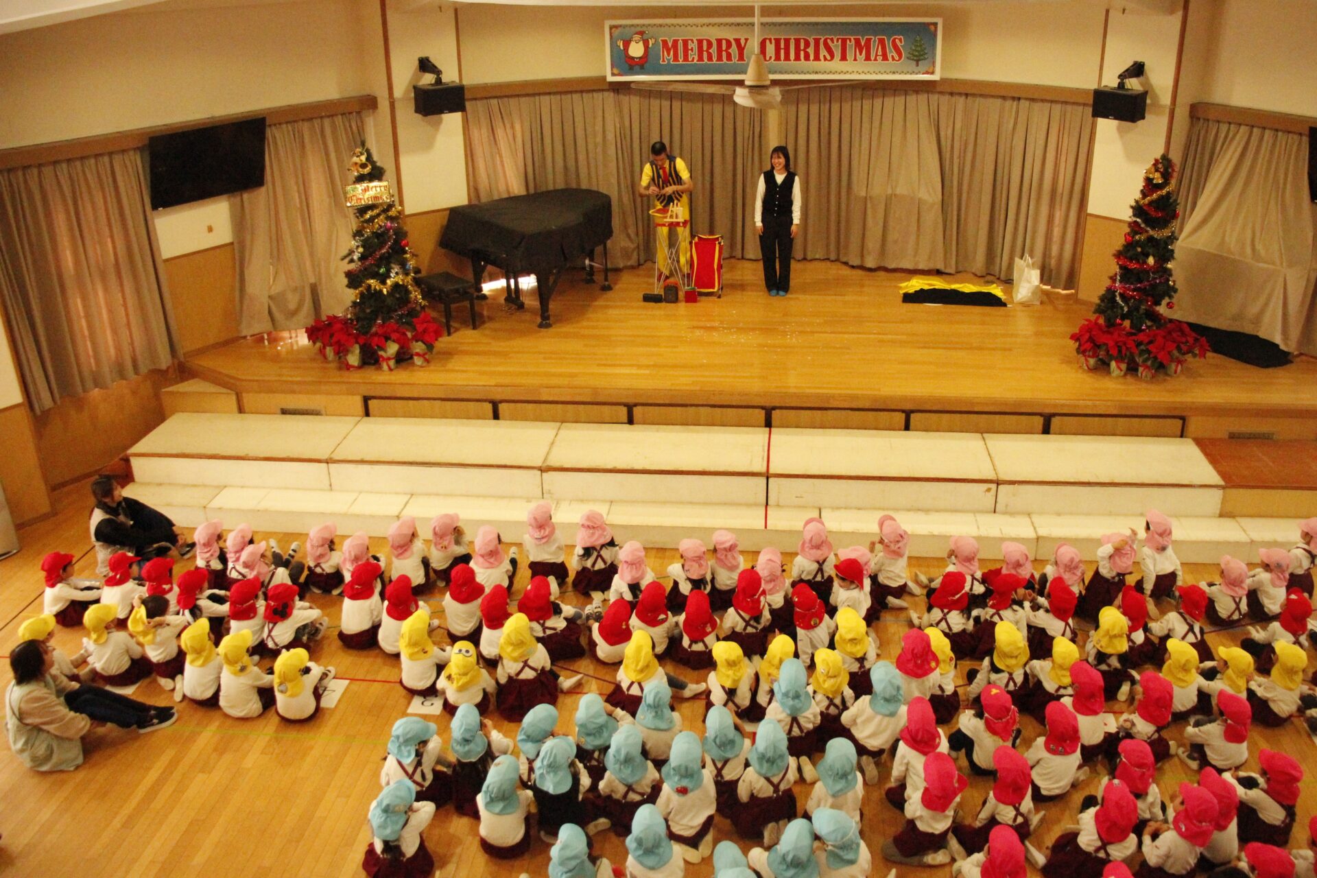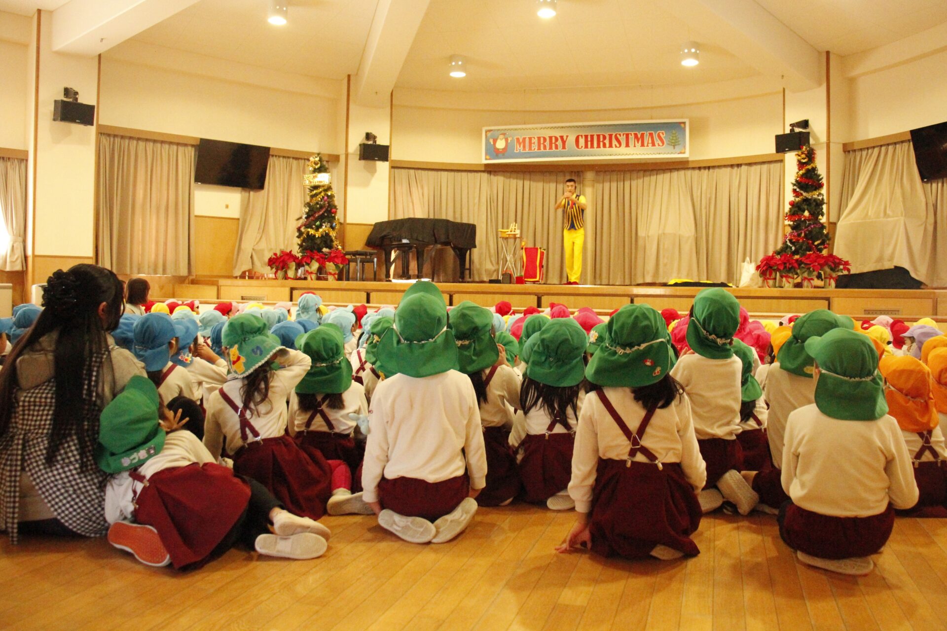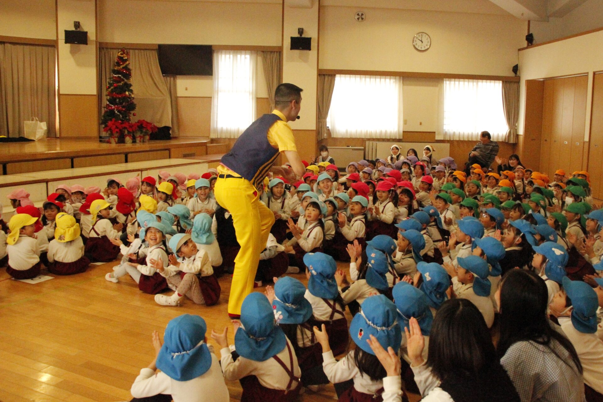 2学期の終業日の12月18日(木)みほ幼稚園ホールにてクリスマス会を行いました。クリスマス会では、パフォーマーの『マジカルおじさん』に楽しいマジックショーをしてもらいました。
