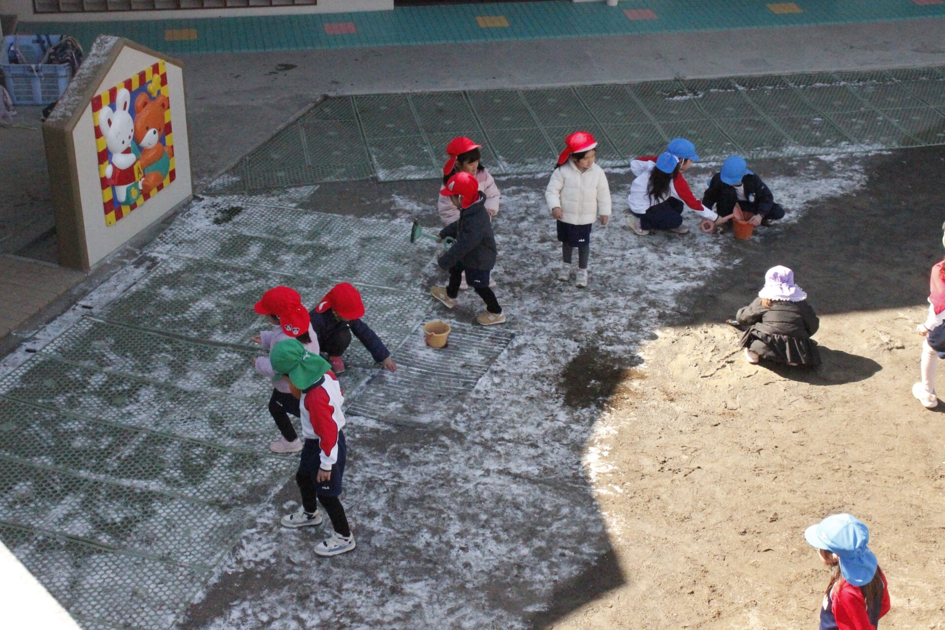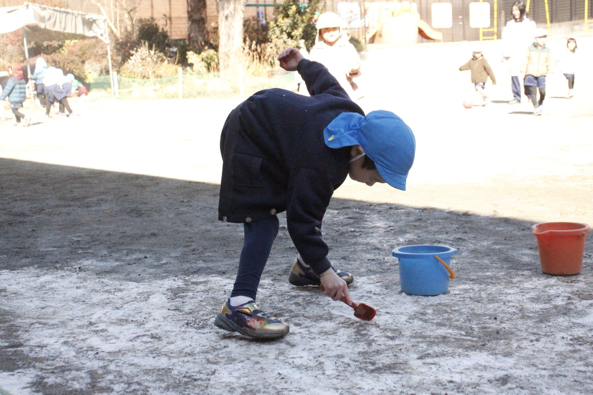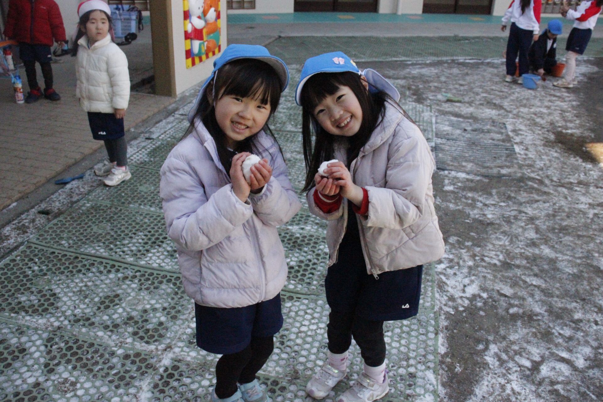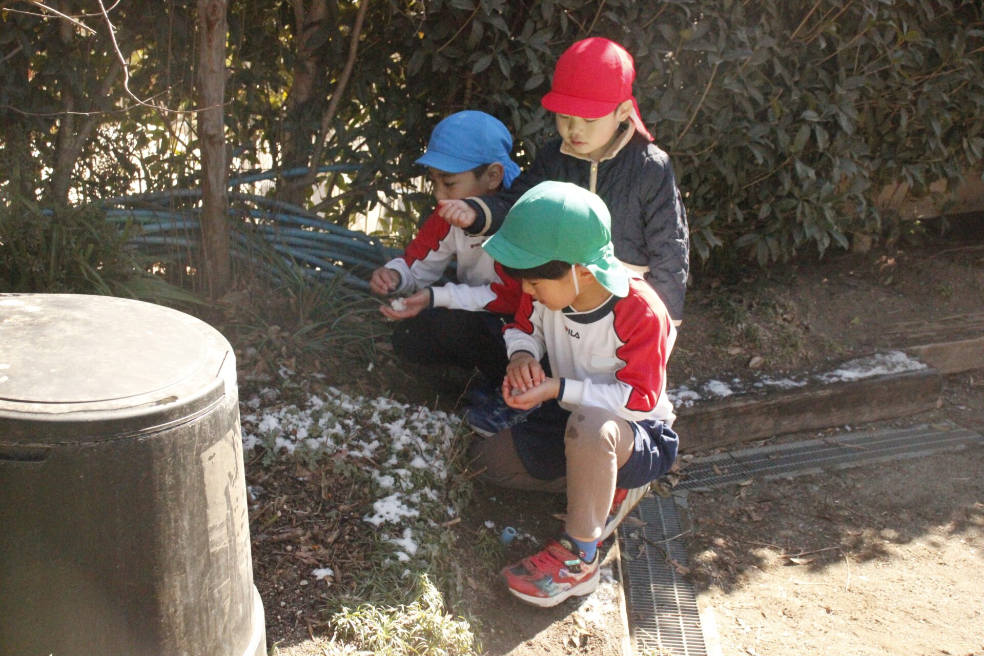 昨日降った雪が園庭の日陰に少しだけ残っていました。子ども達にとっては最高の遊び道具です。園庭では、子ども達が雪や氷集めをして楽しんでる様子が見られました。