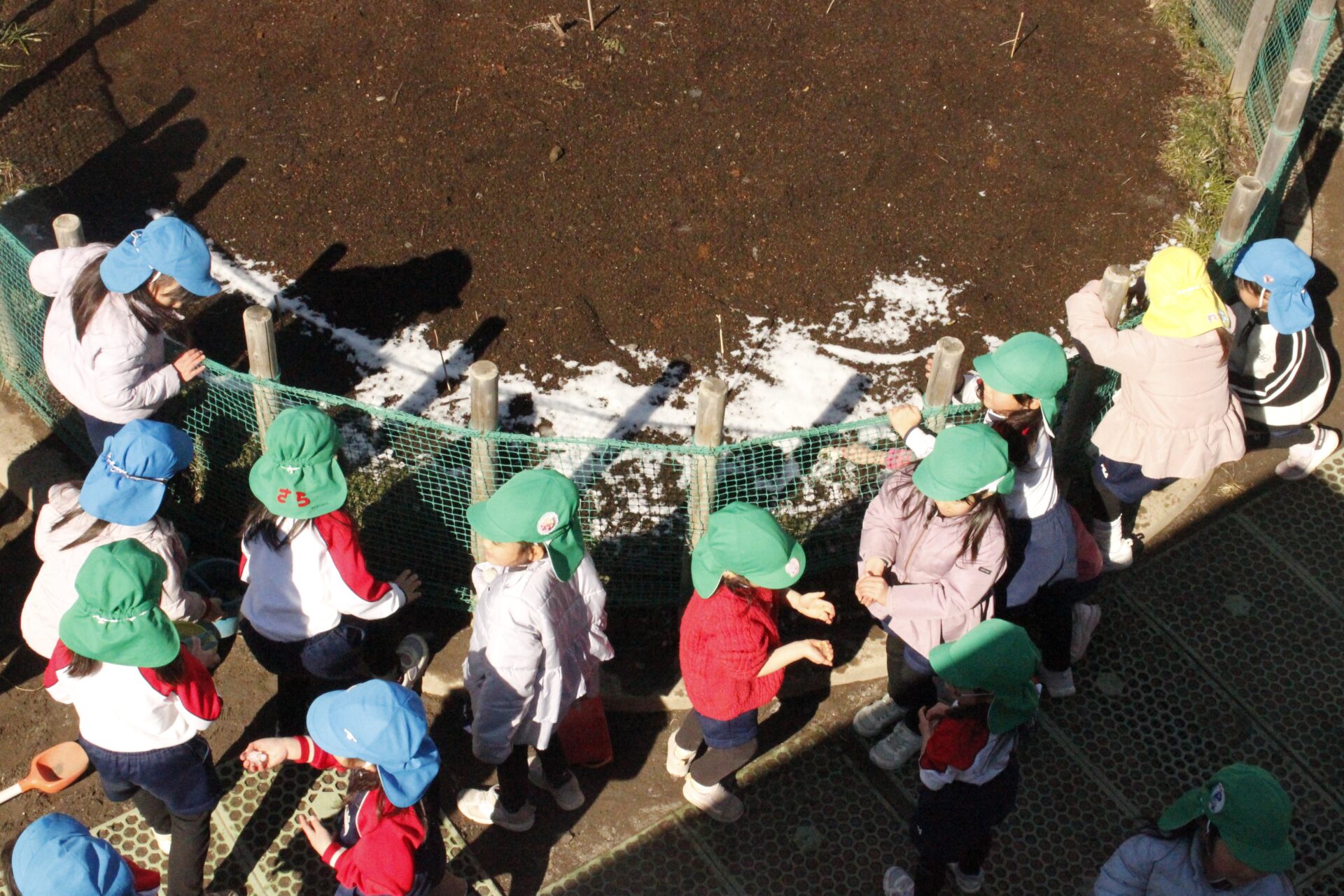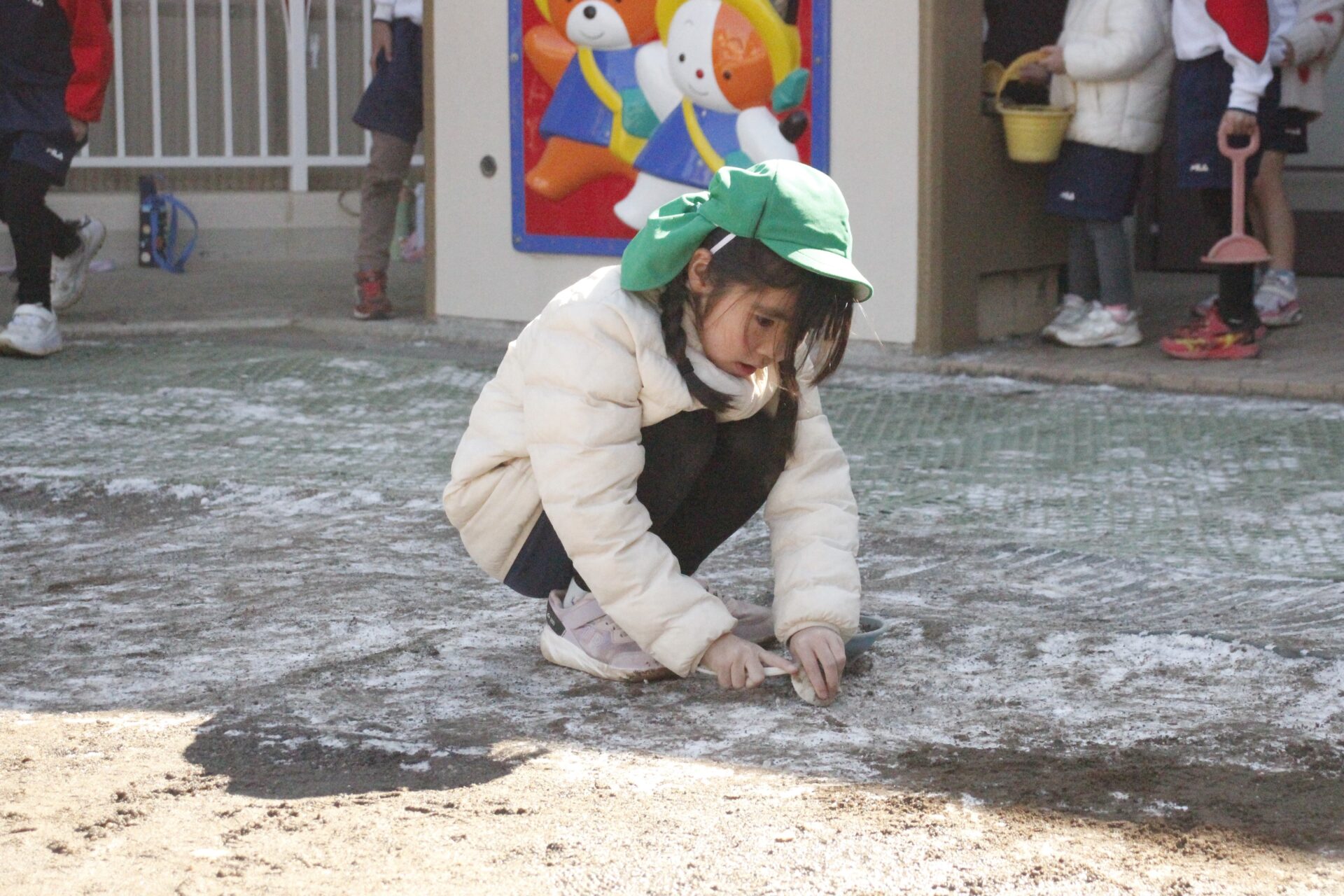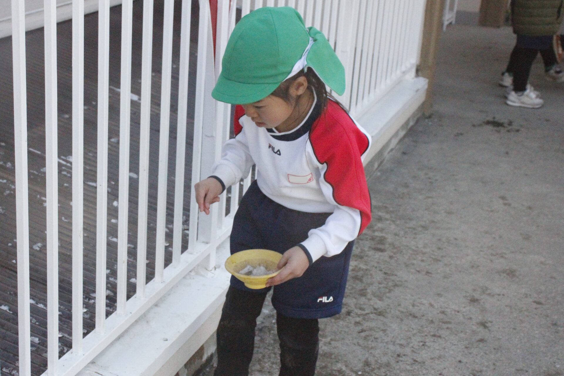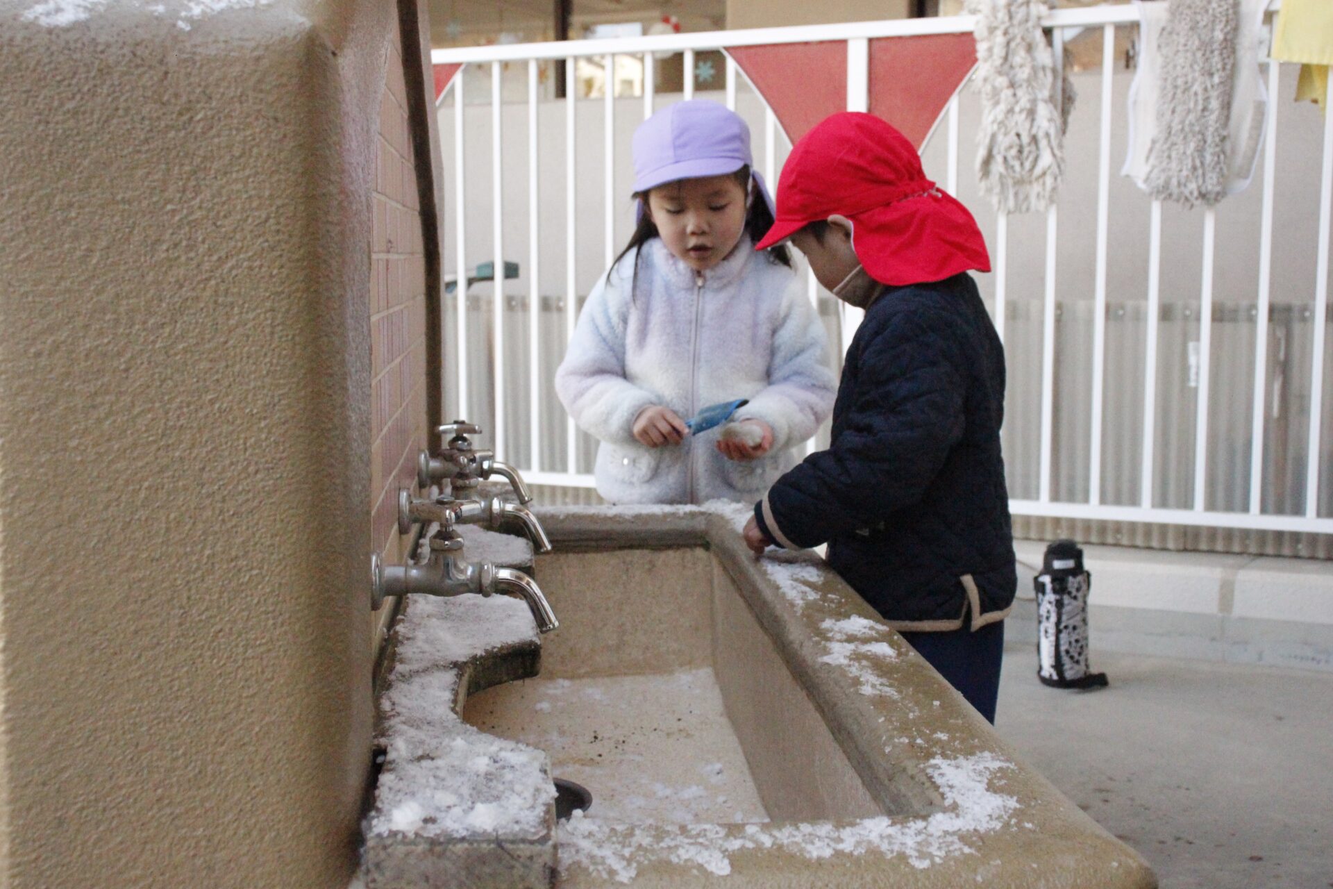 昨日降った雪が園庭の日陰に少しだけ残っていました。子ども達にとっては最高の遊び道具です。園庭では、子ども達が雪や氷集めをして楽しんでる様子が見られました。