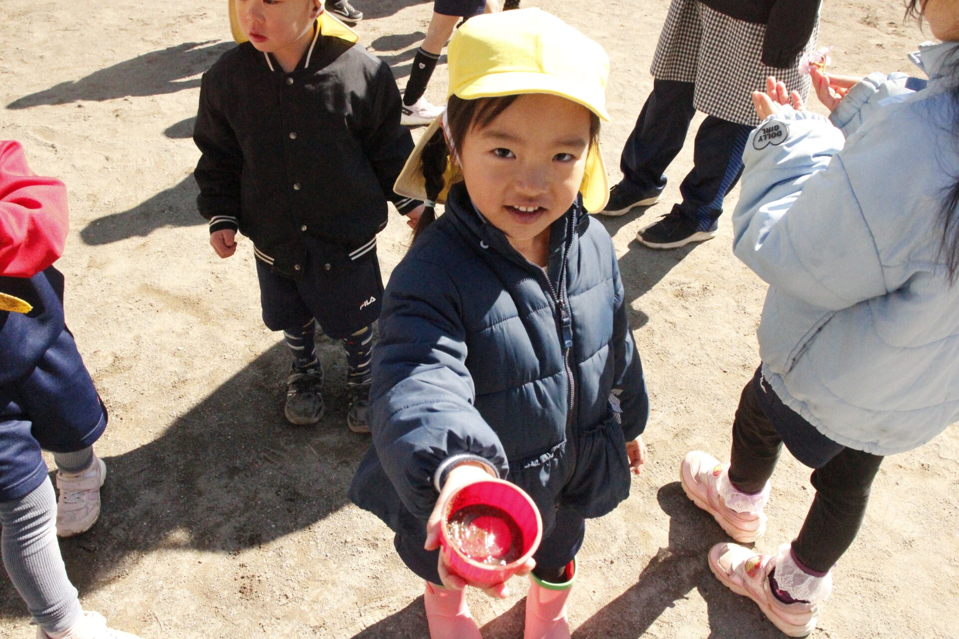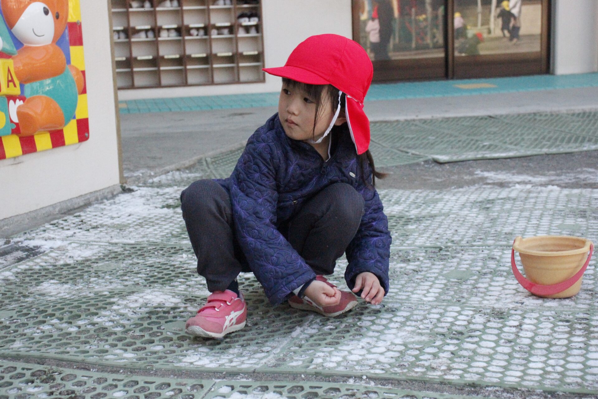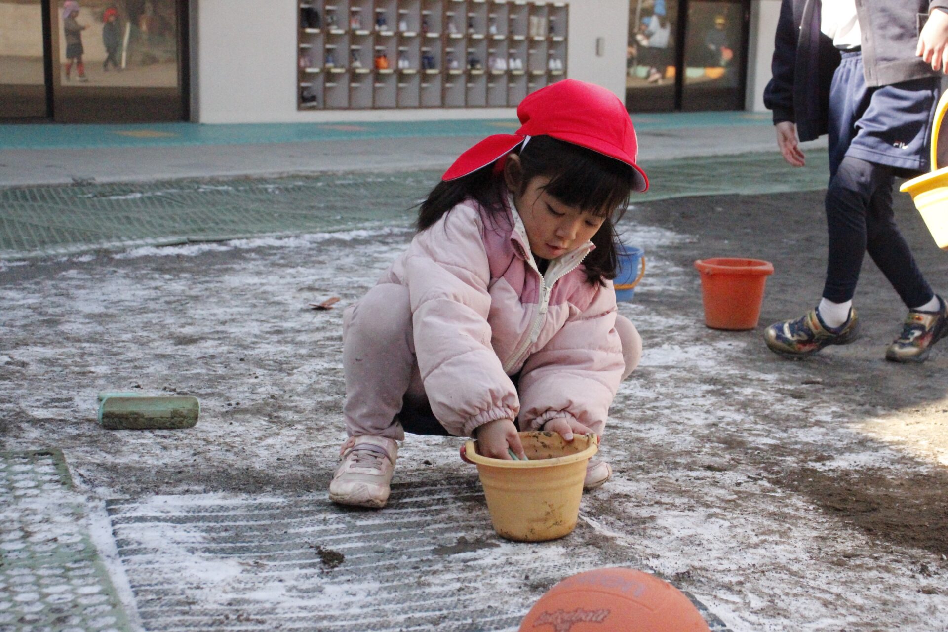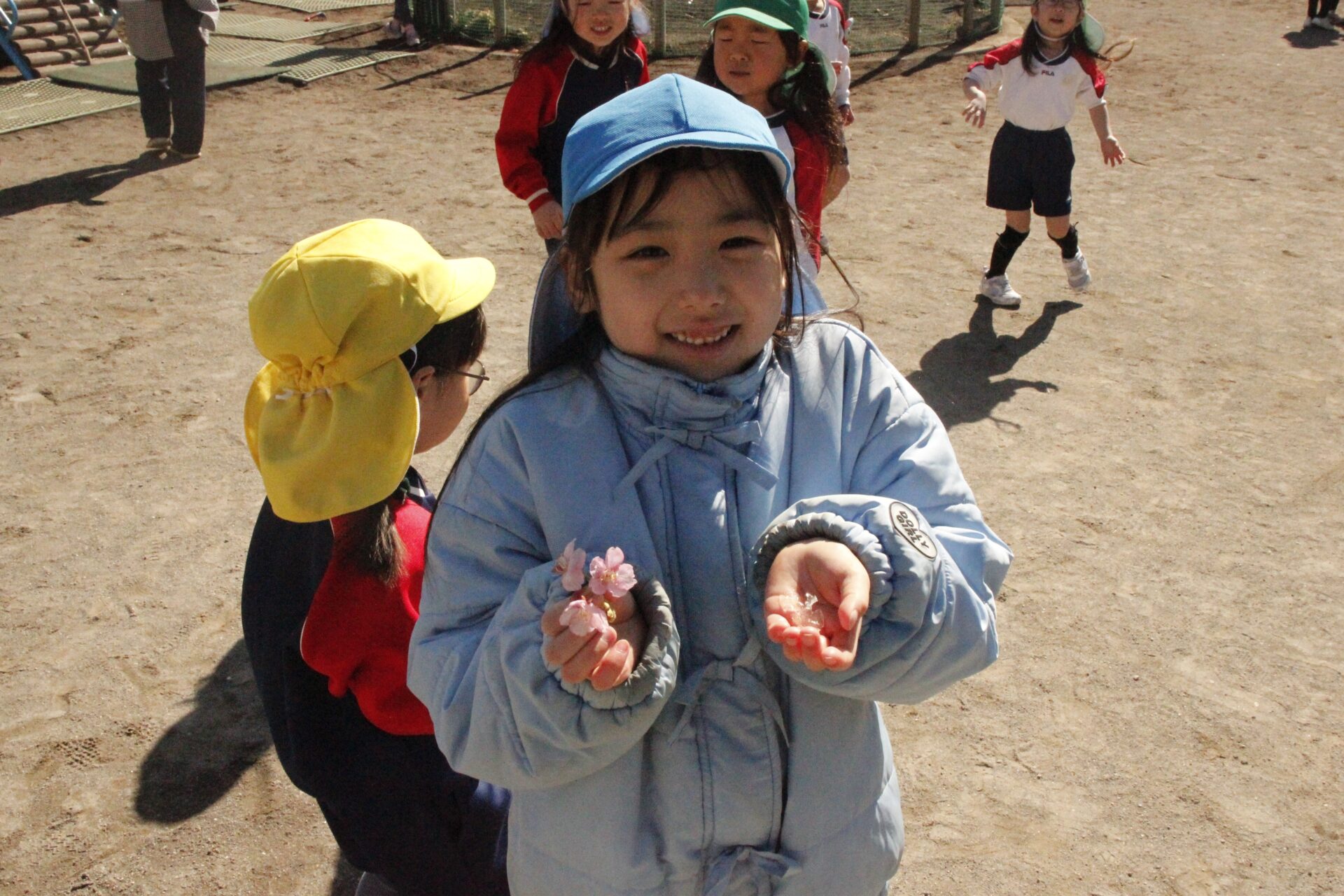 昨日降った雪が園庭の日陰に少しだけ残っていました。子ども達にとっては最高の遊び道具です。園庭では、子ども達が雪や氷集めをして楽しんでる様子が見られました。