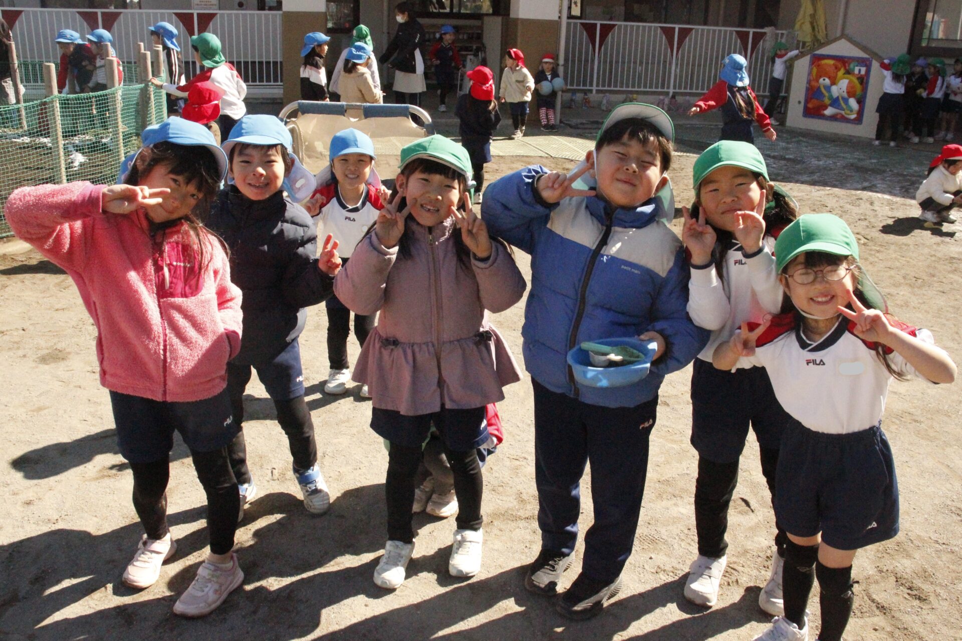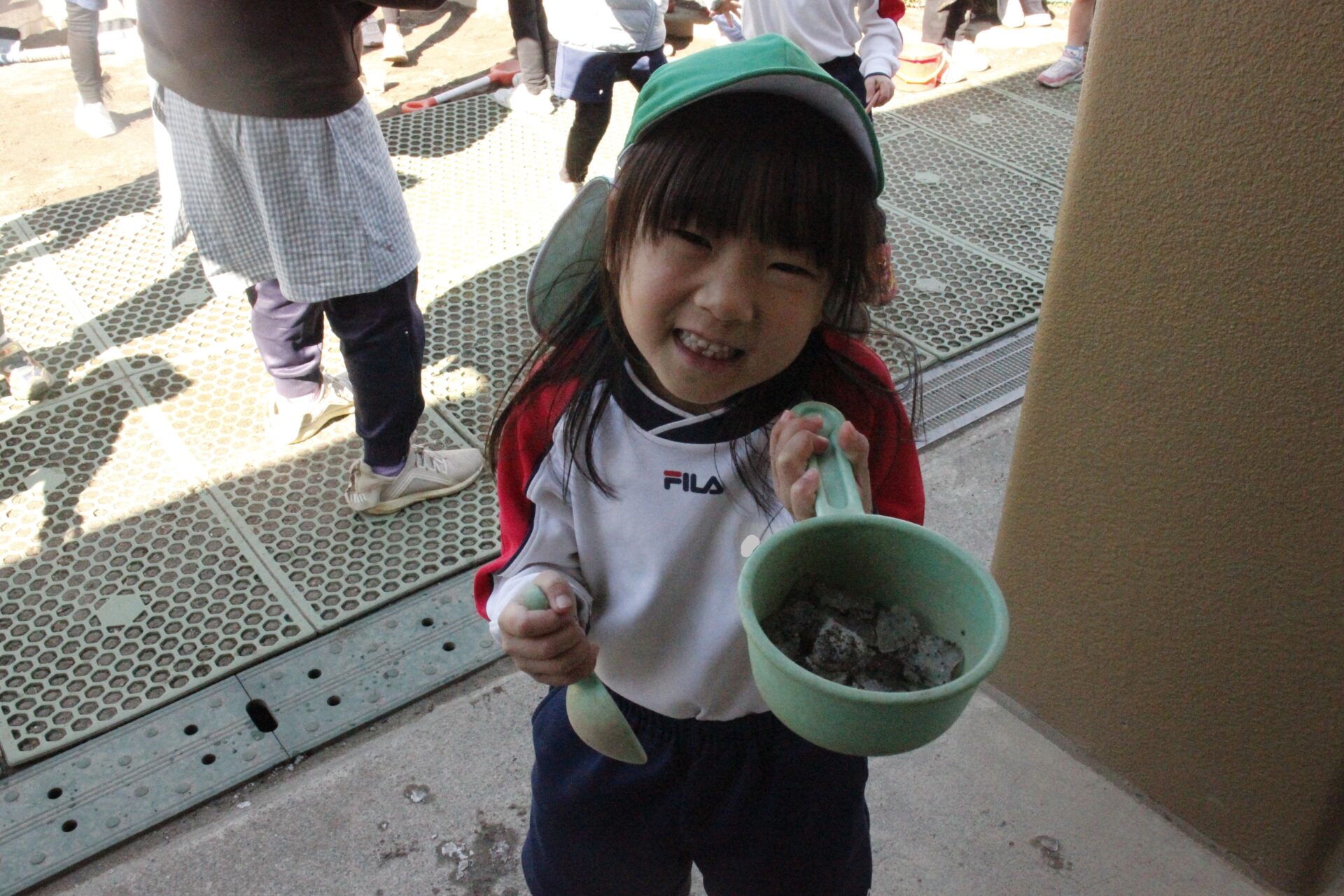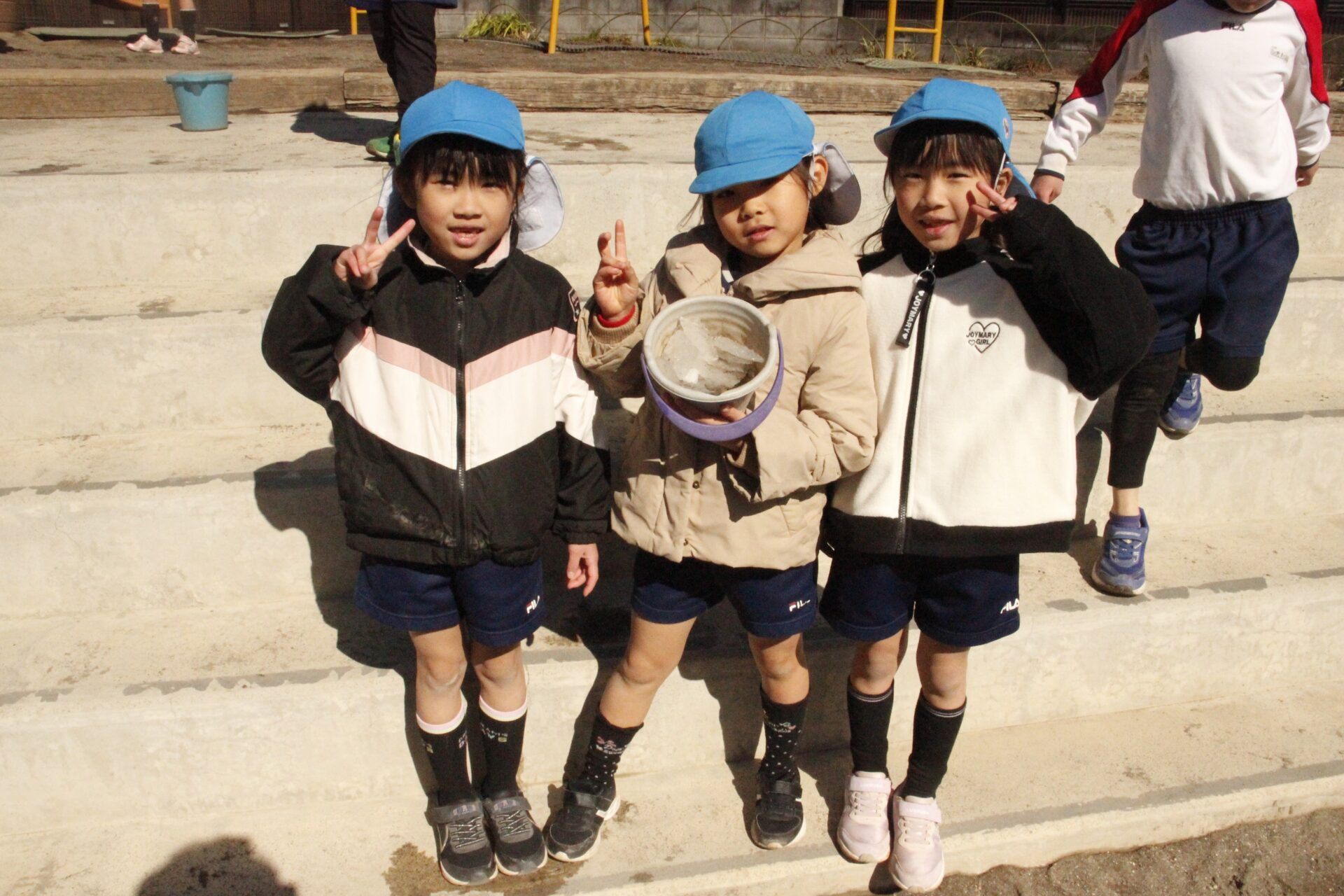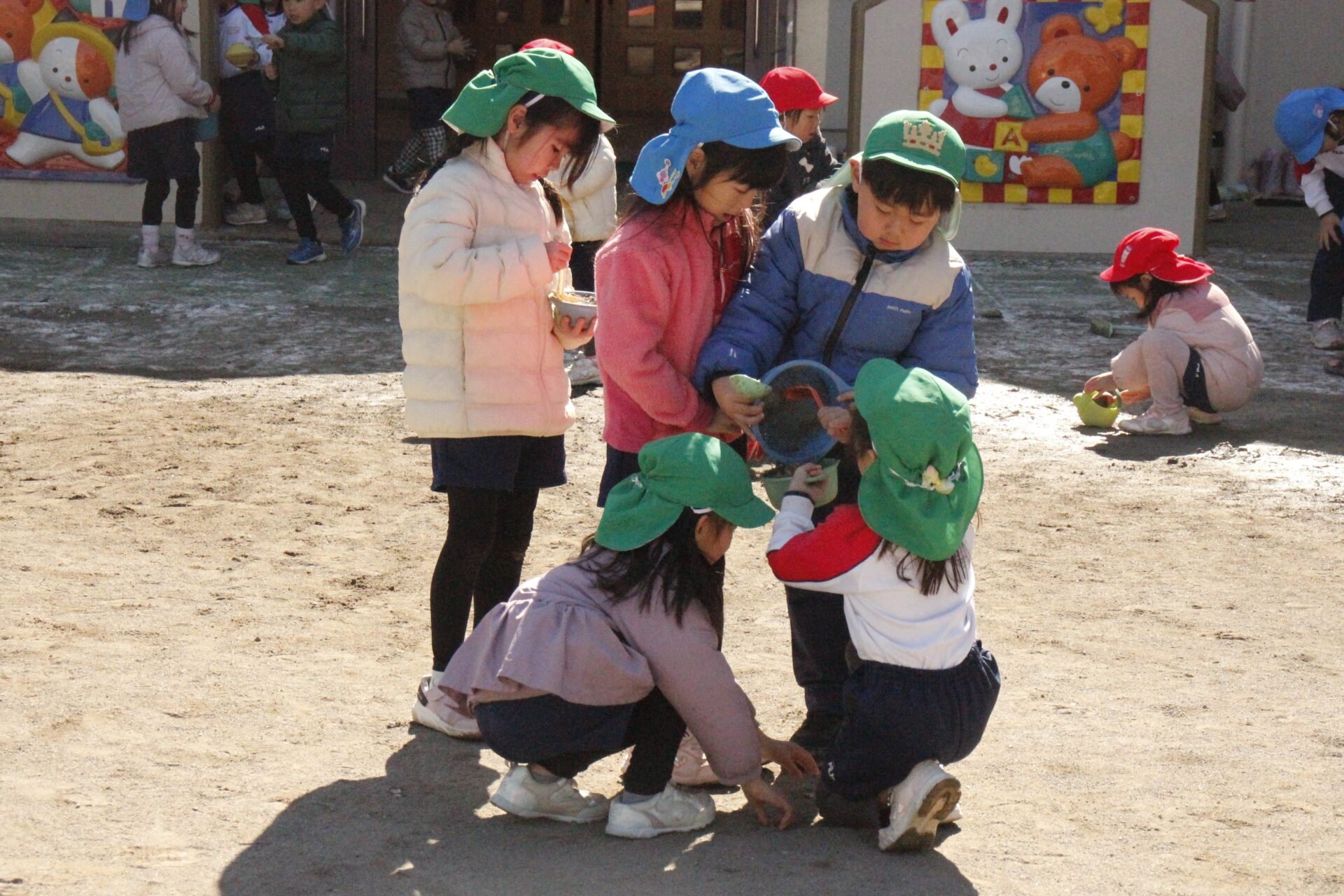 昨日降った雪が園庭の日陰に少しだけ残っていました。子ども達にとっては最高の遊び道具です。園庭では、子ども達が雪や氷集めをして楽しんでる様子が見られました。