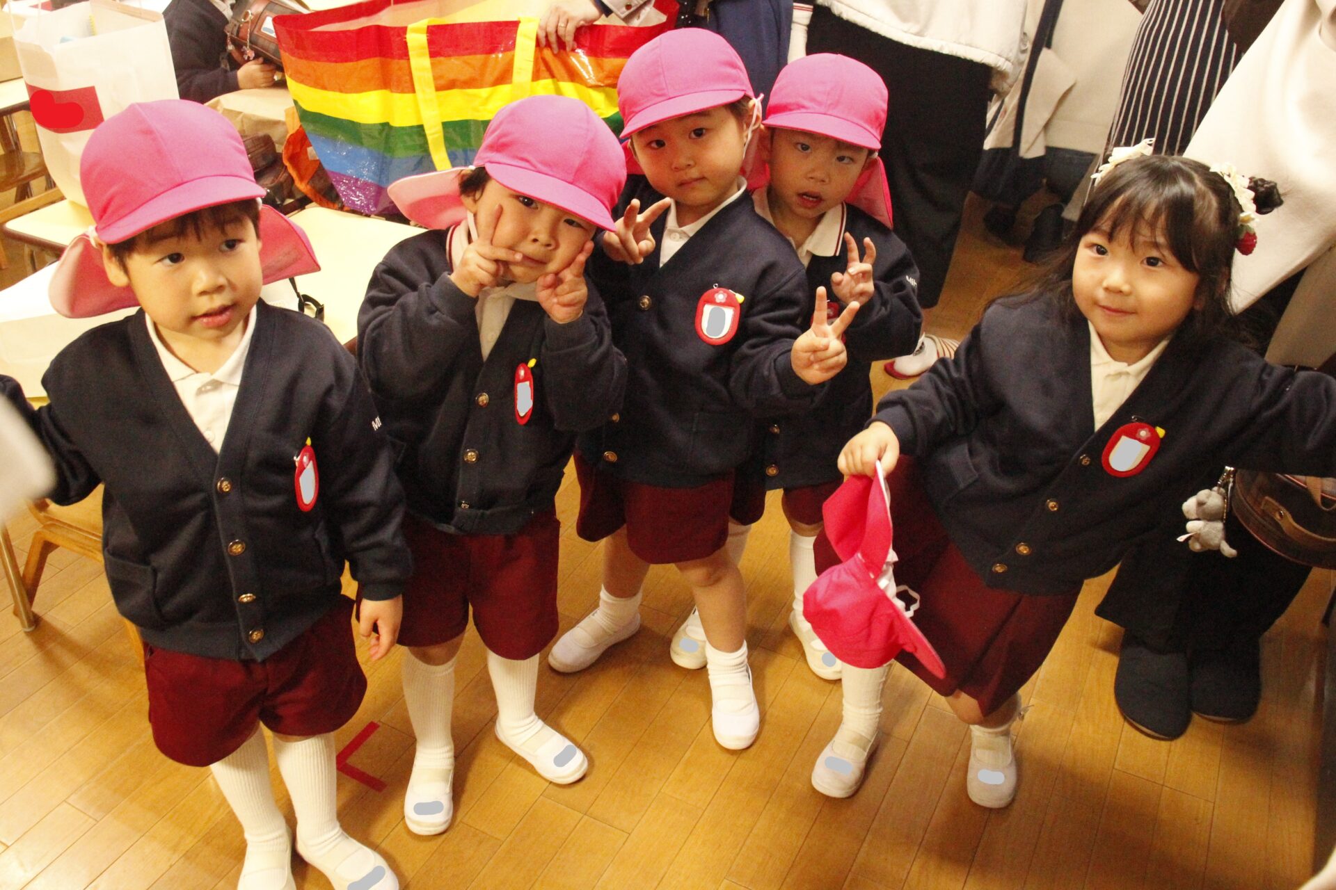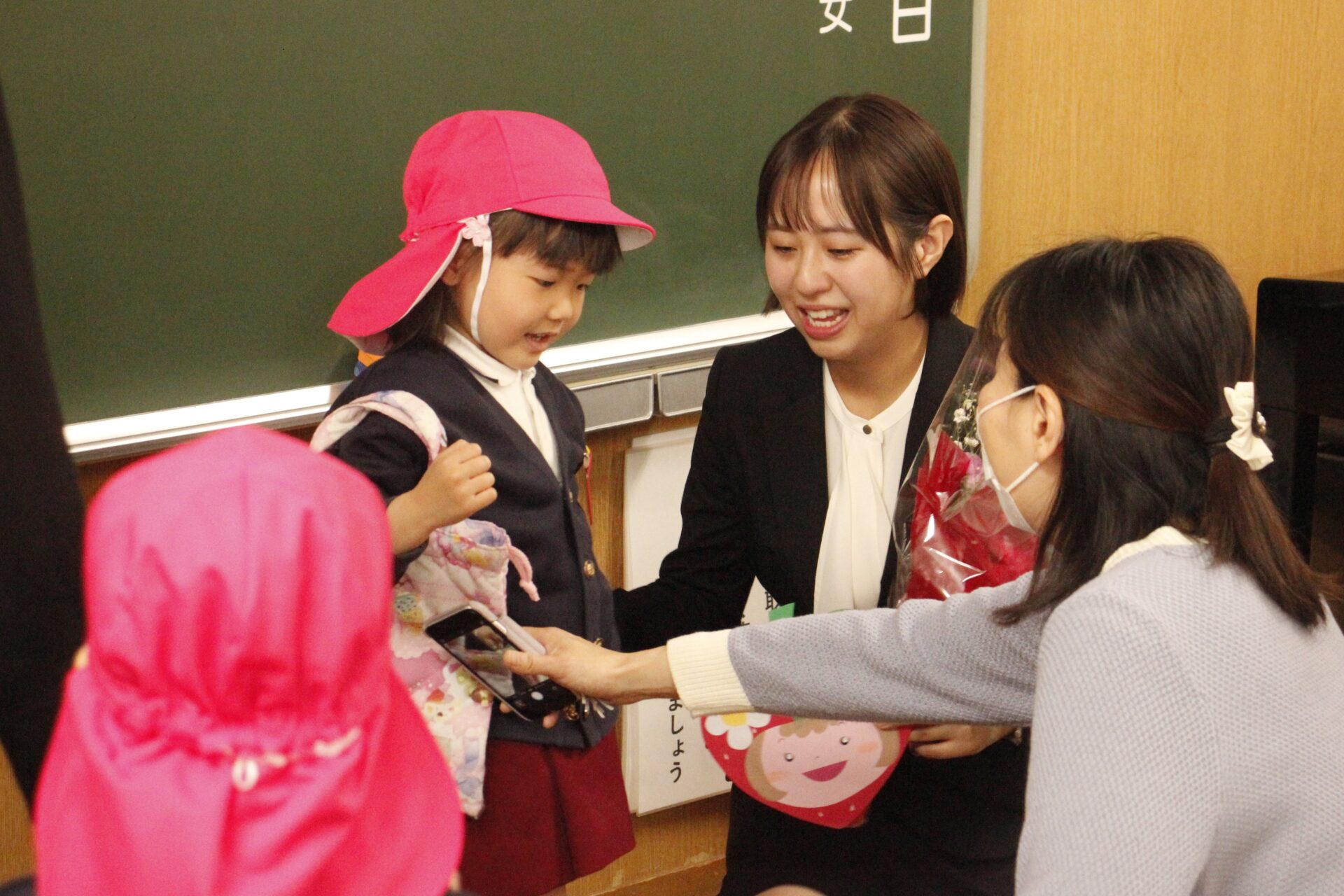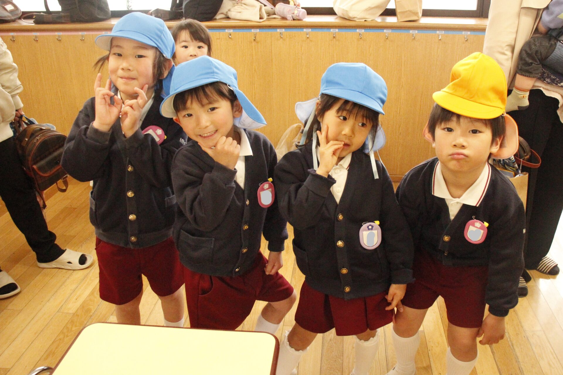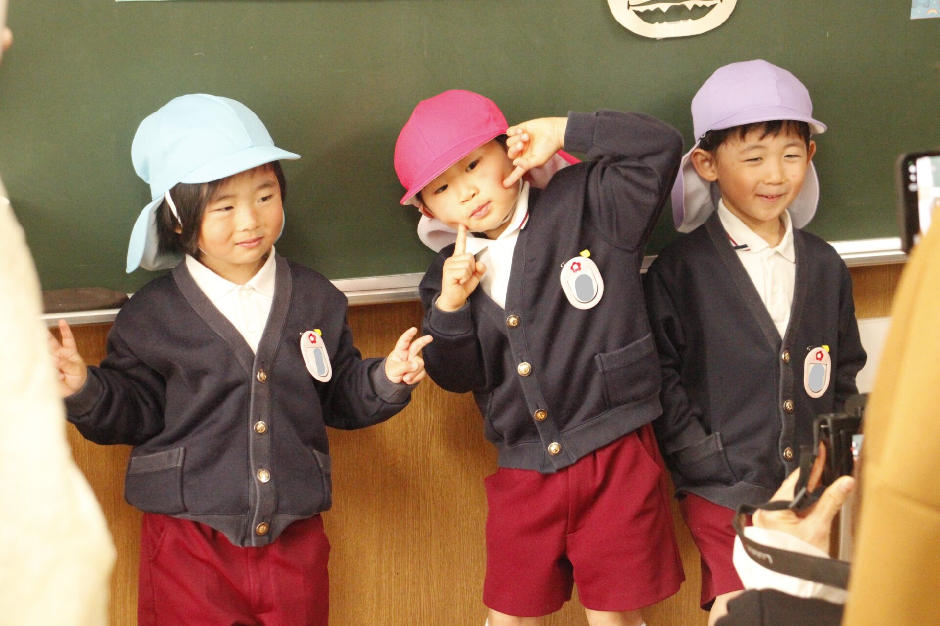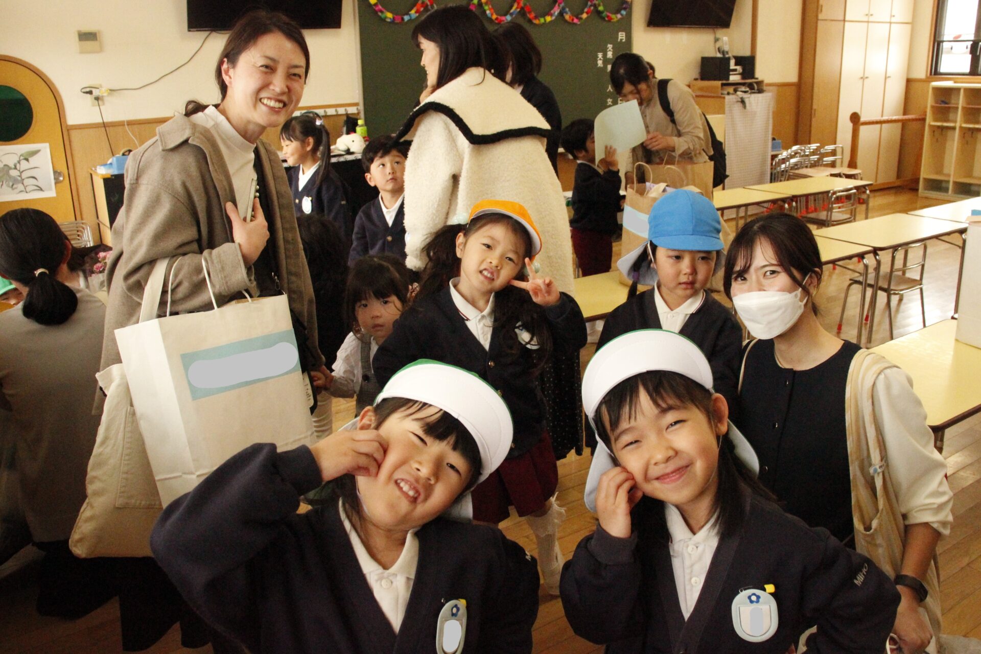 ホールで全員で式を行った後、各教室に戻り、担任より保護者の皆様への一年間の感謝のお気持ちをお伝えさせていただきました。また、来年度のクラス発表も行い、新しい学年のクラスカラーの帽子をかぶり、誇らしげにしている子ども達の姿からは、進級への期待と喜びが溢れていました。