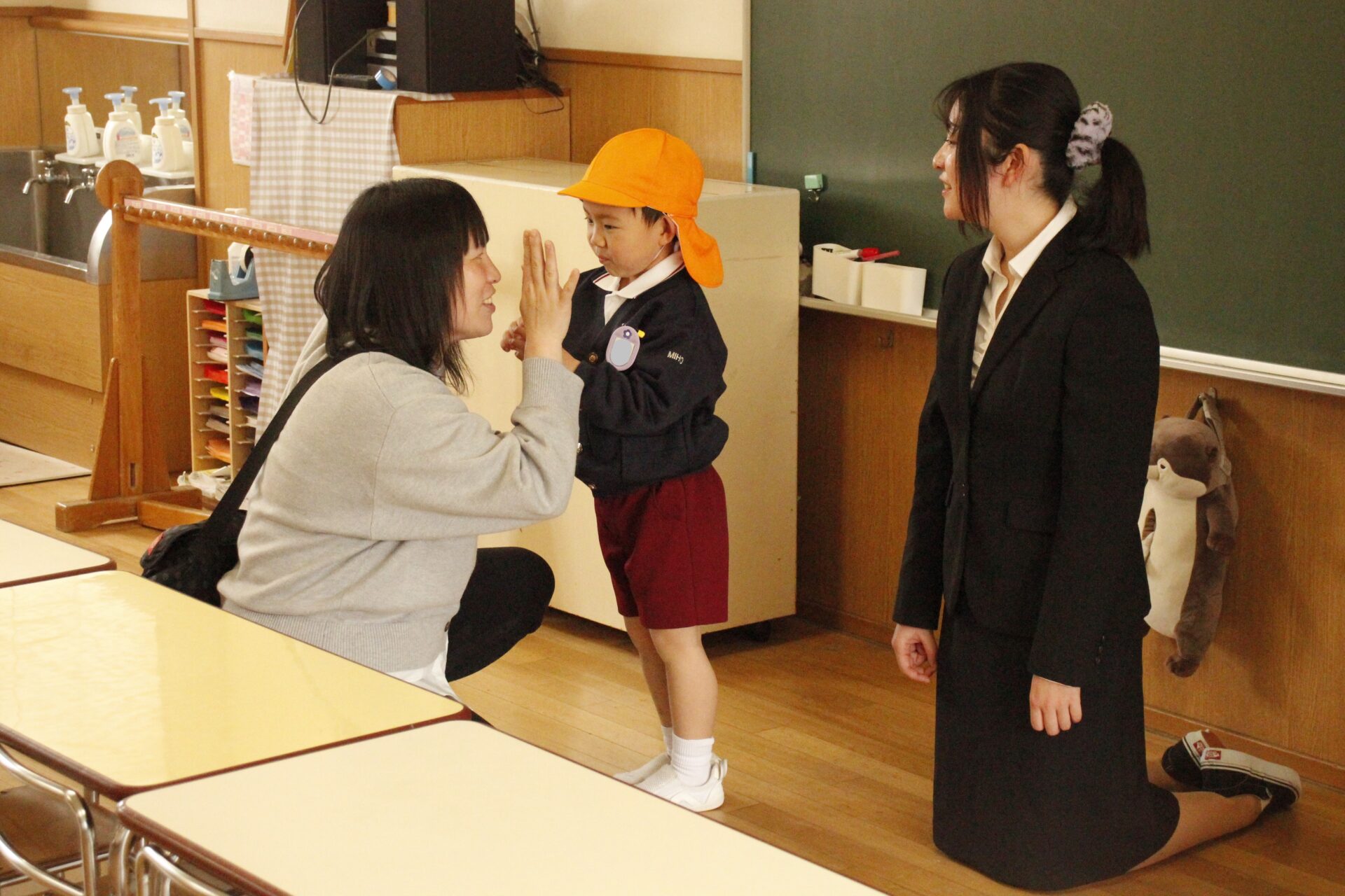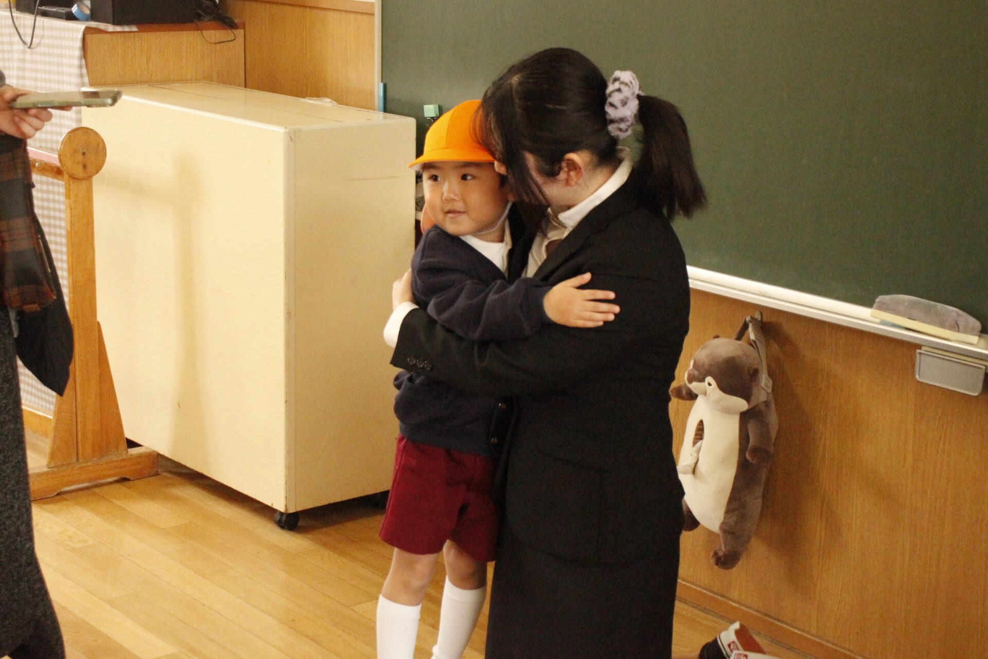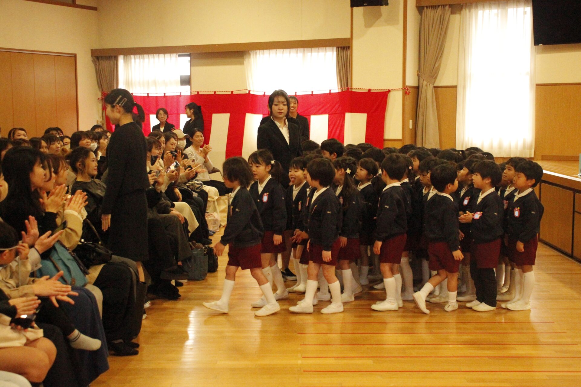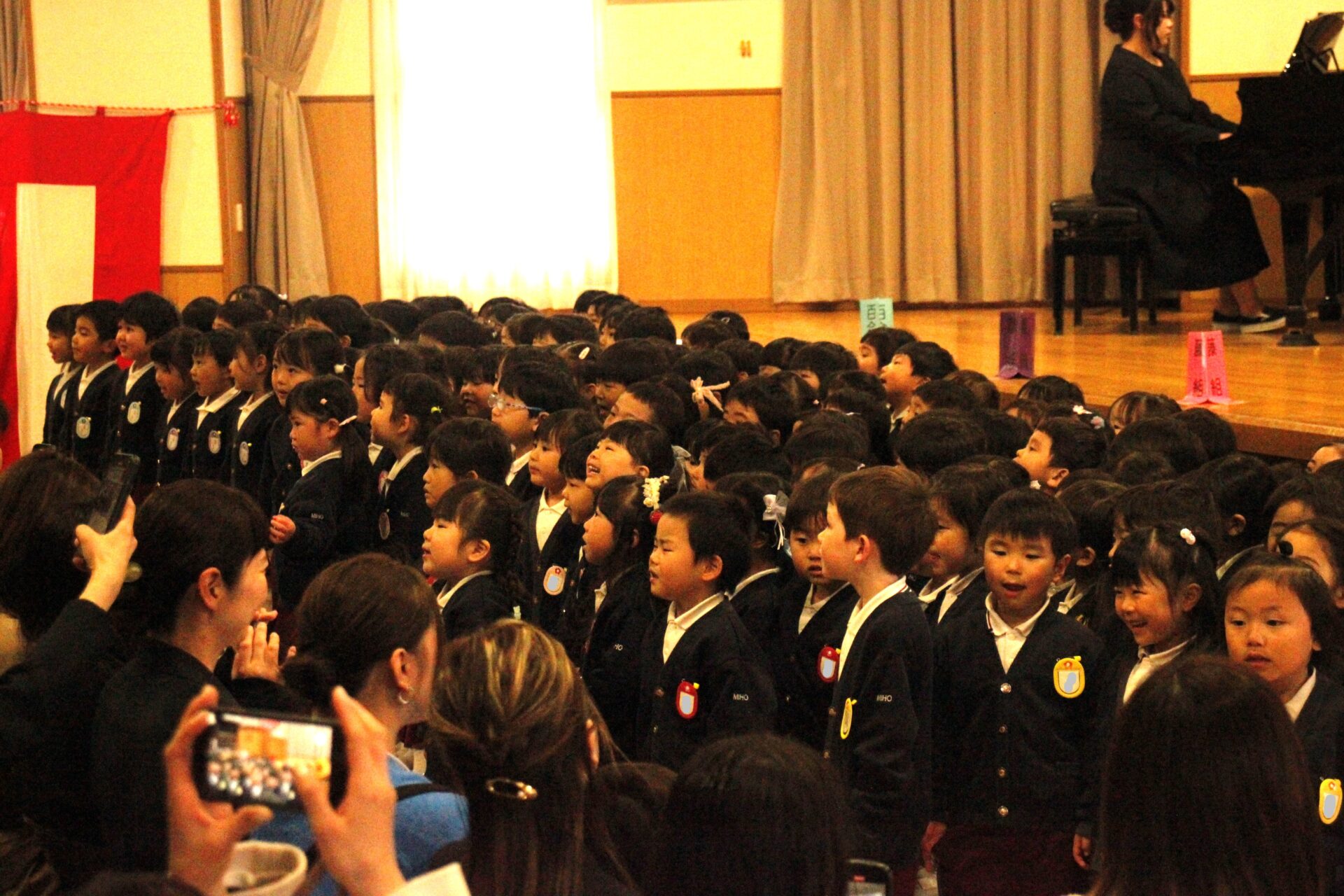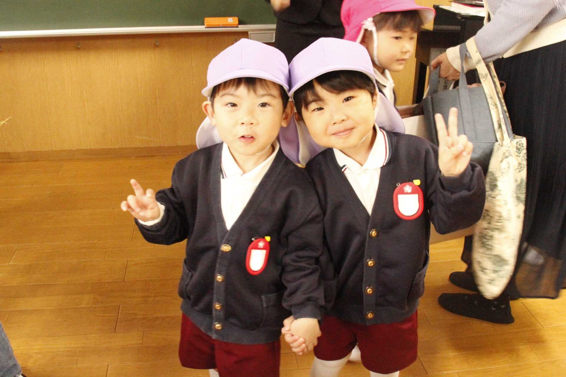 ホールで全員で式を行った後、各教室に戻り、担任より保護者の皆様への一年間の感謝のお気持ちをお伝えさせていただきました。また、来年度のクラス発表も行い、新しい学年のクラスカラーの帽子をかぶり、誇らしげにしている子ども達の姿からは、進級への期待と喜びが溢れていました。